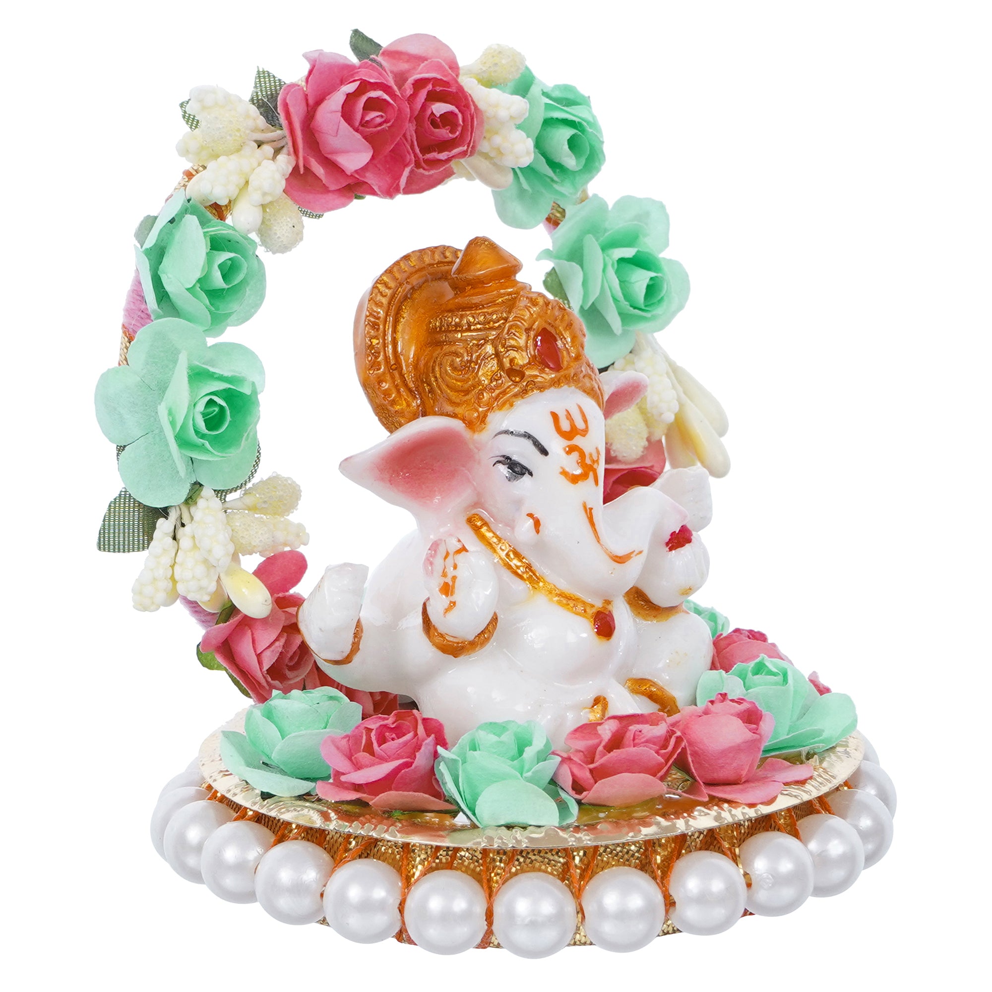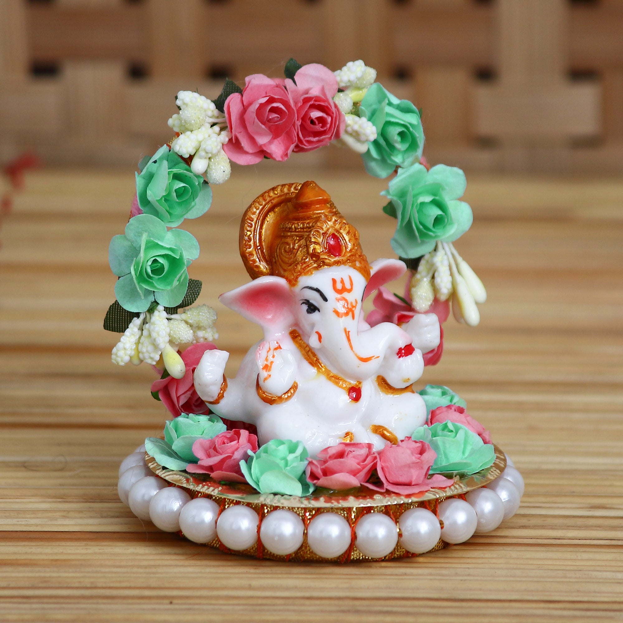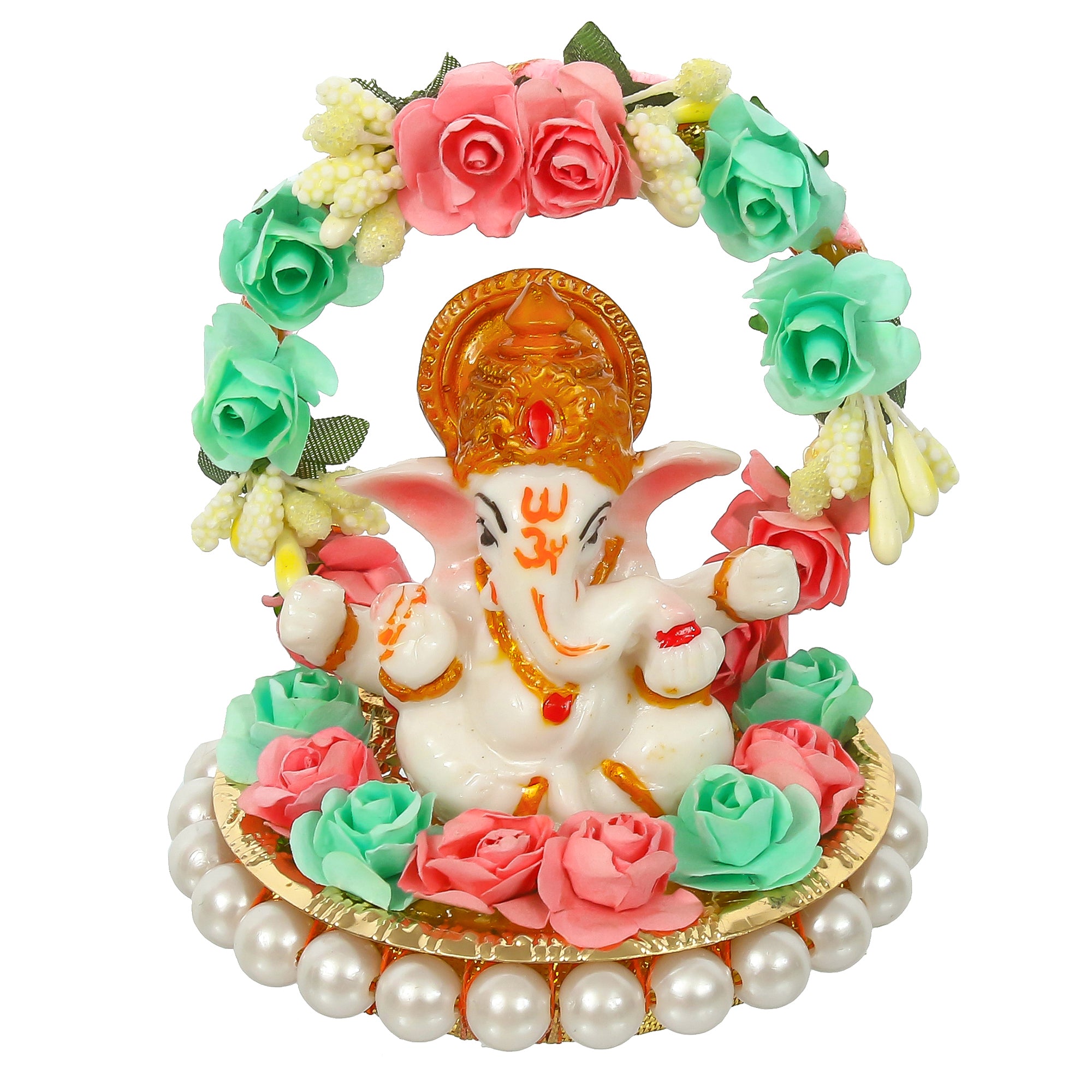 Package Content - One Lord Ganesha Idol on Decorative Handcrafted Plate with Throne of Pink and Green Flowers