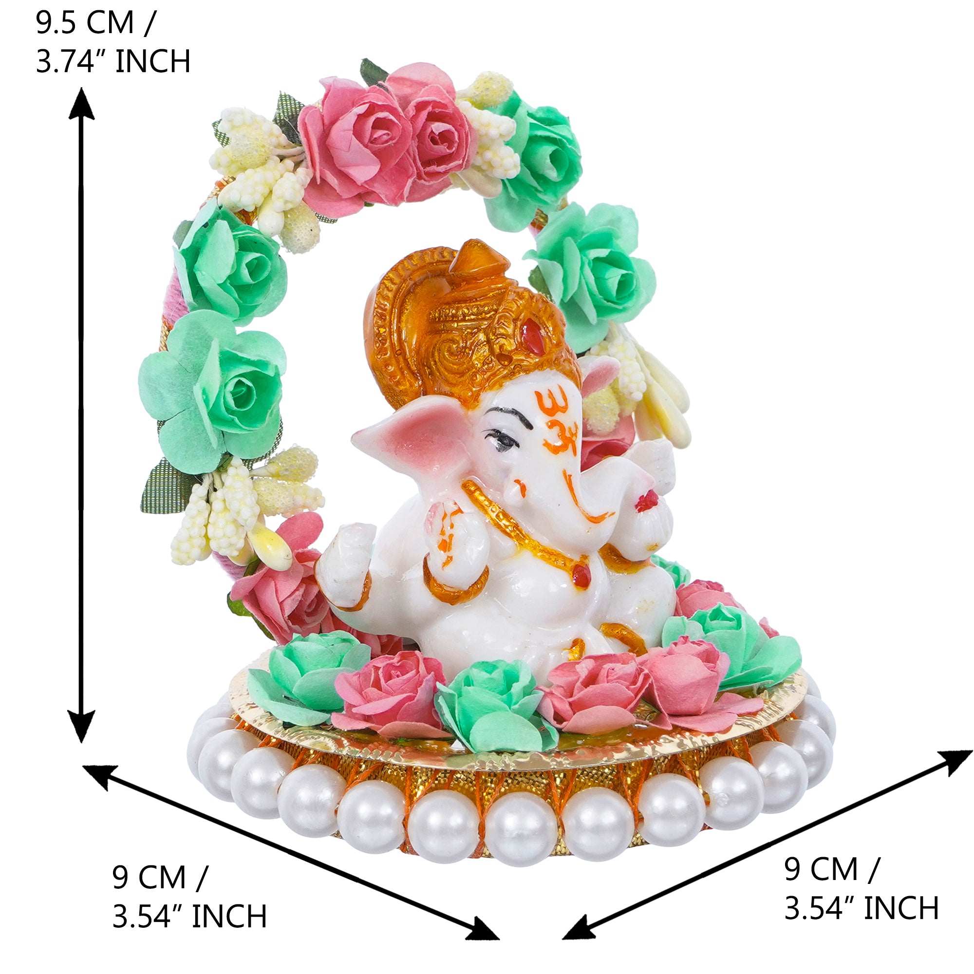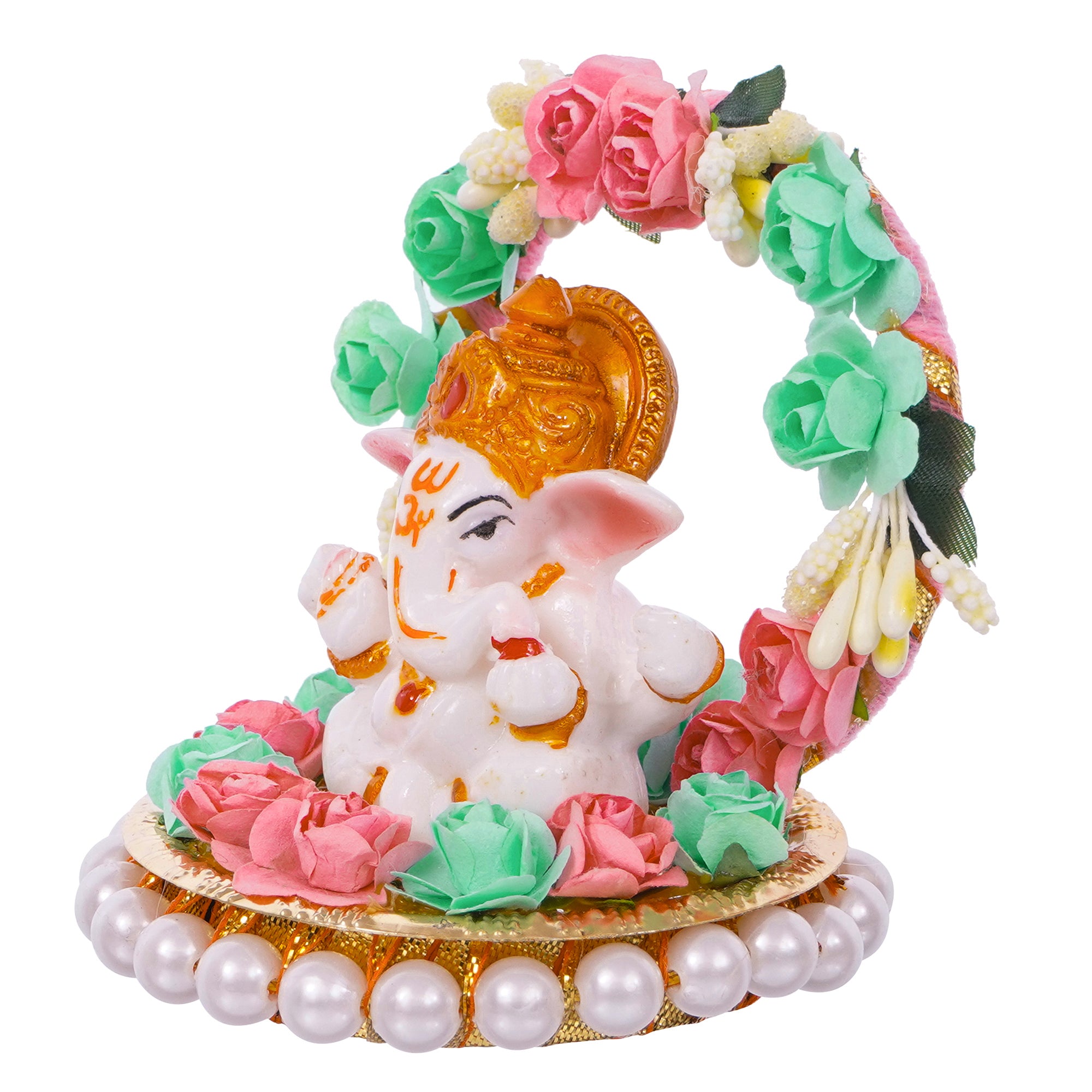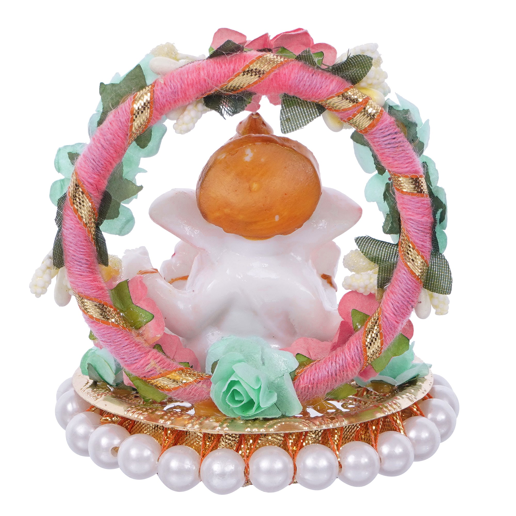 Package Content - One Lord Ganesha Idol on Decorative Handcrafted Plate with Throne of Pink and Green Flowers