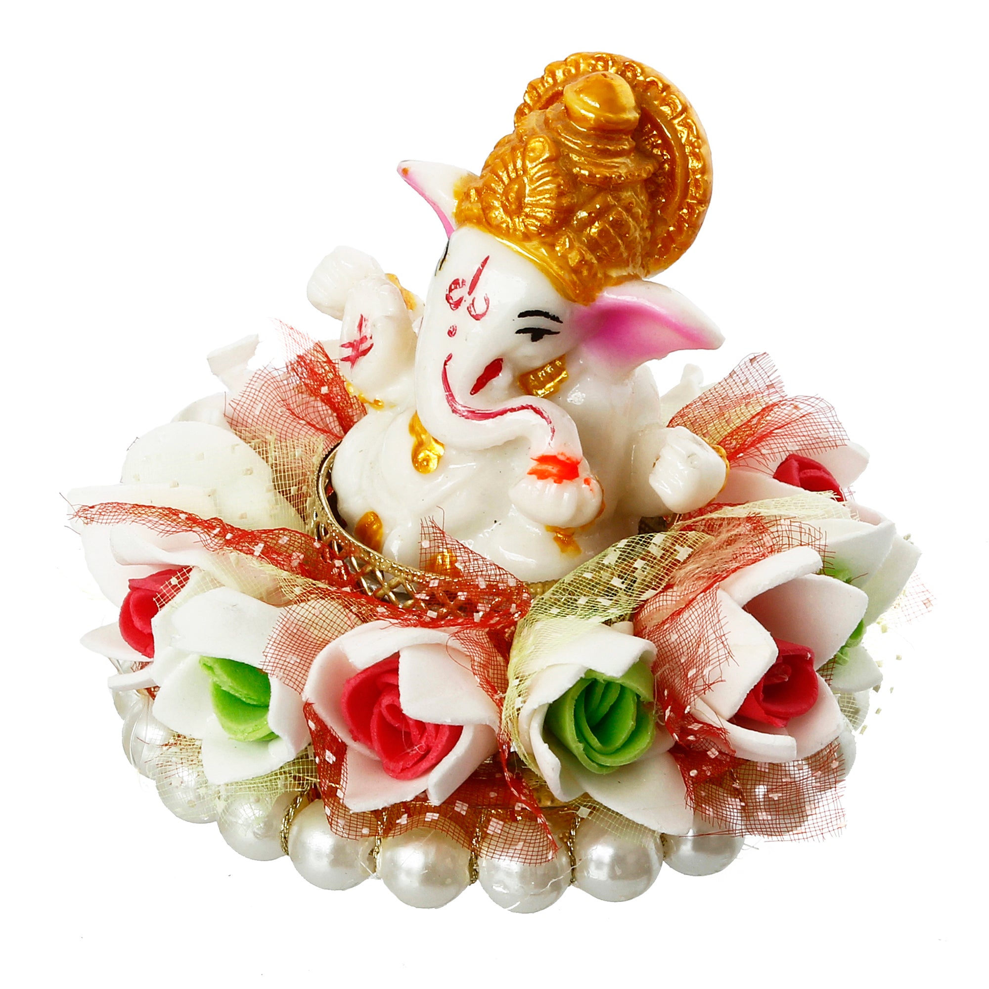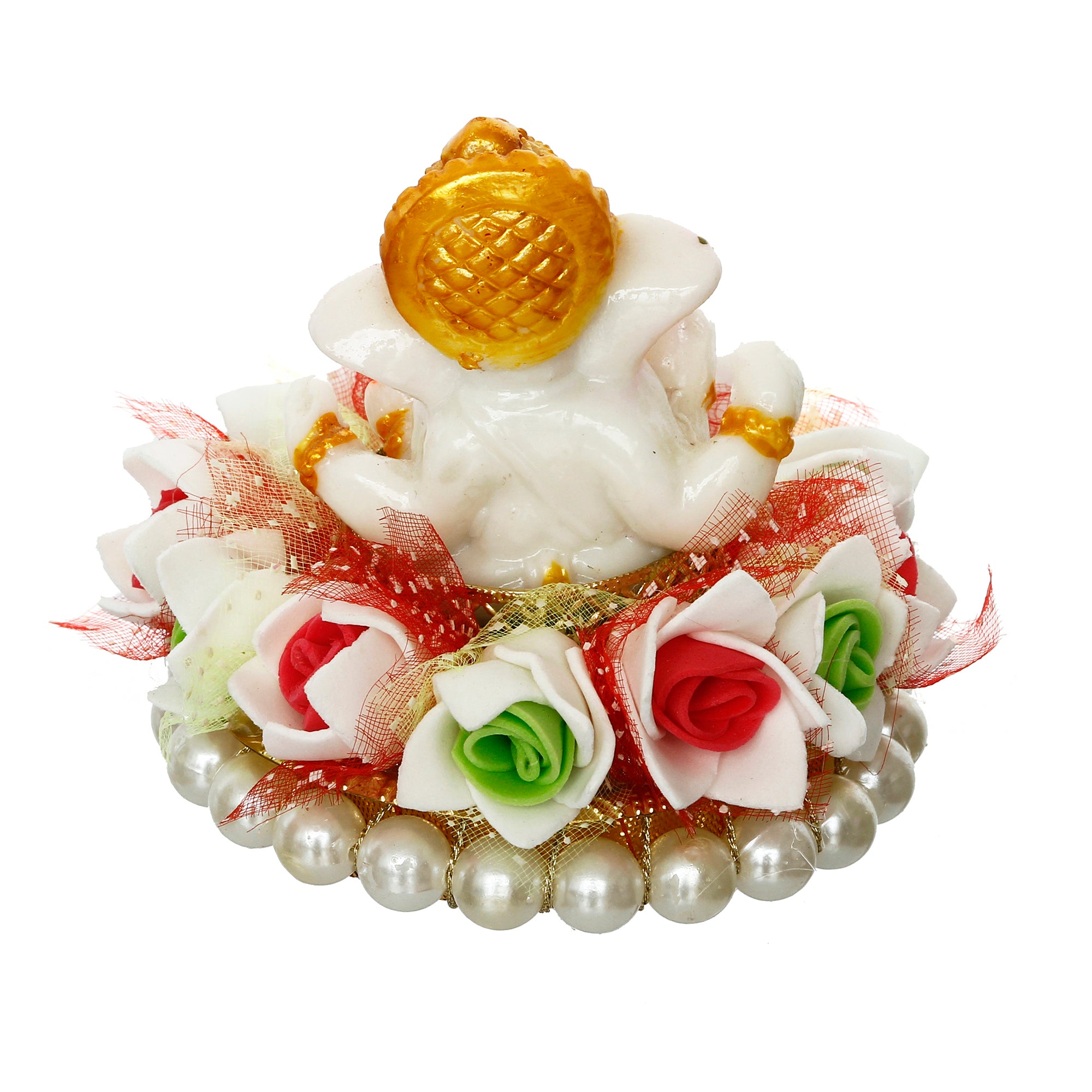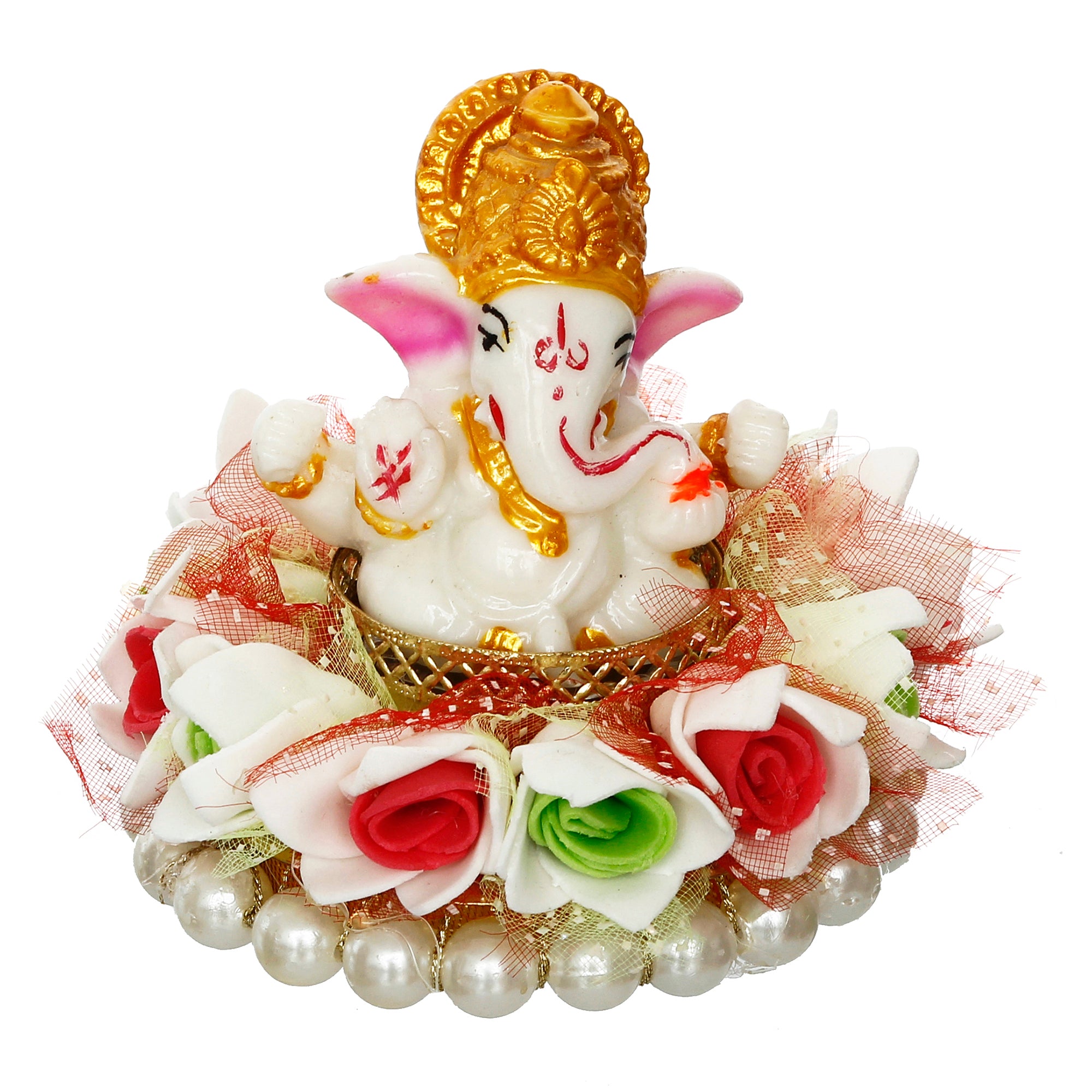 Package Content - One Lord Ganesha Idol on Floral and Pearl Decorative Handcrafted Singhasan for Home/Temple/Office/Car Dashboard