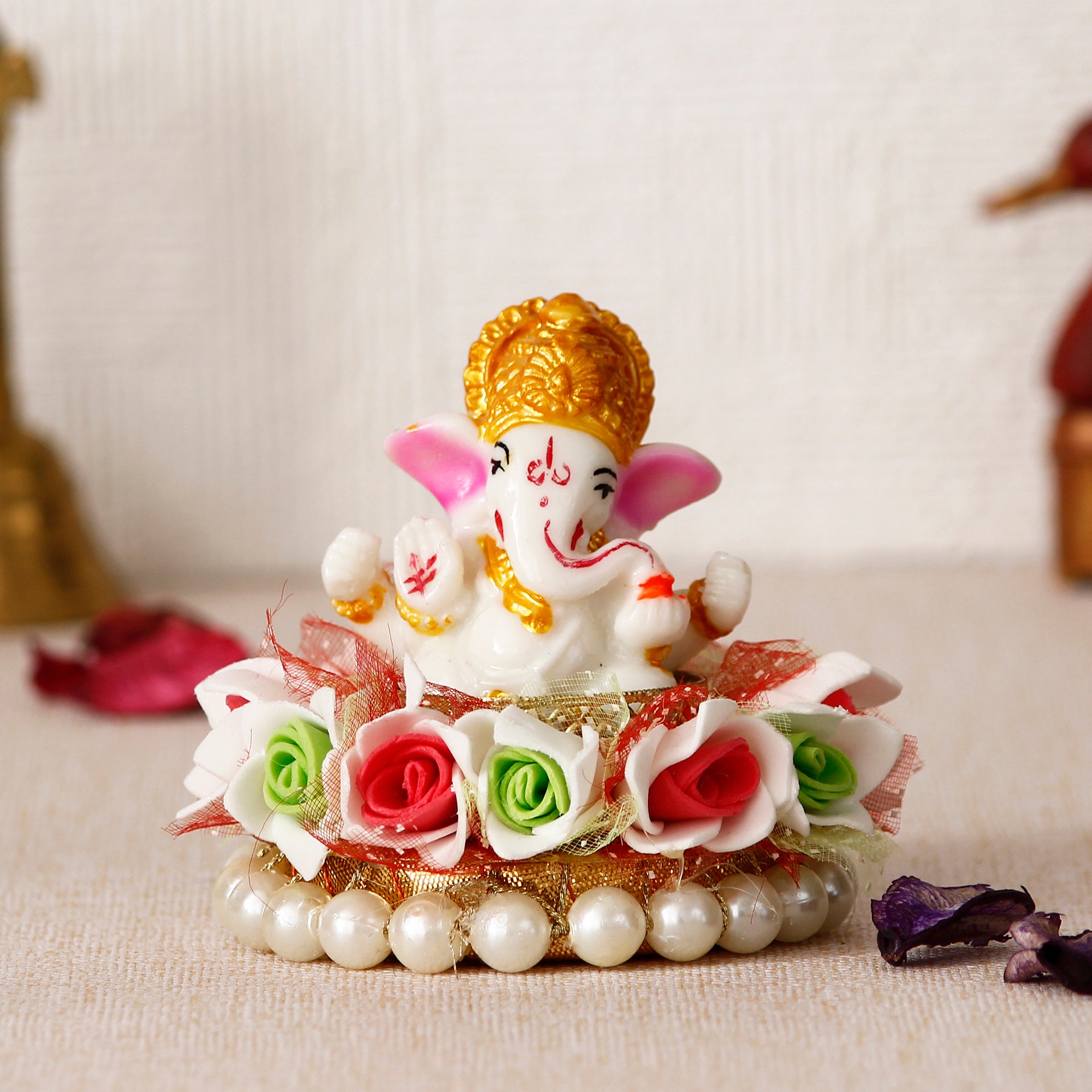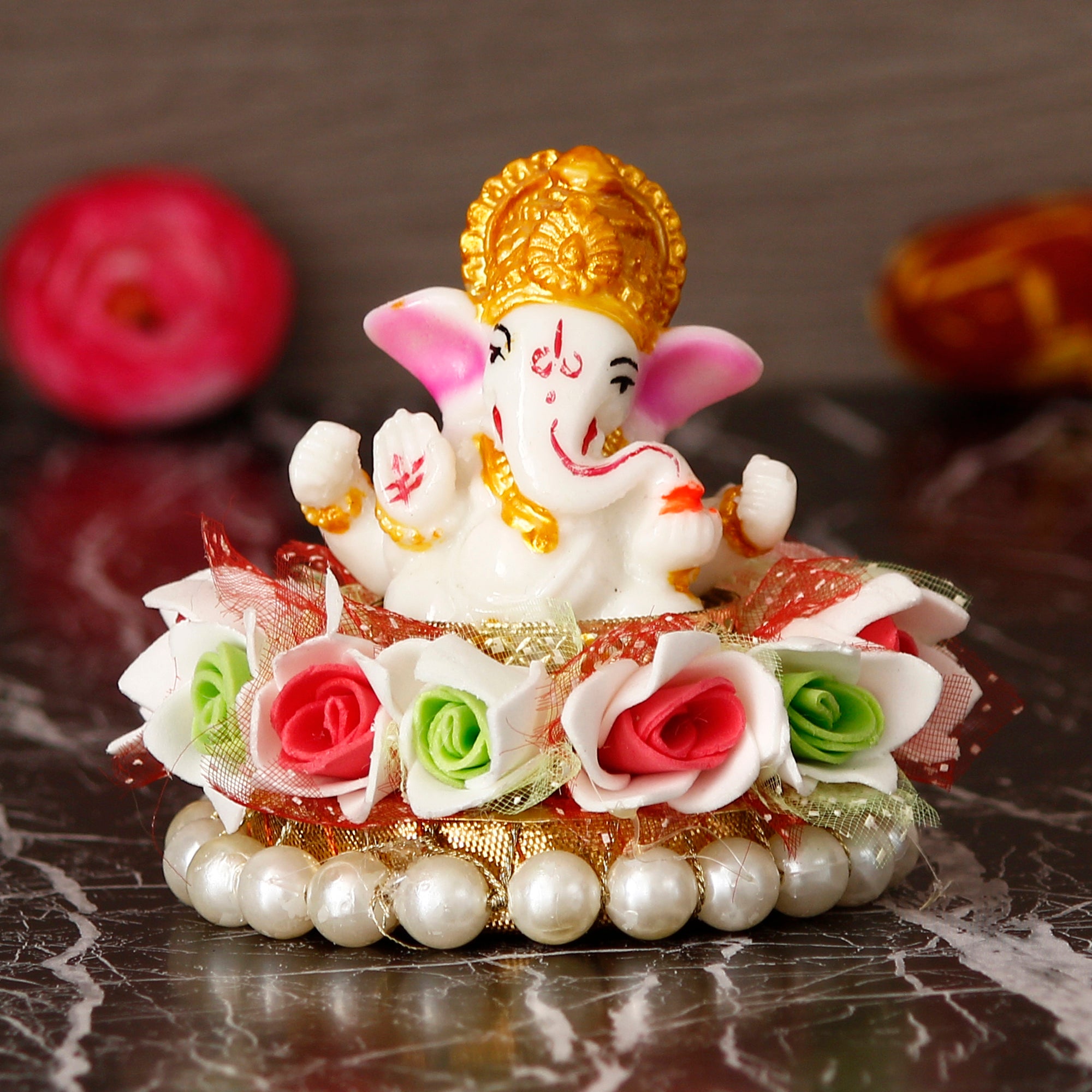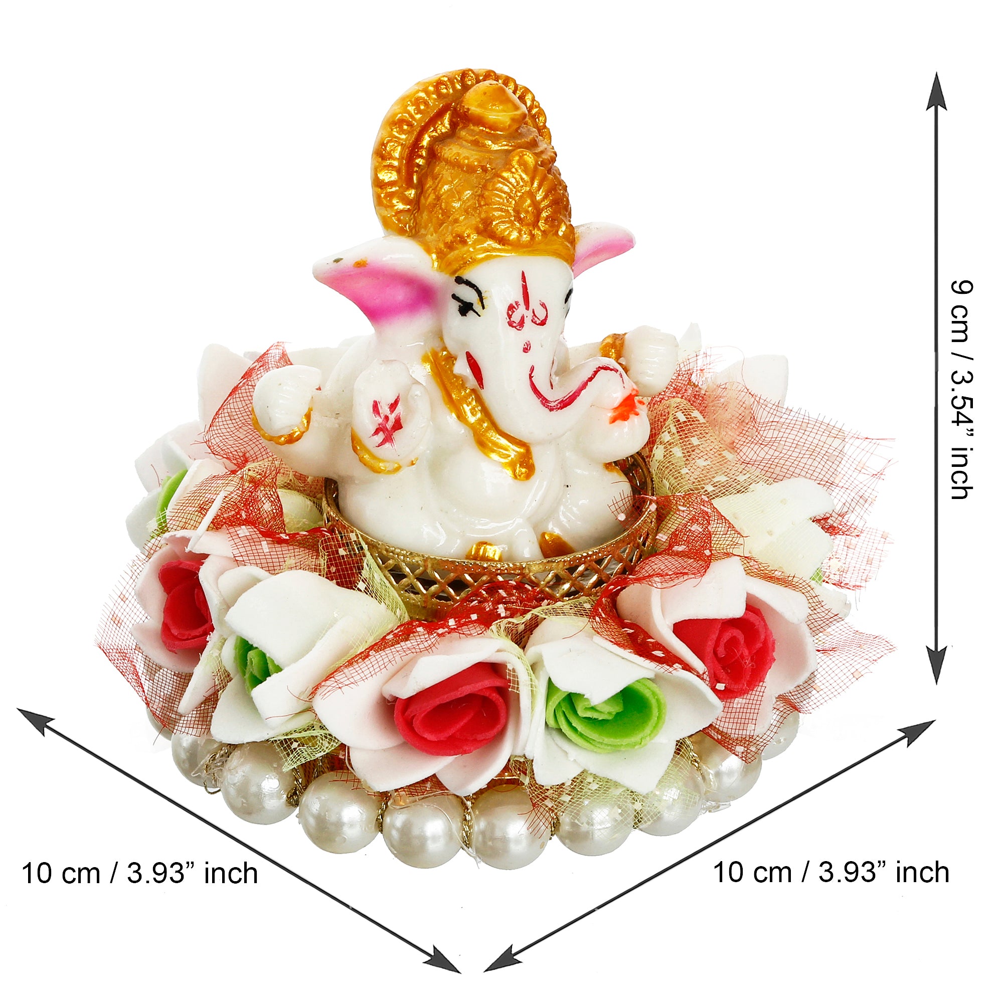 Package Content - One Lord Ganesha Idol on Floral and Pearl Decorative Handcrafted Singhasan for Home/Temple/Office/Car Dashboard
