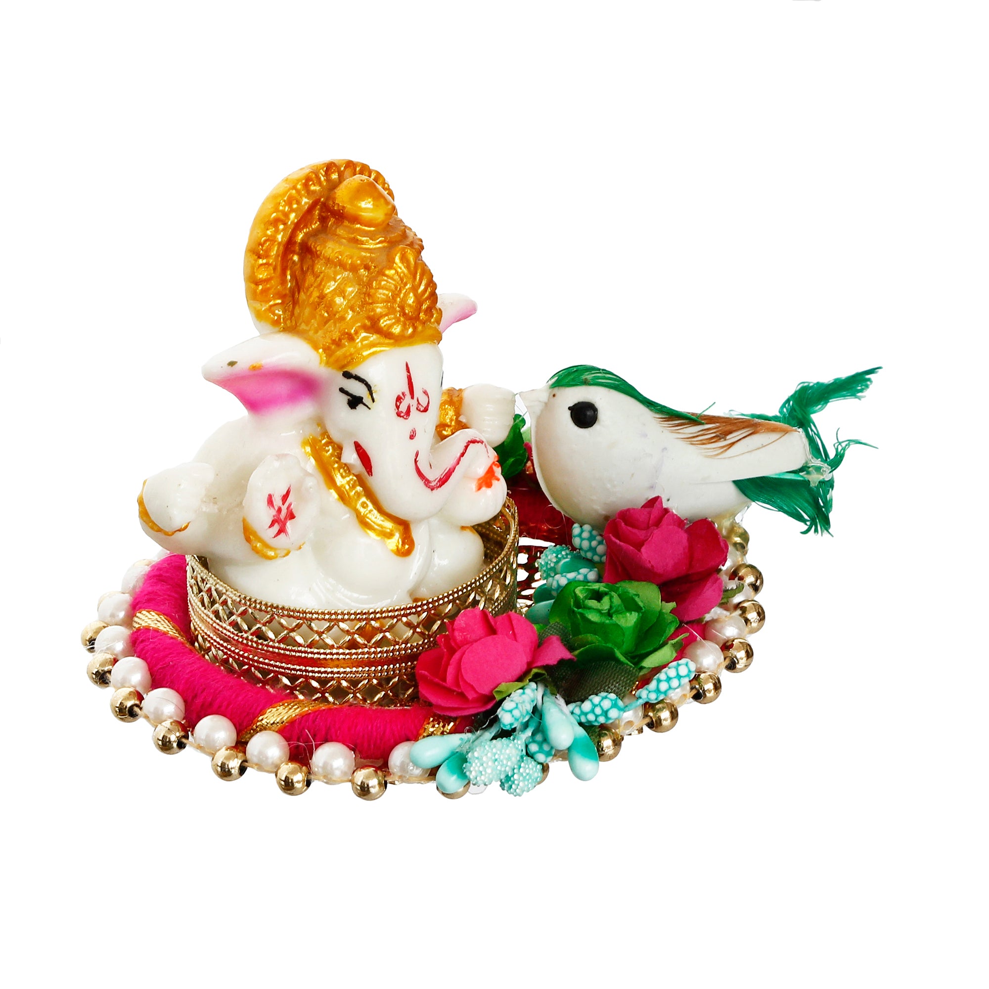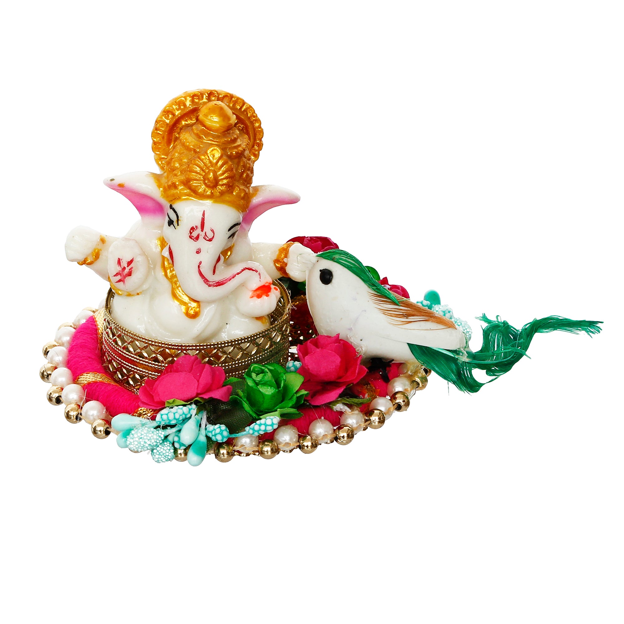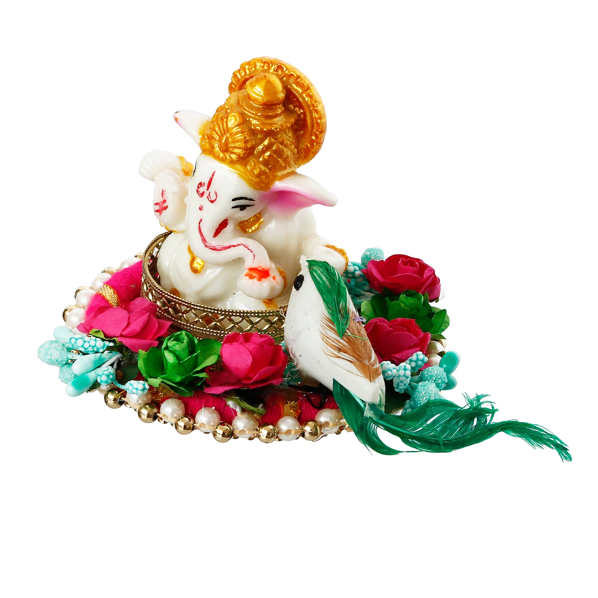Package Content - One Lord Ganesha Idol on Decorative Handcrafted Floral Plate with Bird for Home/Temple/Office/Car Dashboard