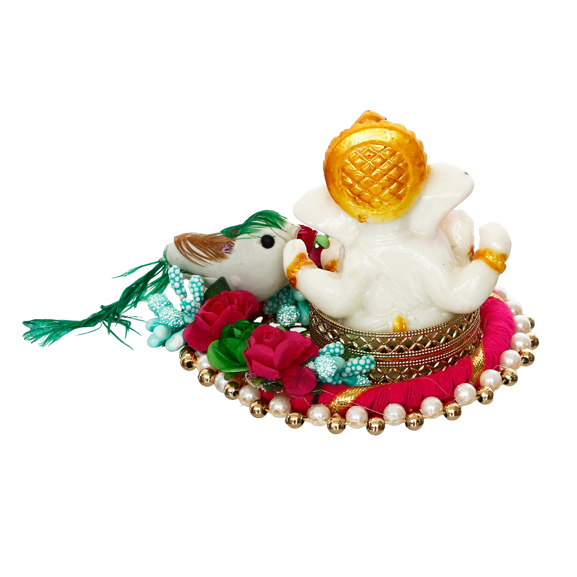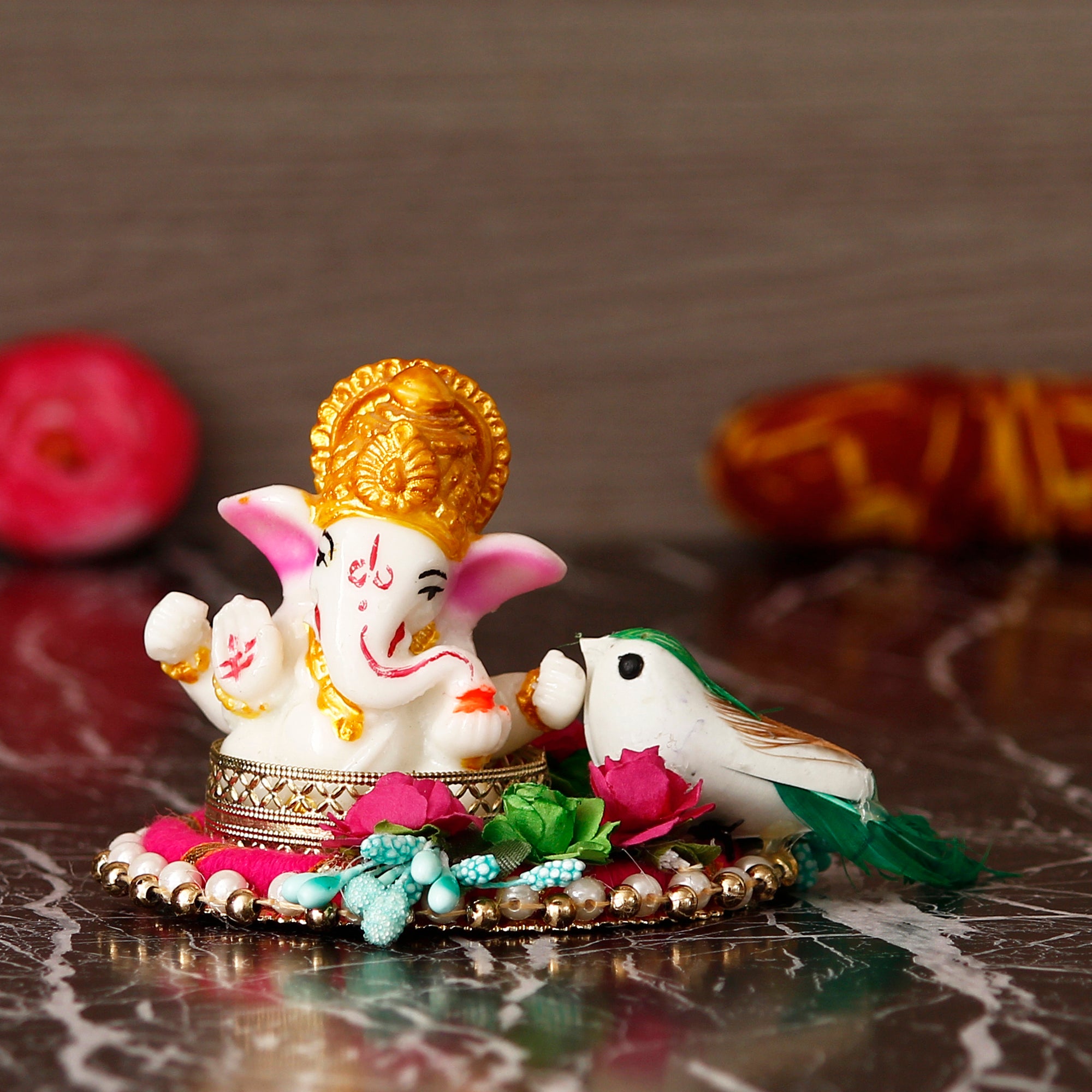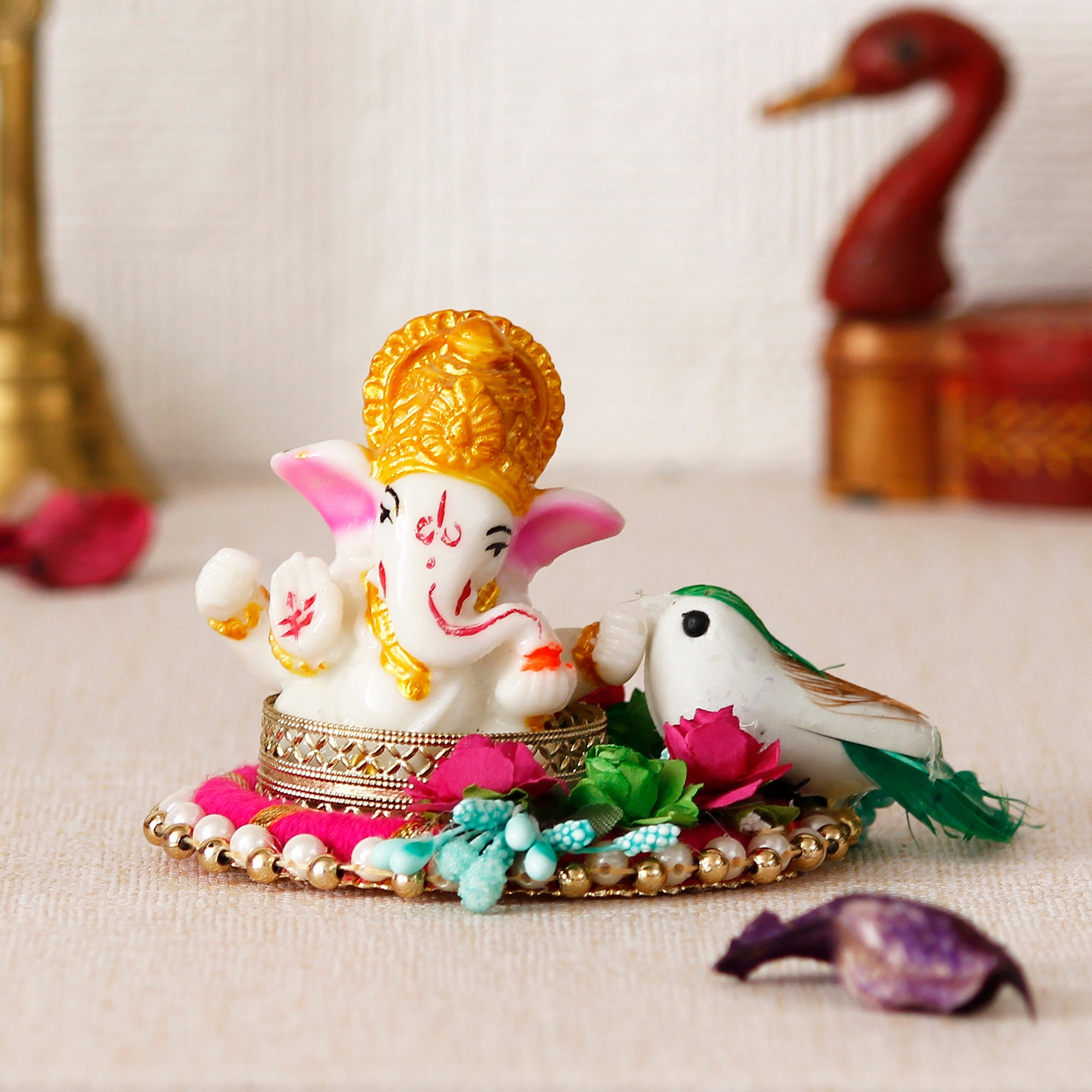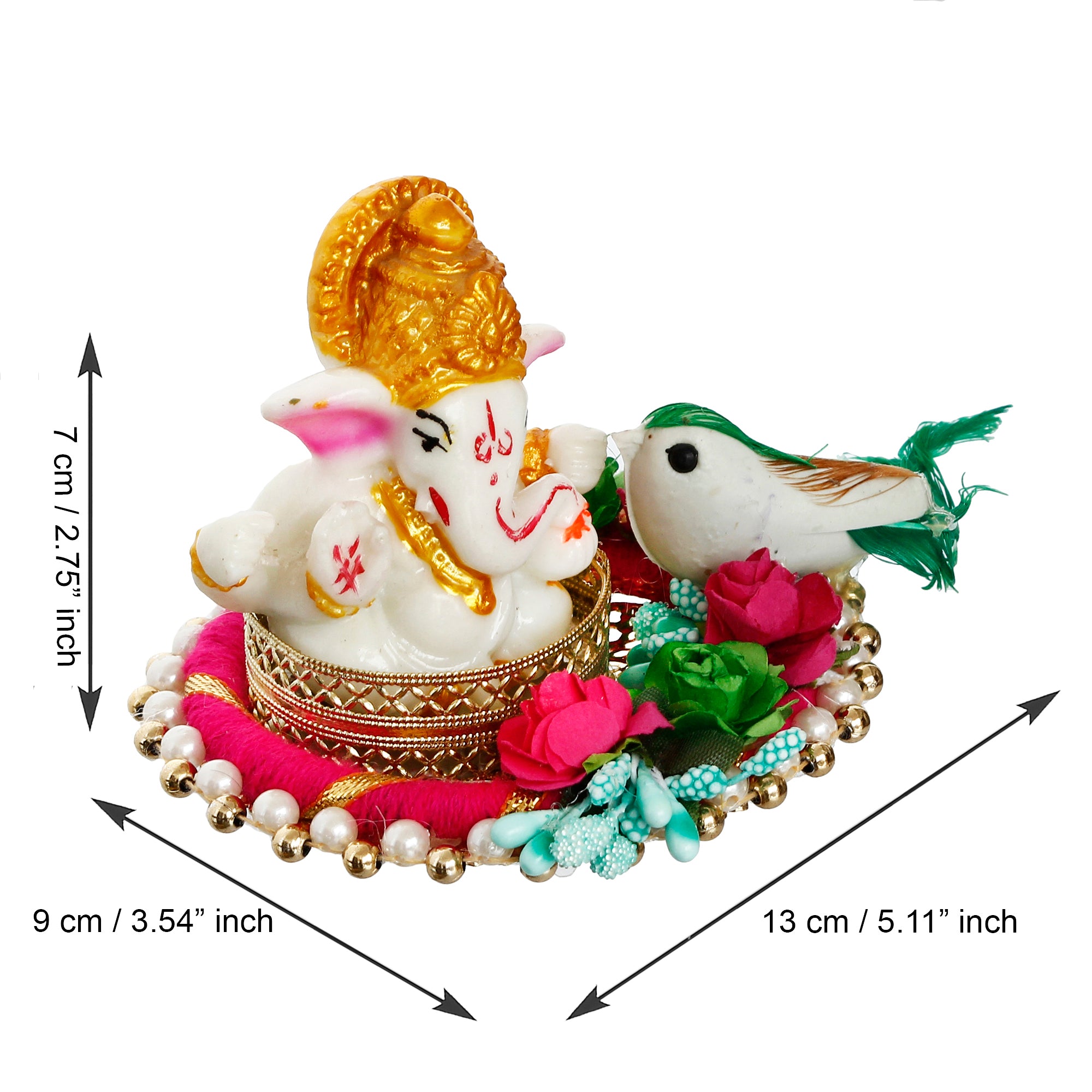 Package Content - One Lord Ganesha Idol on Decorative Handcrafted Floral Plate with Bird for Home/Temple/Office/Car Dashboard