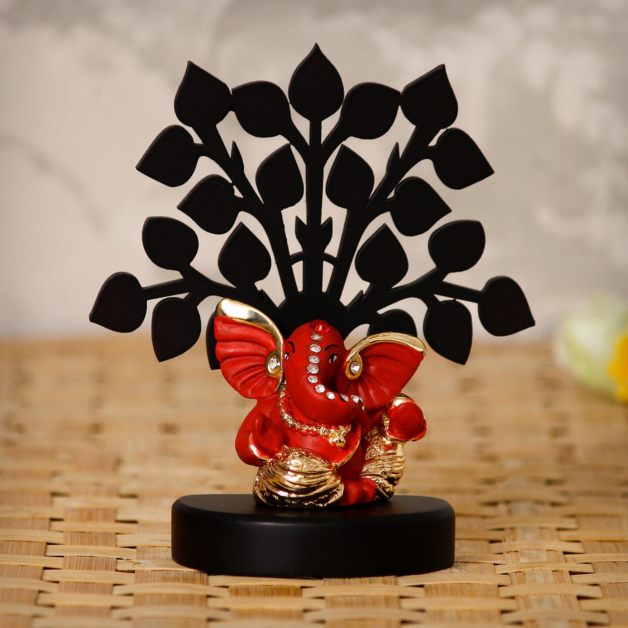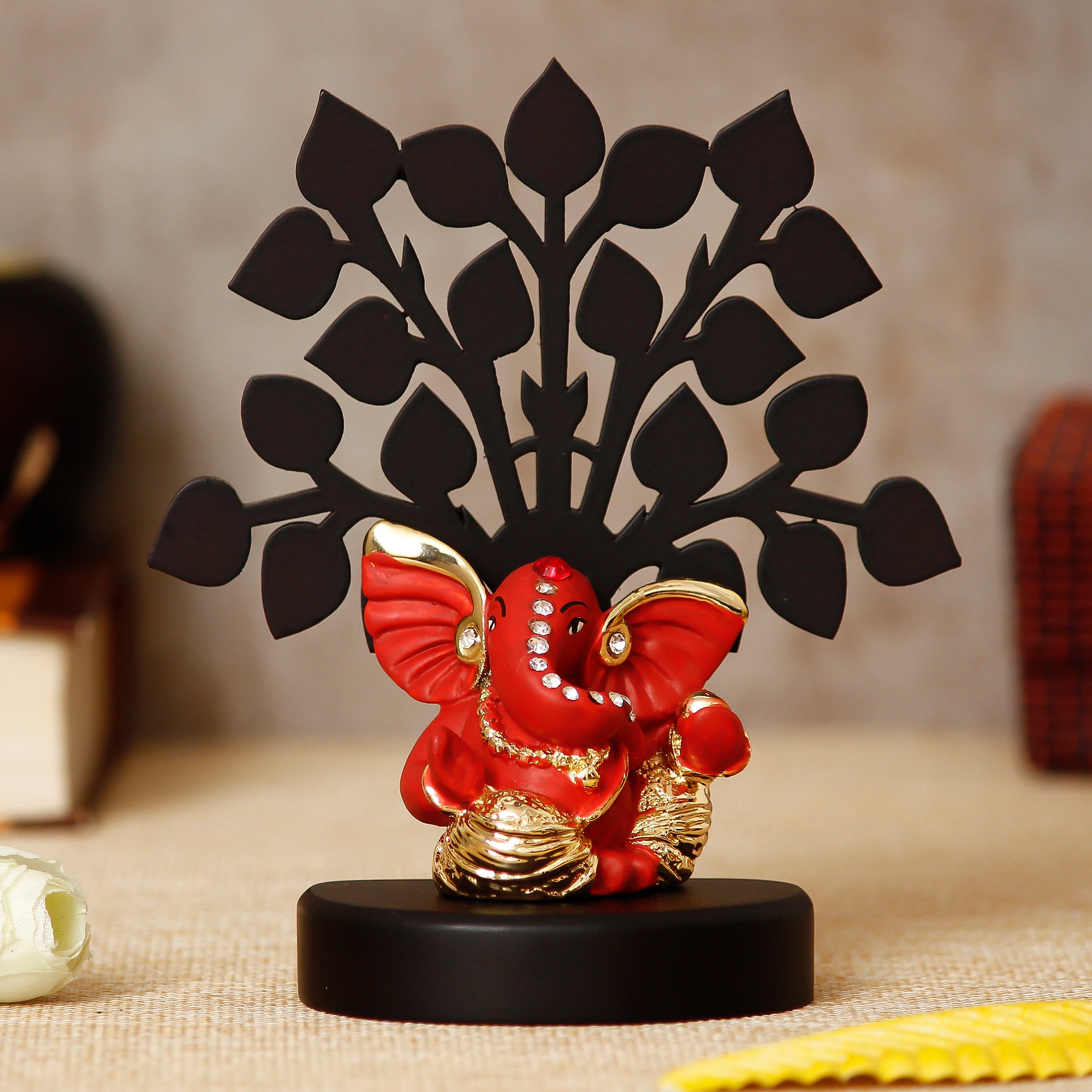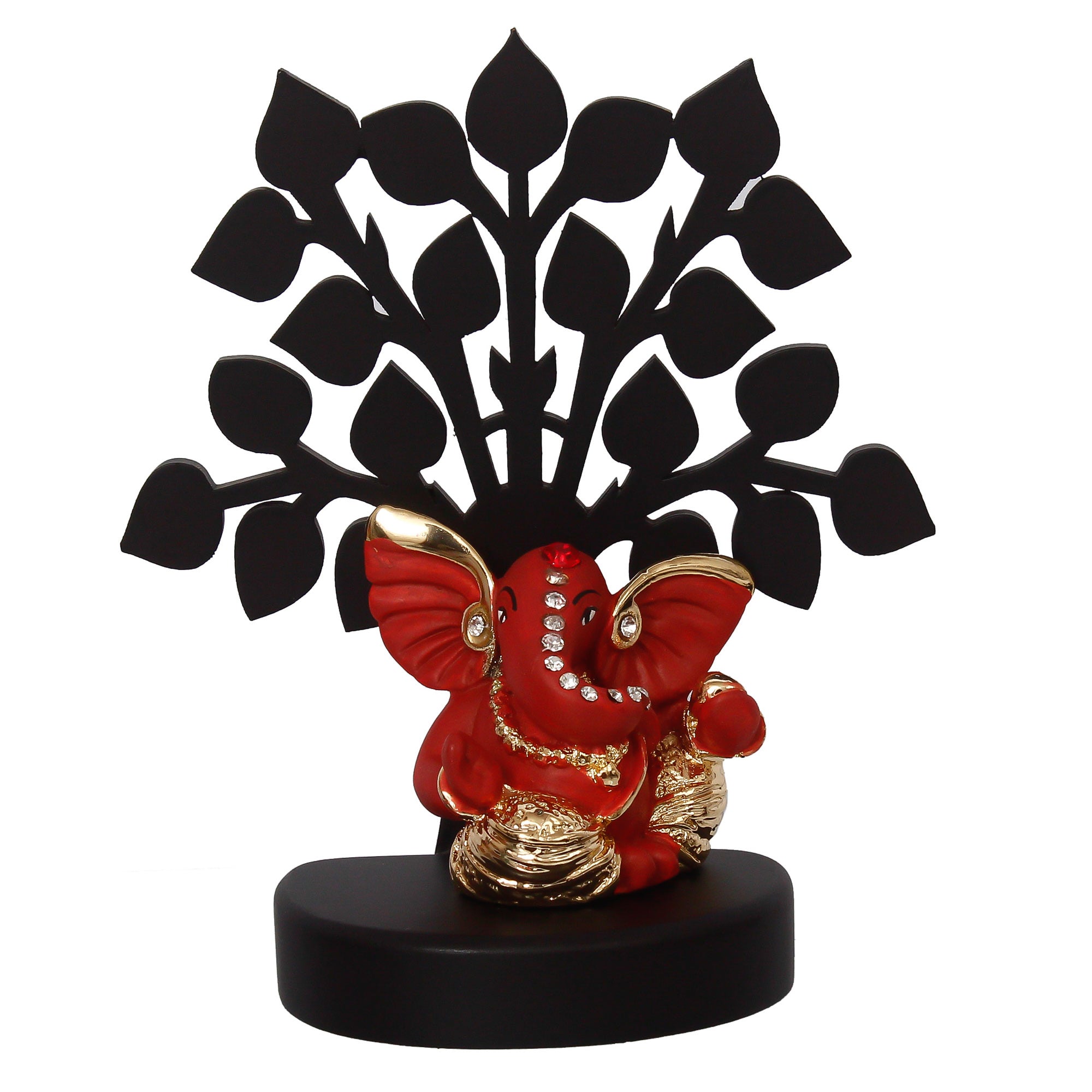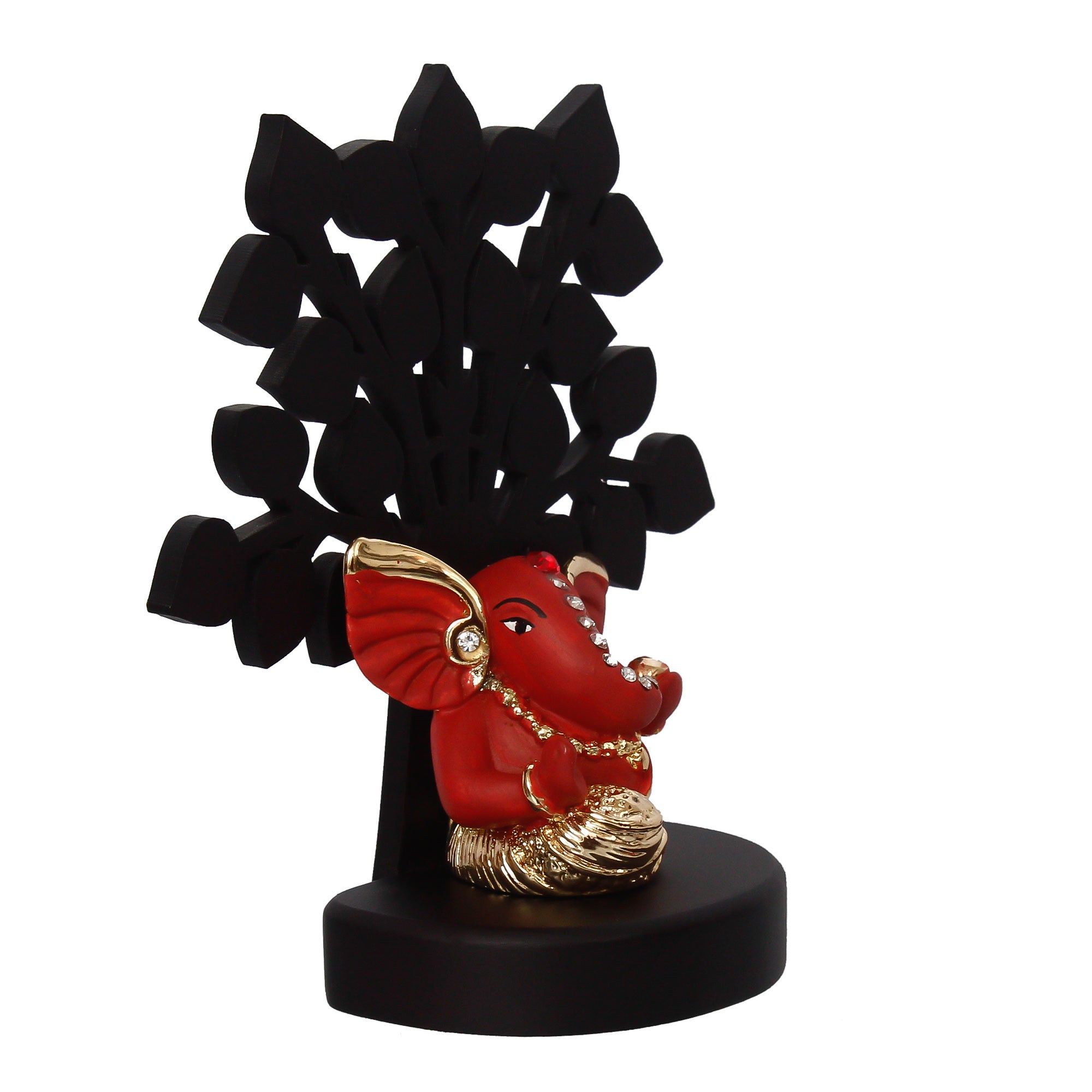 Package Content - One Gold Plated Orange Mini Kaan Ganesha Decorative Showpiece with Wooden Tree for Home/Temple/Office/Car Dashboard