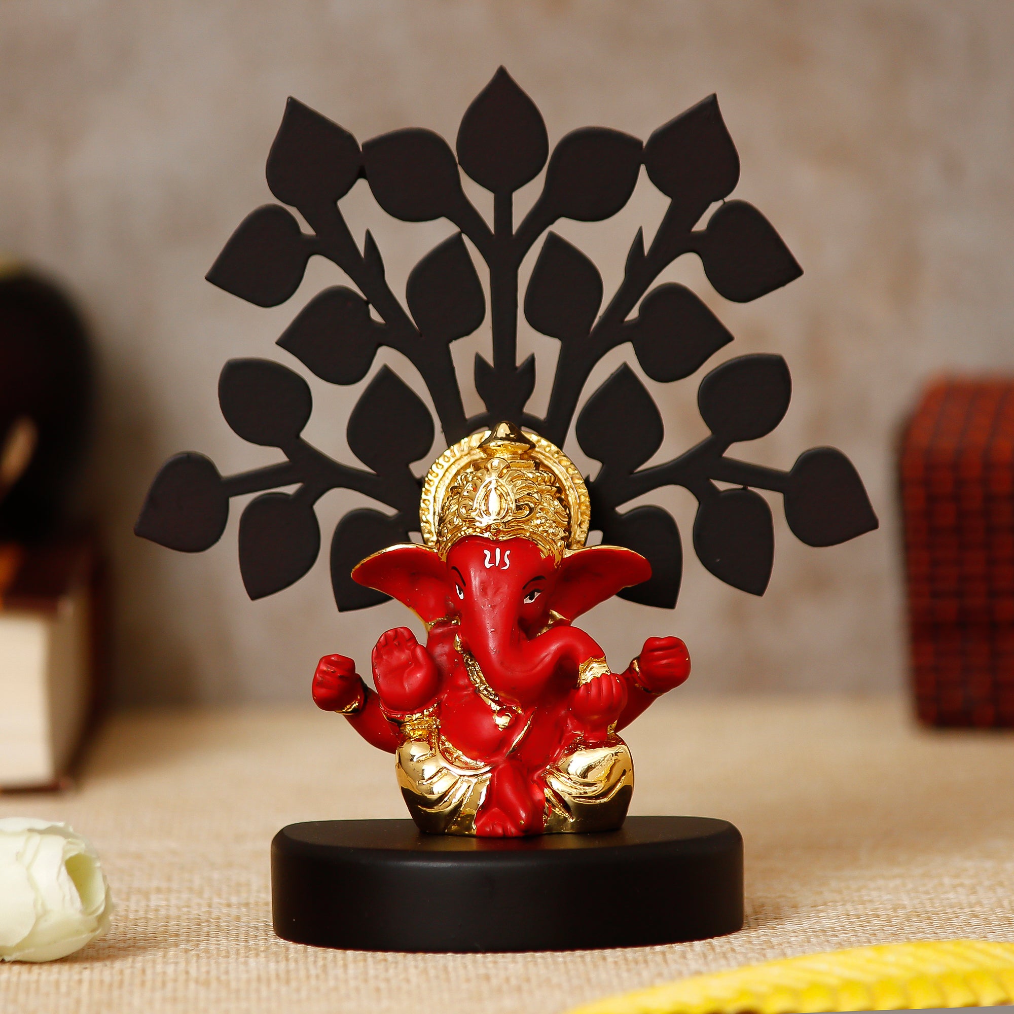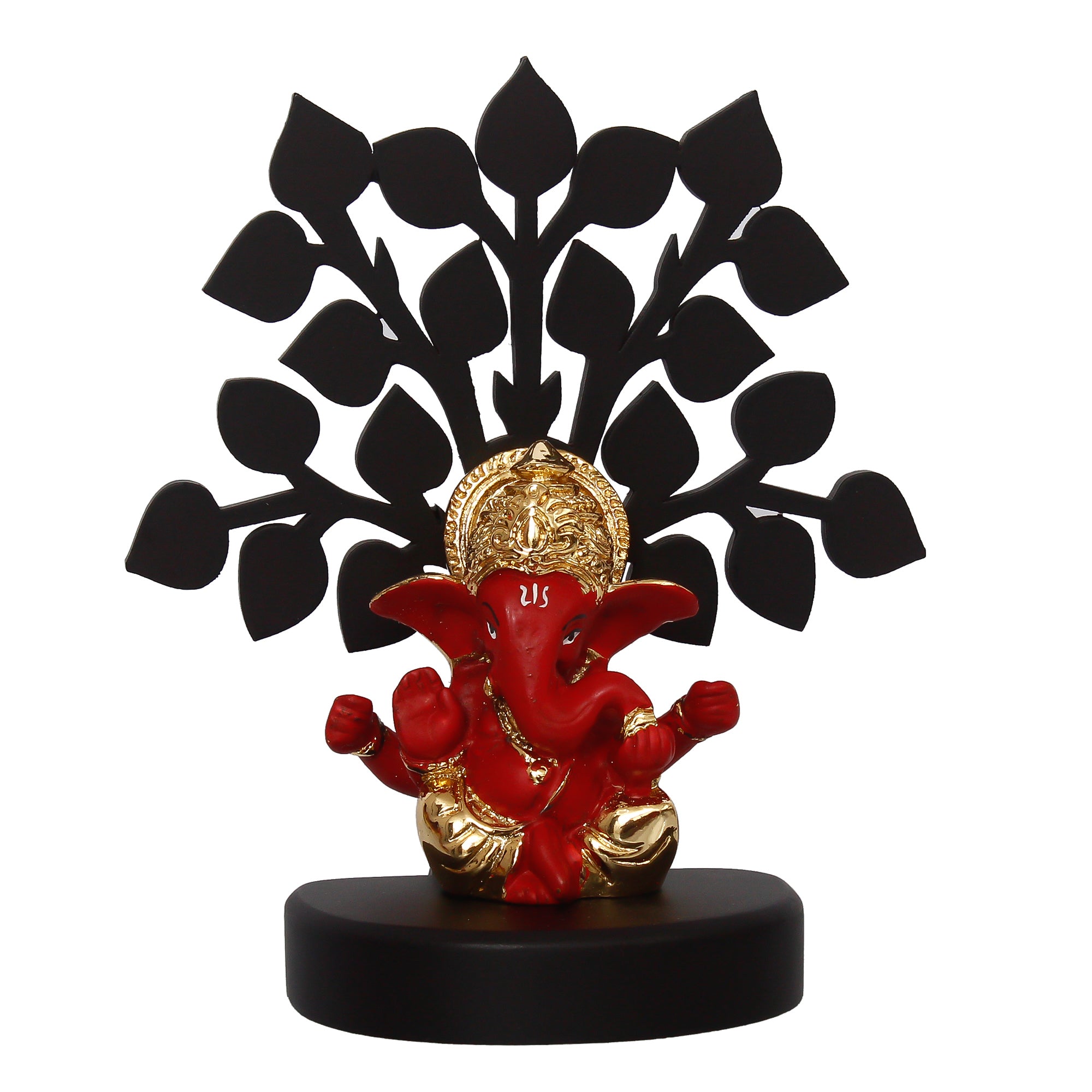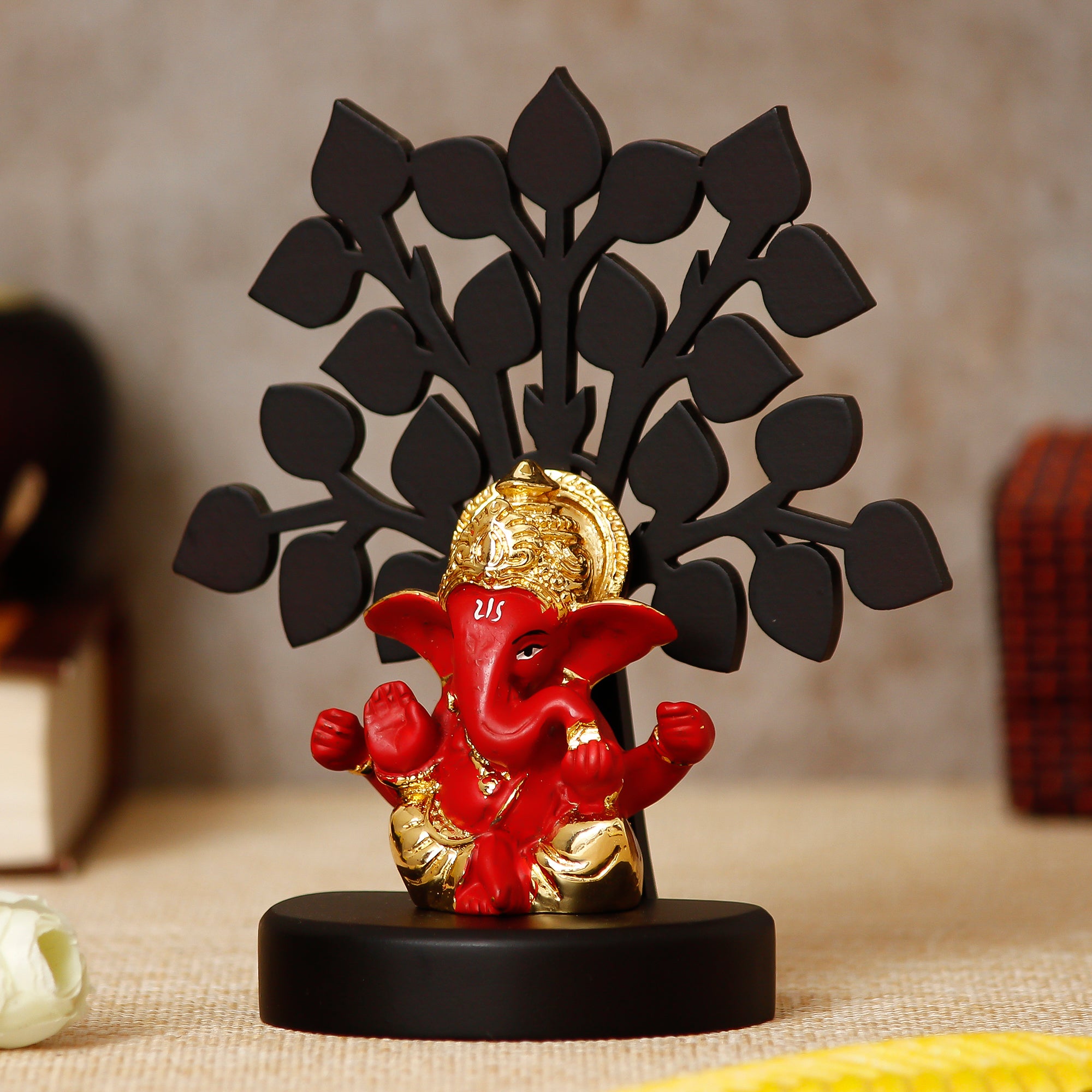 Package Content - One Gold Plated Red Mukut Ganesha Decorative Showpiece with Wooden Tree for Home/Temple/Office/Car Dashboard