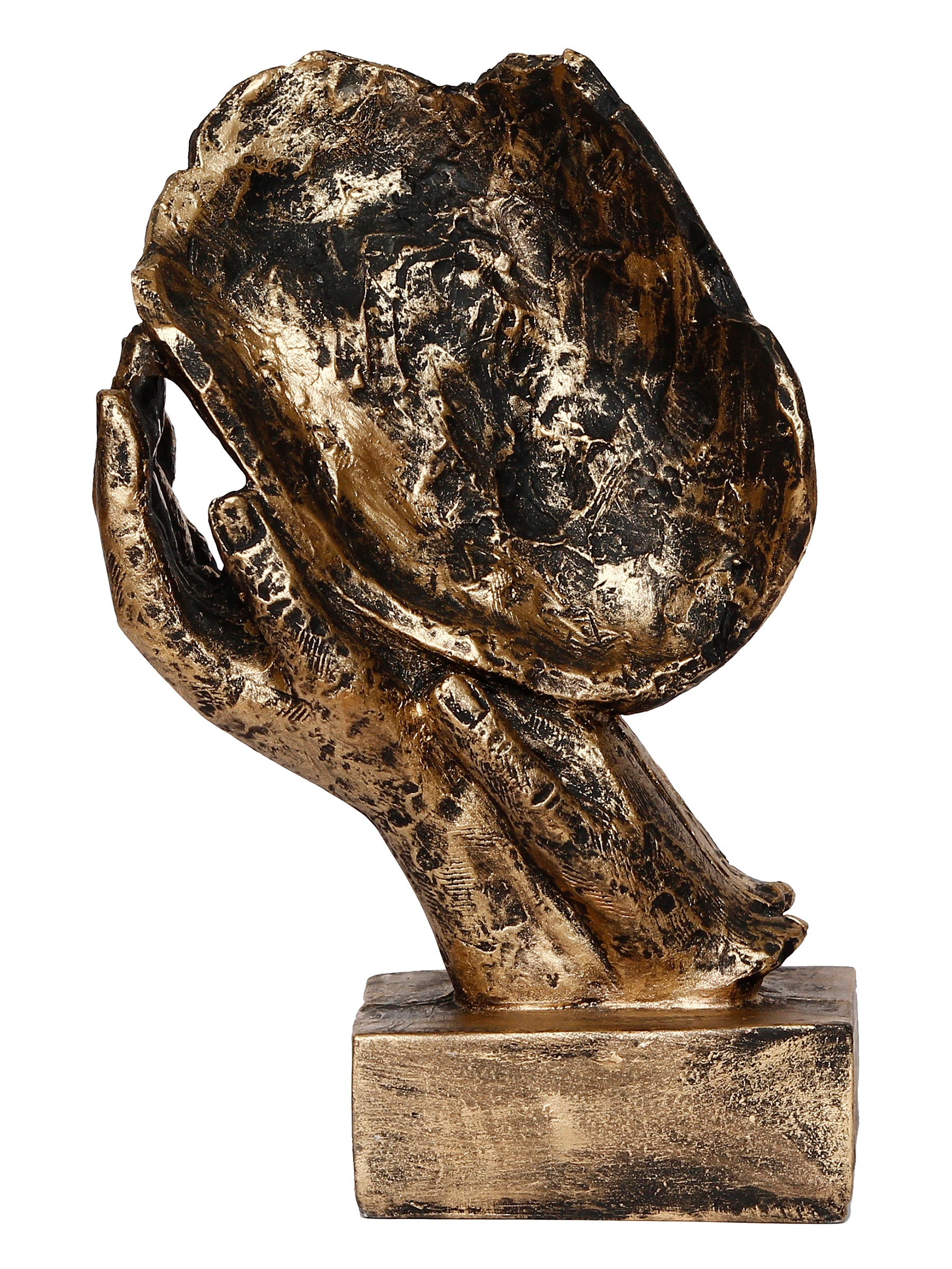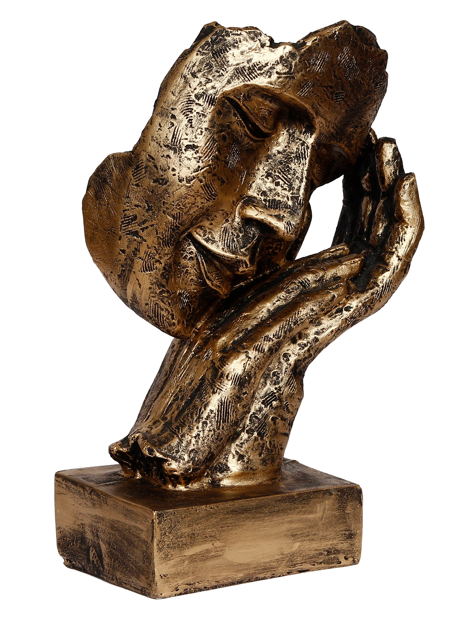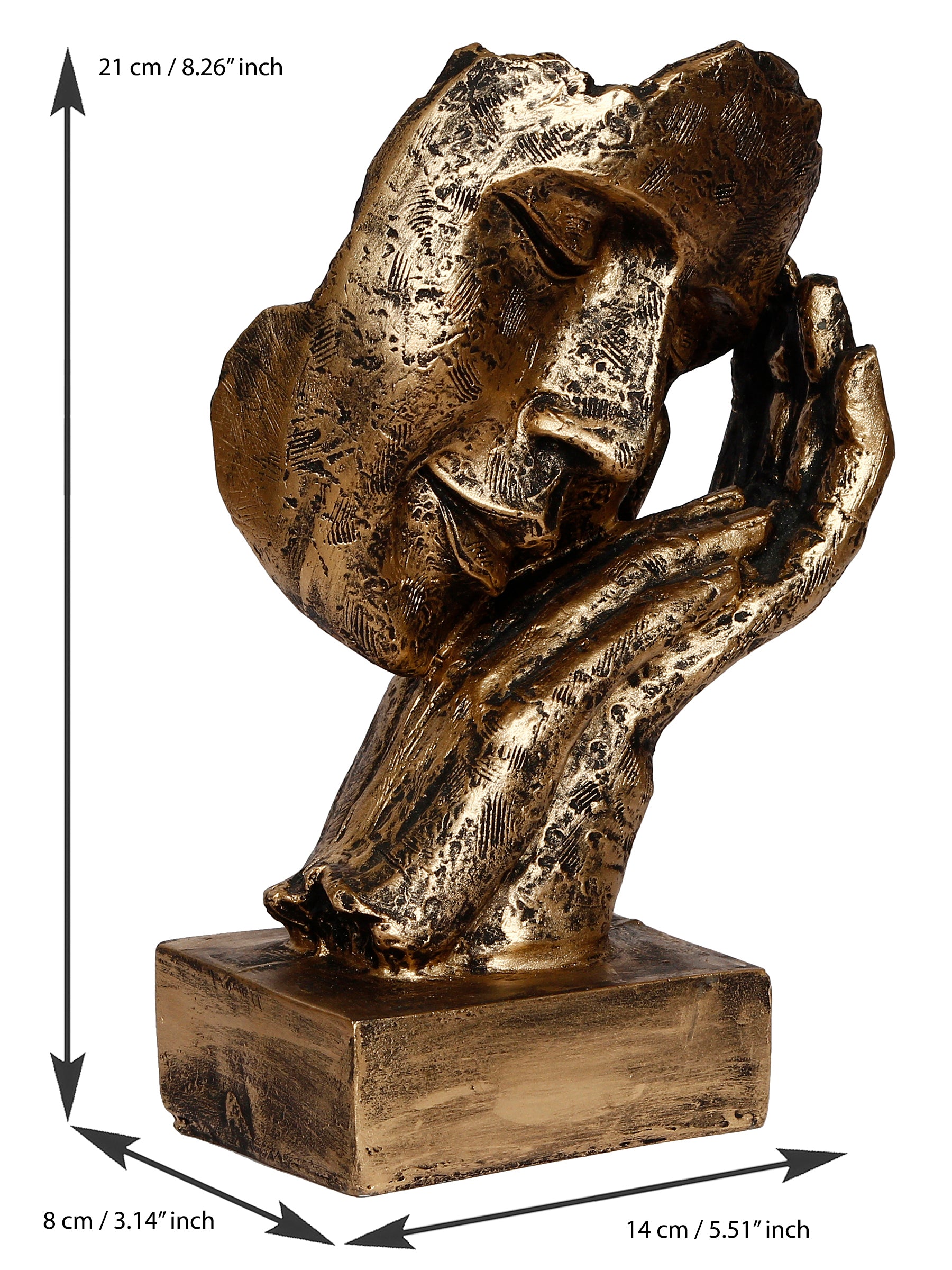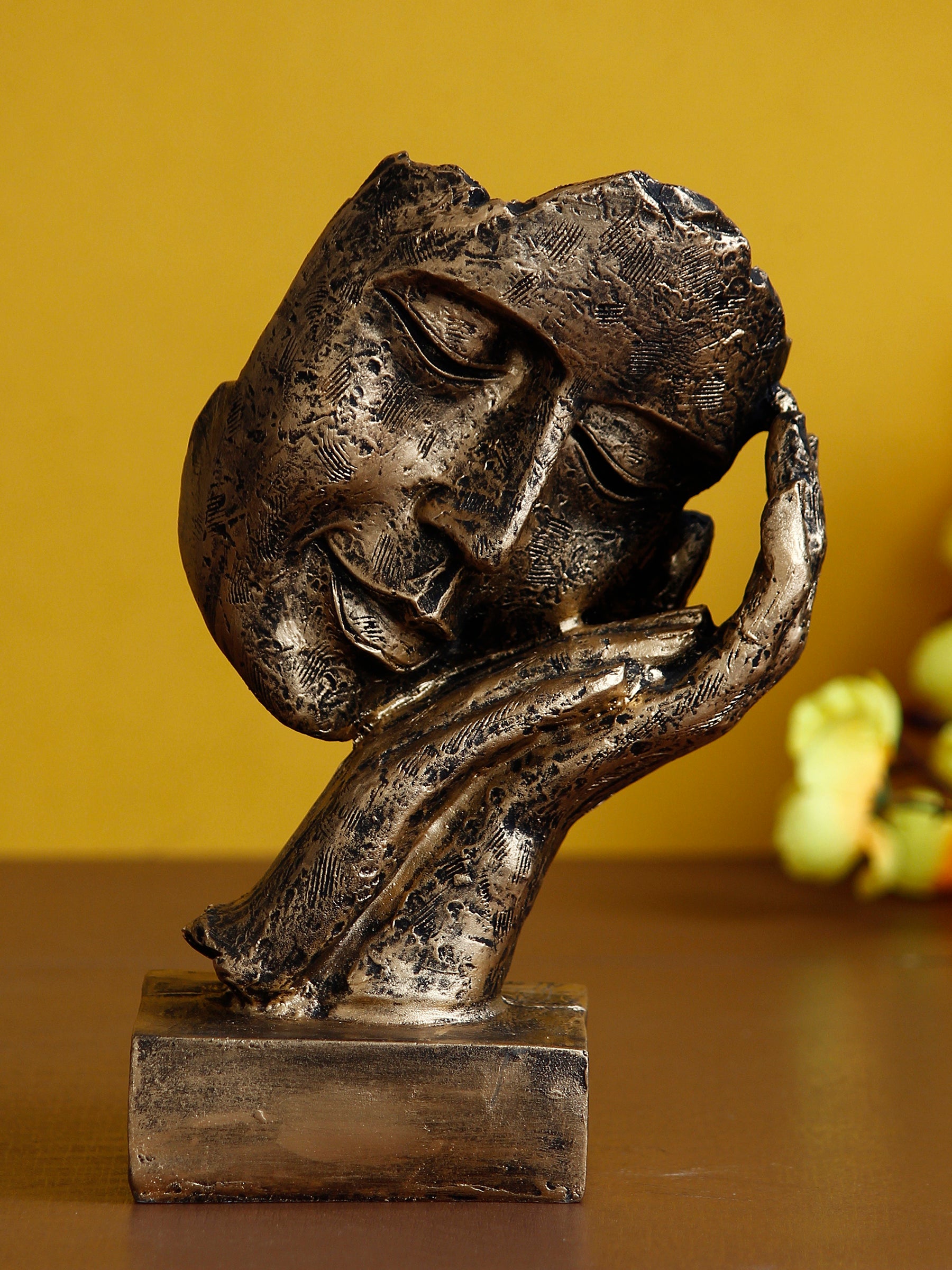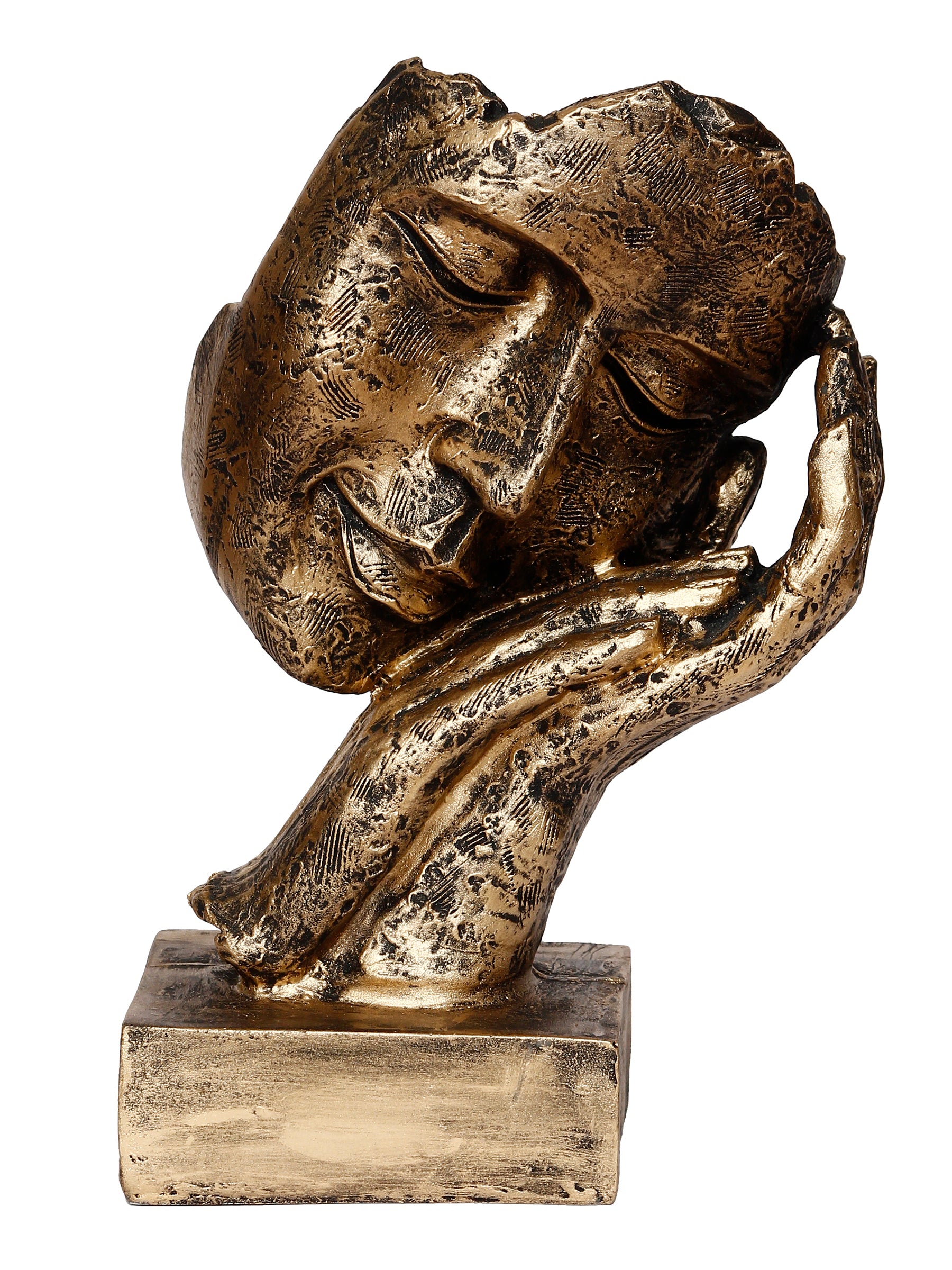 Product Description - Who says that you need full-bodied figurines to create an interesting décor look– take one look at this handcrafted Polyresin Golden Human Face Statue Sleeping on Hands Handcrafted Decorative showpiece and you will understand what we are saying. This showpiece has been made using polyresin and is the image of a face resting ever so gently on both hands. Even though this showpiece does not have a full face, it creates an image that is sophisticated and exudes a sense of serenity too. The décor piece has been given an antique finish, making this a really good choice for a gift too! Gift this to your friends and family and make them recall you every time they have a glance at this human figurine as it is exquisitely designed and intricately crafted. You can find many more idols & figurines of different types on our online portal in various colors that suit your home or office interior that are a depiction of pure art and craftsmanship.