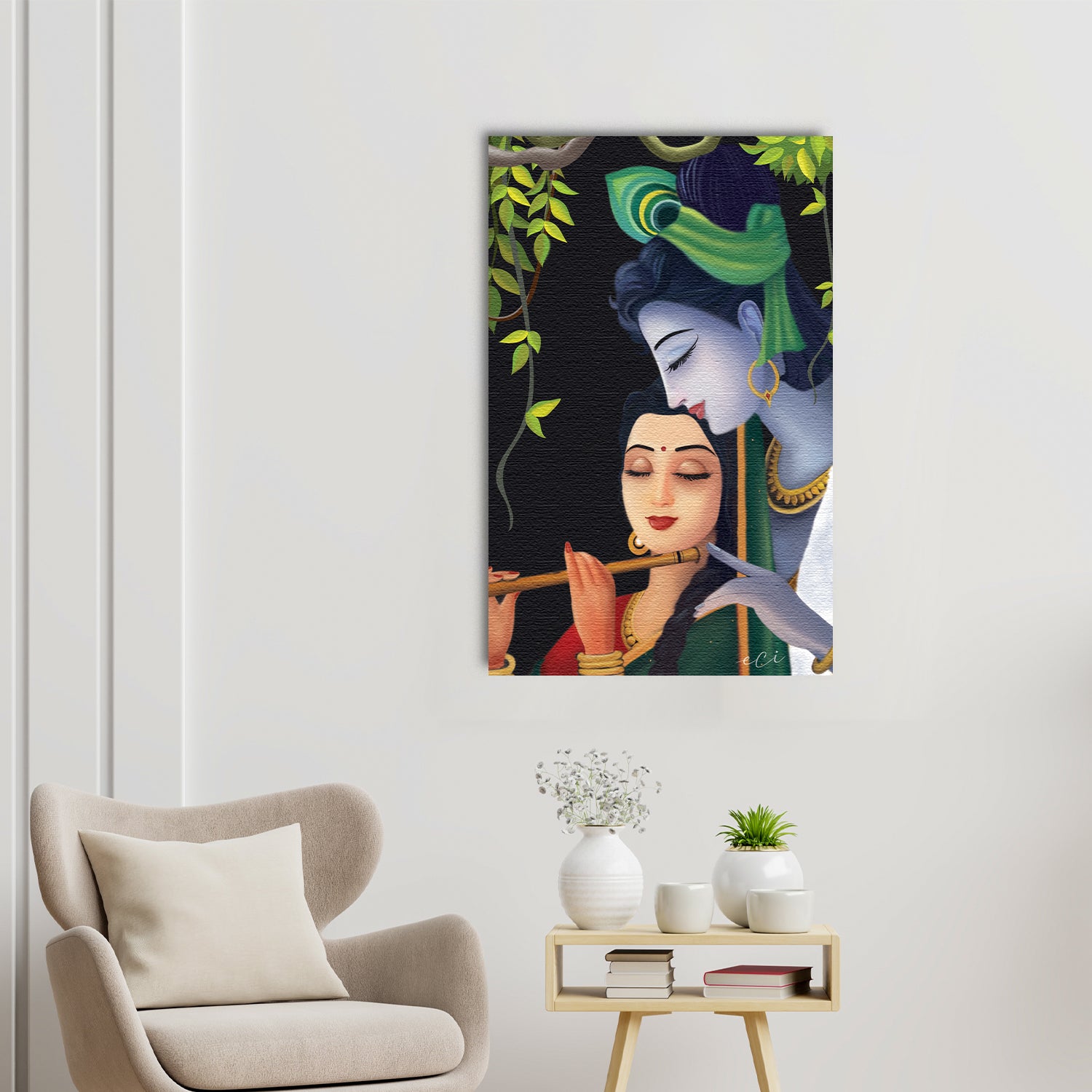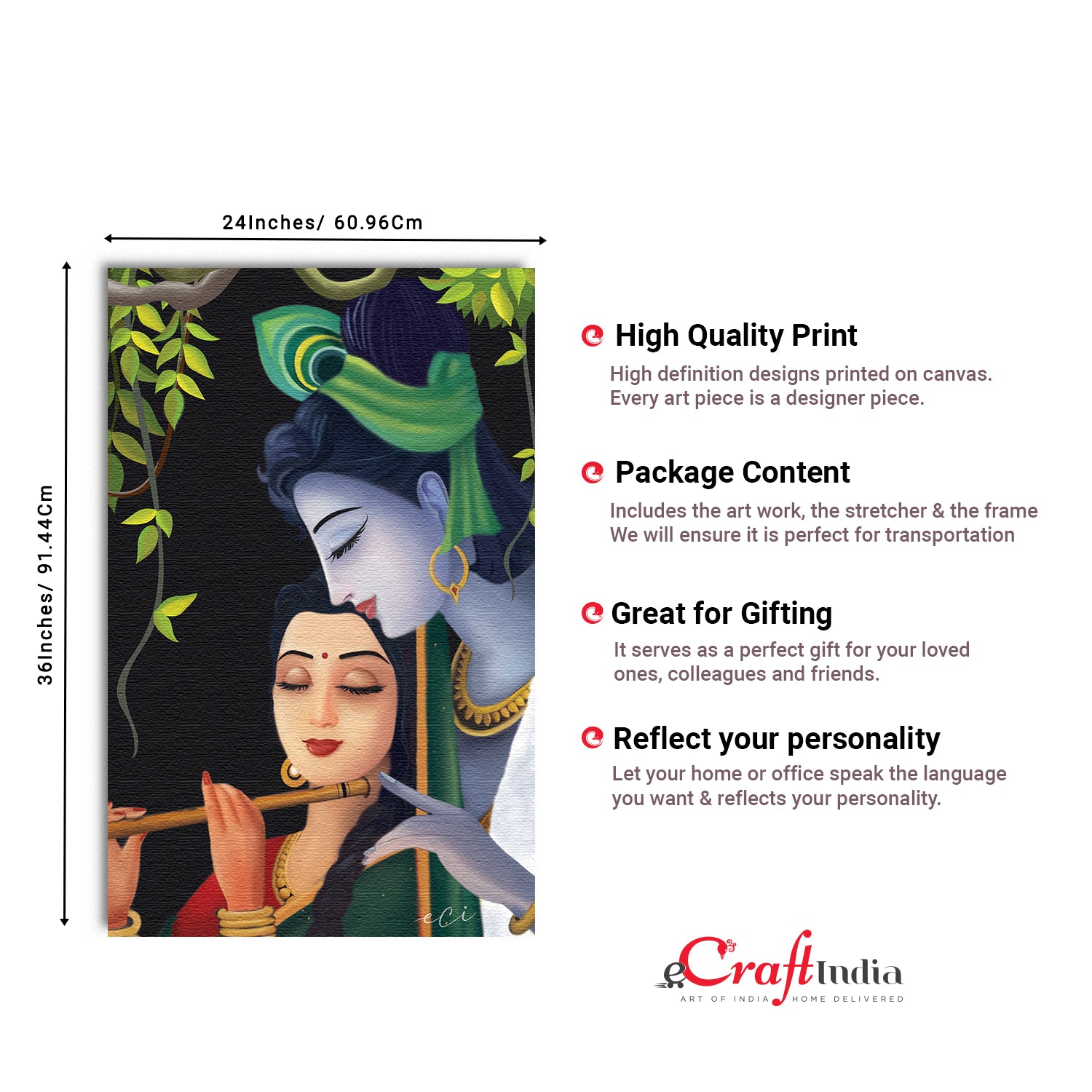 Product Description - Decorate your home & office walls with eCraftIndia Krishna Radha Original Design Canvas Printed Wall Painting. Since product size is large, each art piece arrives in foldable frame with ready to hang canvas. Only assembly of frames is required. It can be displayed as per convenience of customer and space availability on wall. Each design reflects the artistic qualities and time one has taken to design this painting Exquisitely printed, it is also a perfect gifting option for your colleagues, loved ones and family members. These paintings don't include glass so it is very light weight and fry cloth can be used to clean it.