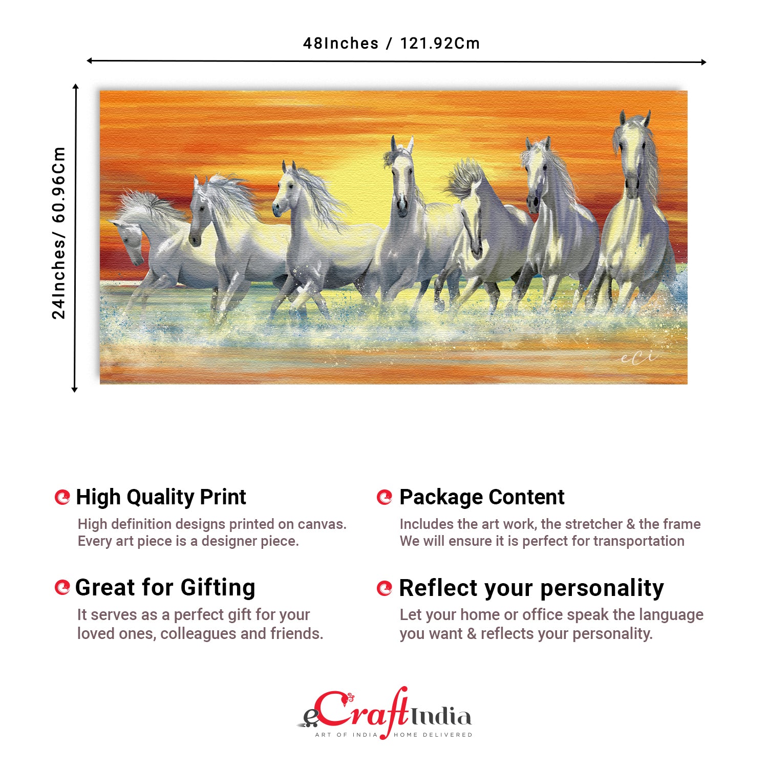 Product Description - White running horses are said to be auspicious when attached in the correct direction. And hence, decorate your home & office walls with eCraftIndia's Canvas Wall Art Painting which is one of the best wall decoration items. Since the product size is large, each art piece arrives in a foldable with a ready-to-hang painting. It can be displayed as per the convenience of the customer and space availability on the wall. Each design reflects the artistic qualities and time the e has taken to design this painting exquisitely printed, it is also a perfect gifting option for your colleagues, loved ones, and family members. These canvas paintings don't include glass so are very lightweight, and a fry cloth can be used to clean them.