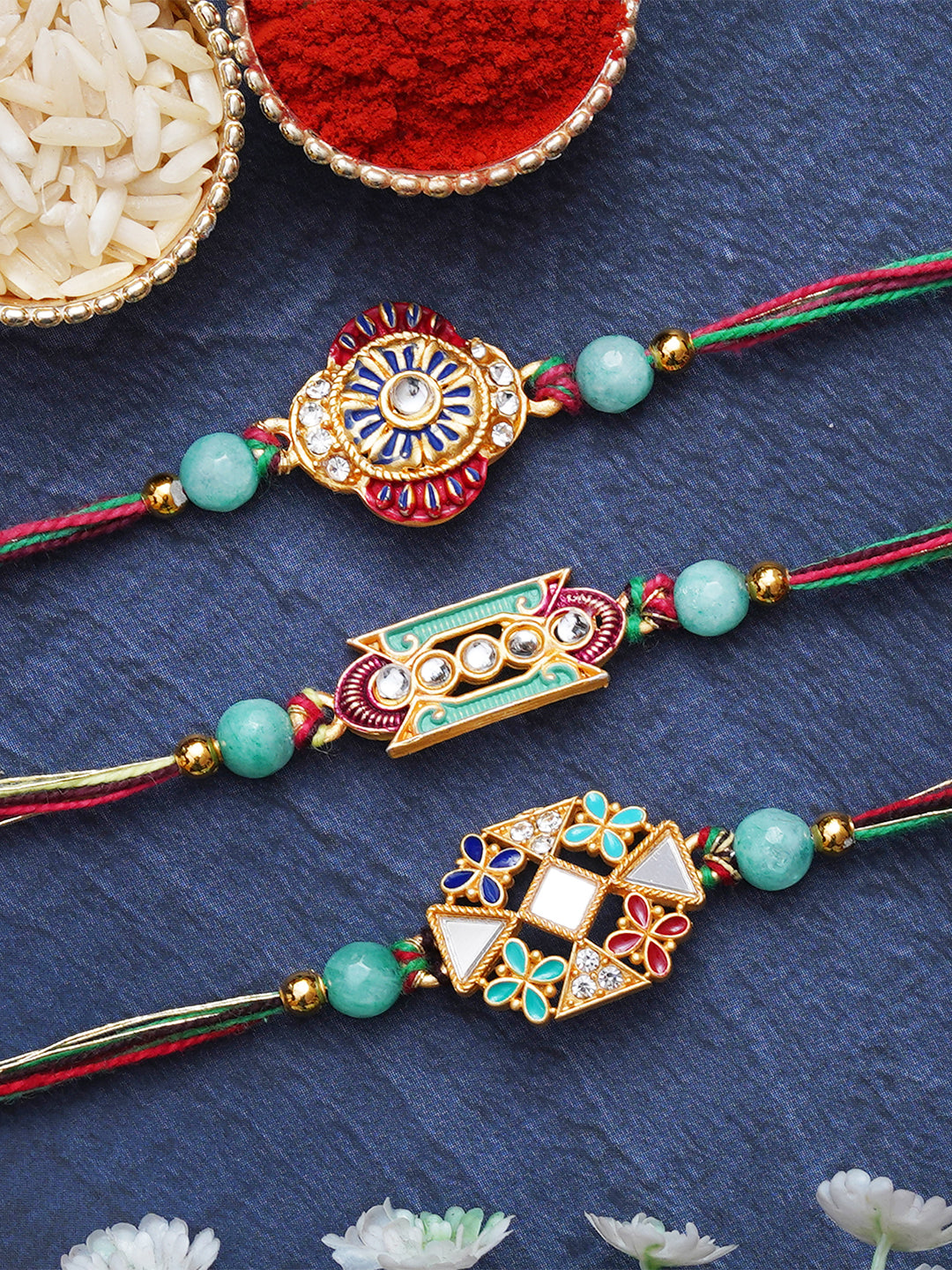 Package Content - Set of 3 Designer Rakhis, 1 Roli Chawal Pack