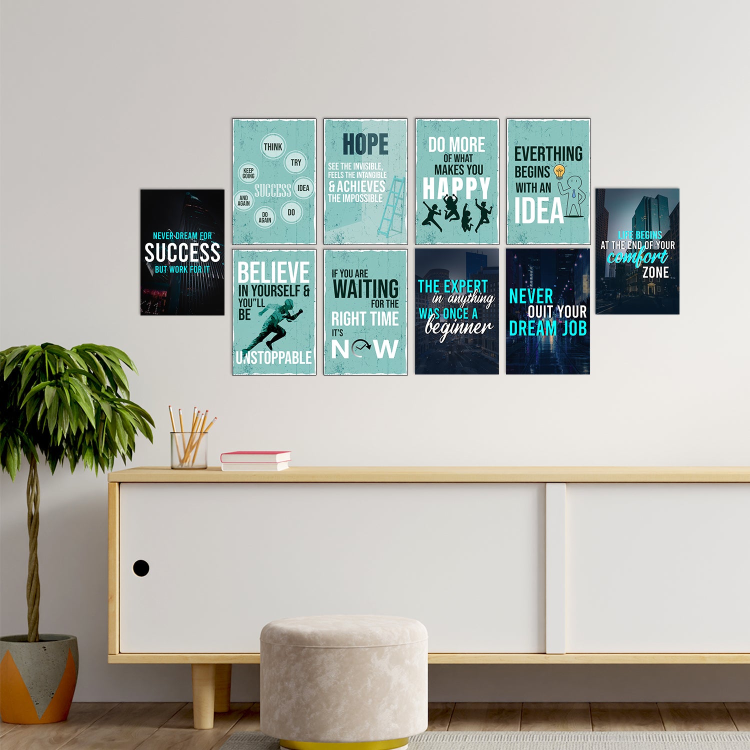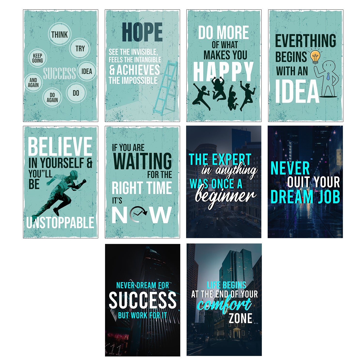 Package Content - Set of 10 Motivational Positive Office Quotes High Quality Printed 300 GSM Posters with Glue Drops