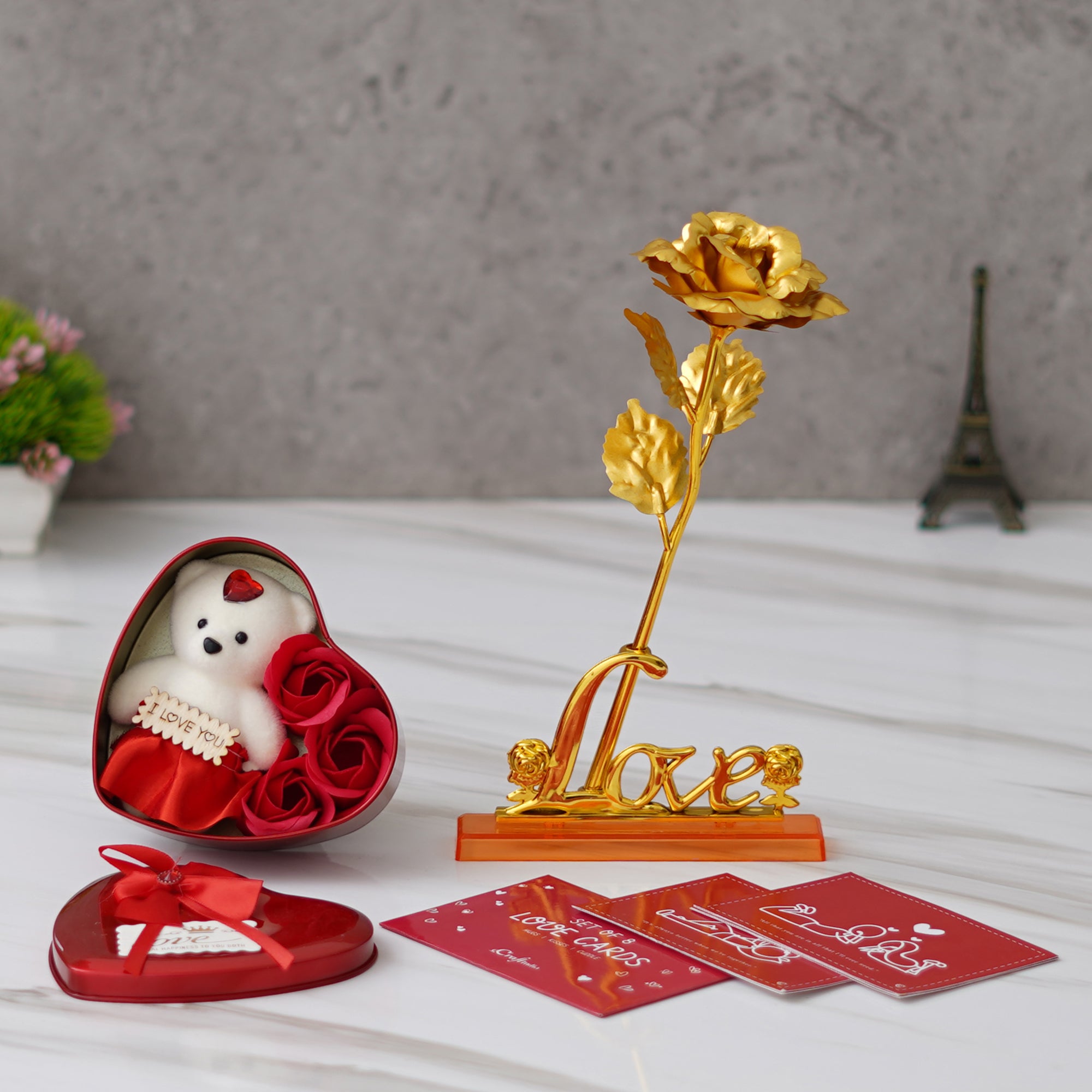 Wish to make your loved one feel on top of the world? This combo consists of One Set of 8 Valentine Love Gift Cards Set, One Love Golden Rose Table Decor Valentine Gift Set Showpiece, One Heart Shaped Valentine Gift Box Set with White Teddy and Red Flowers. At eCraftIndia, you can come across various Valentine's gift set combos that would for sure make your partner feel more loved & connected to you. These gift sets have various variations that you can select according to your occasion or celebration. Further, these are made with much thought by our skilled artists just so you can make your loved one feel special always!