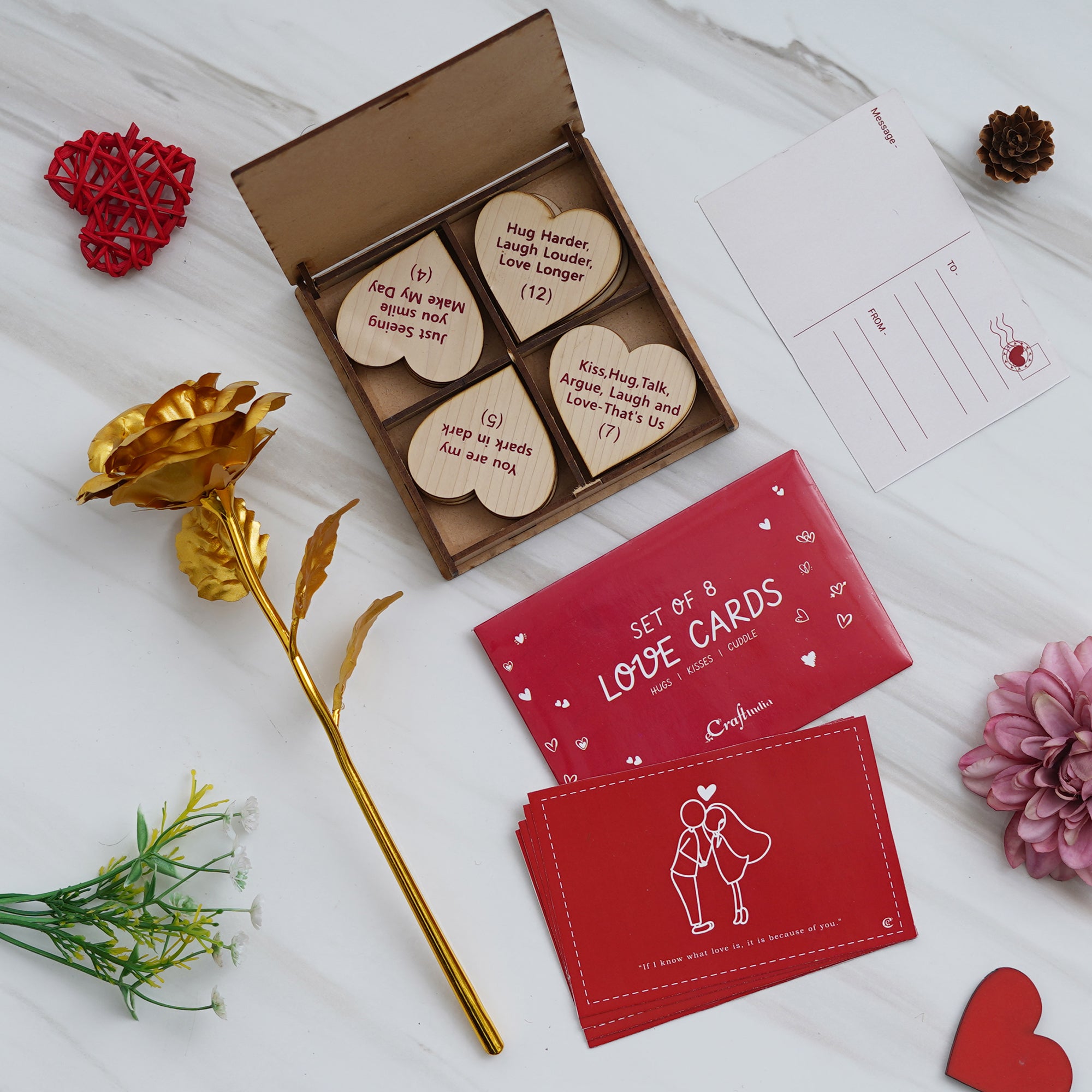 Wish to make your loved one feel on top of the world? This combo consists of One Set of 8 Valentine Love Gift Cards Set, One Golden Rose Valentine Gift Set, One "20 Reasons Why I Love You" Printed on Little Hearts Valentine Brown Wooden Gift Set. At eCraftIndia, you can come across various Valentine's gift set combos that would for sure make your partner feel more loved & connected to you. These gift sets have various variations that you can select according to your occasion or celebration. Further, these are made with much thought by our skilled artists just so you can make your loved one feel special always!