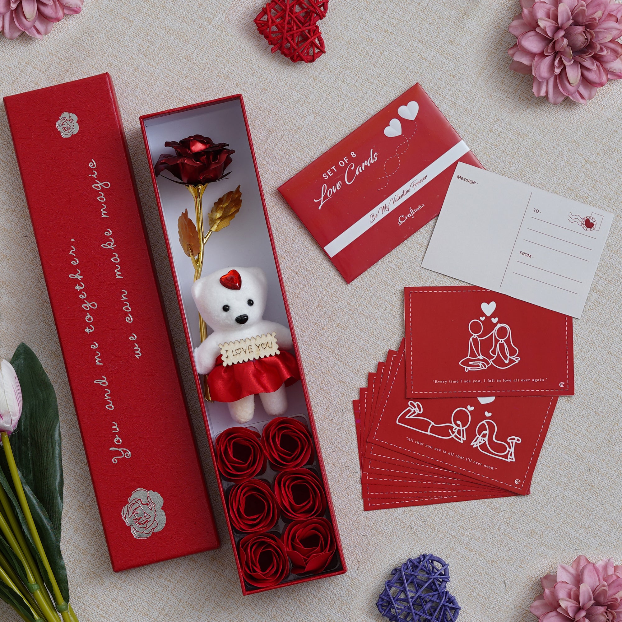 Wish to make your loved one feel on top of the world? This combo consists of One Set of 8 Love Post Cards Valentine Gift Cards Set, One Red Valentine Gift Box with Teddy, Red Flower and 6 Roses. At eCraftIndia, you can come across various Valentine's gift set combos that would for sure make your partner feel more loved & connected to you. These gift sets have various variations that you can select according to your occasion or celebration. Further, these are made with much thought by our skilled artists just so you can make your loved one feel special always!