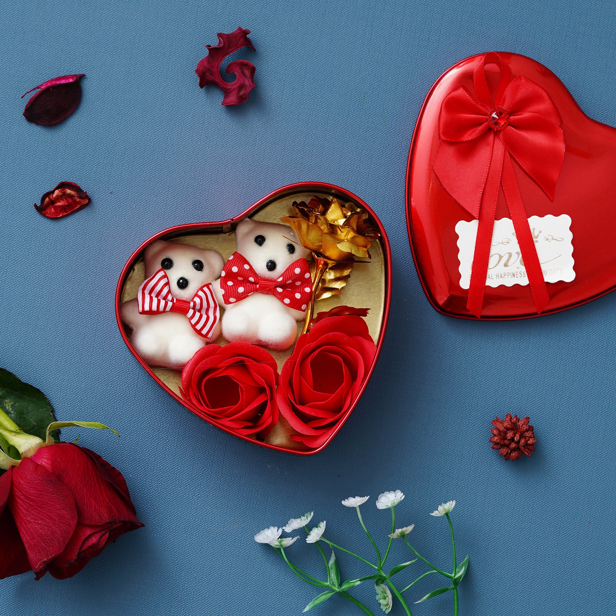 Wish to make your loved one feel on top of the world? This combo consists of One Set of 8 Love Post Cards Valentine Gift Cards Set, One "Love" Valentine Wooden Photo Frame With Red Stand, One Red Heart Shaped Gift Box with 1 Golden Rose, 3 Red Roses, 1 Teddy Bear and a Card. At eCraftIndia, you can come across various Valentine's gift set combos that would for sure make your partner feel more loved & connected to you. These gift sets have various variations that you can select according to your occasion or celebration. Further, these are made with much thought by our skilled artists just so you can make your loved one feel special always!