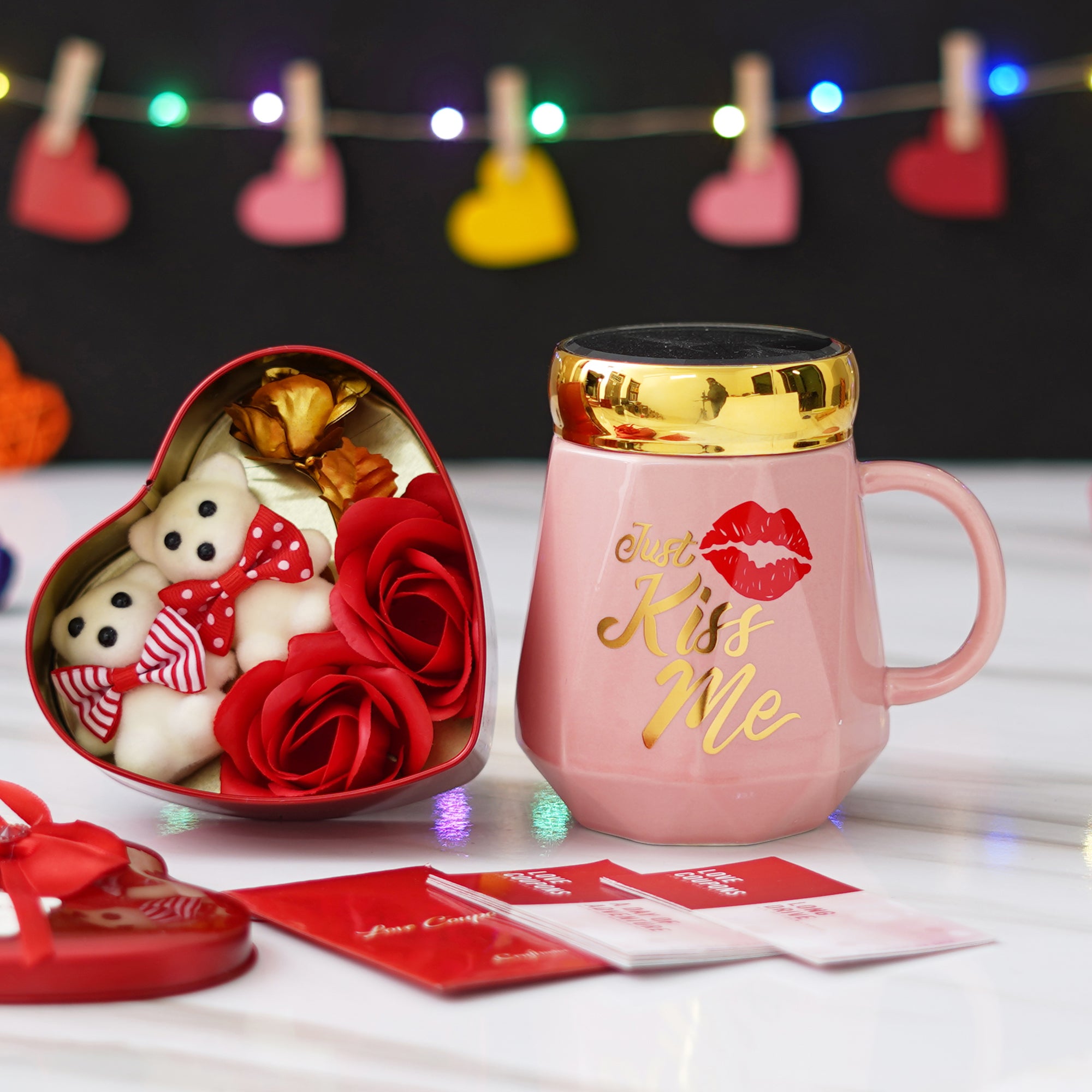 Wish to make your loved one feel on top of the world? This combo consists of One Set of 12 Love Coupons Valentine Gift Cards Set, One "Just Kiss Me" Printed Valentine Ceramic Pink Mug with Golden Lid, One Red Heart Shaped Gift Box with 1 Golden Rose, 3 Red Roses, 1 Teddy Bear and a Card. At eCraftIndia, you can come across various Valentine's gift set combos that would for sure make your partner feel more loved & connected to you. These gift sets have various variations that you can select according to your occasion or celebration. Further, these are made with much thought by our skilled artists just so you can make your loved one feel special always!