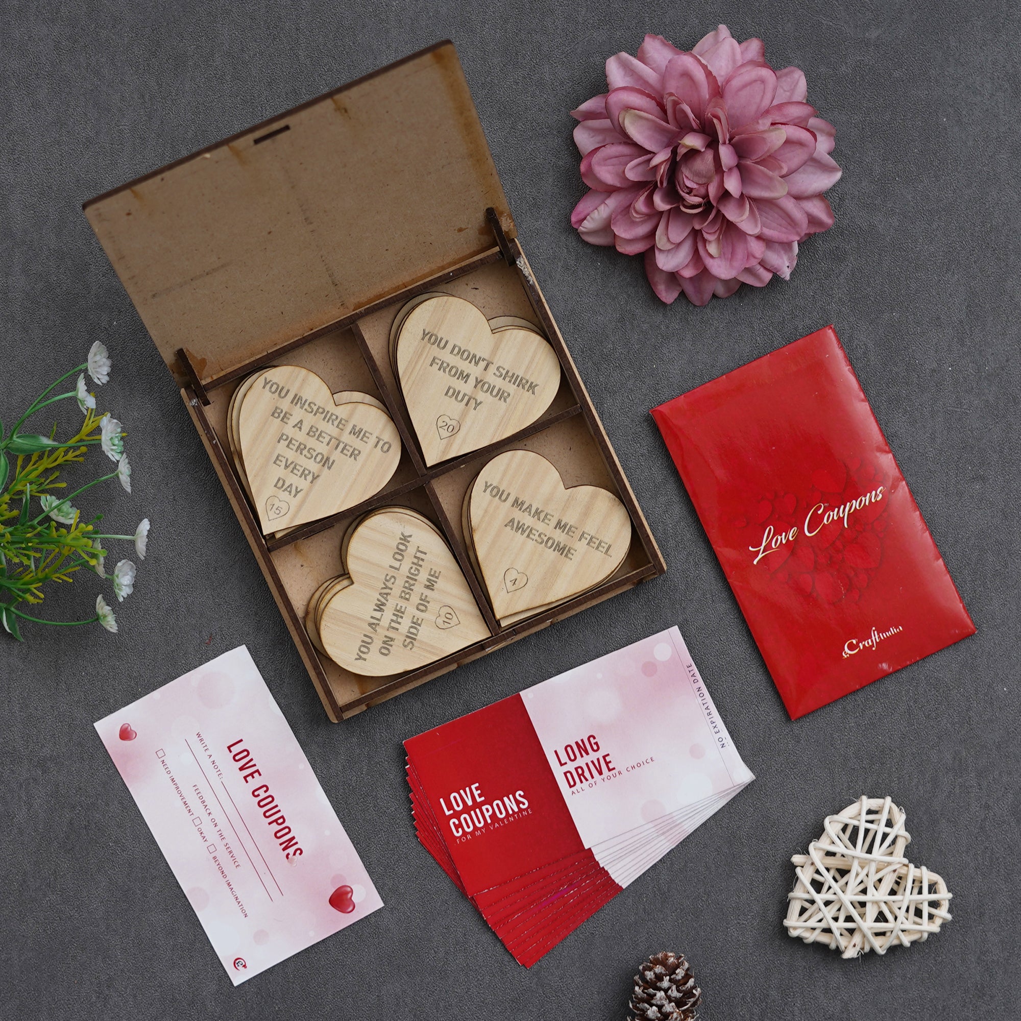 Wish to make your loved one feel on top of the world? This combo consists of One Set of 12 Love Coupons Valentine Gift Cards Set, One "20 Reasons Why I Need You" Printed on Little Hearts Valentine Brown Wooden Gift Set. At eCraftIndia, you can come across various Valentine's gift set combos that would for sure make your partner feel more loved & connected to you. These gift sets have various variations that you can select according to your occasion or celebration. Further, these are made with much thought by our skilled artists just so you can make your loved one feel special always!