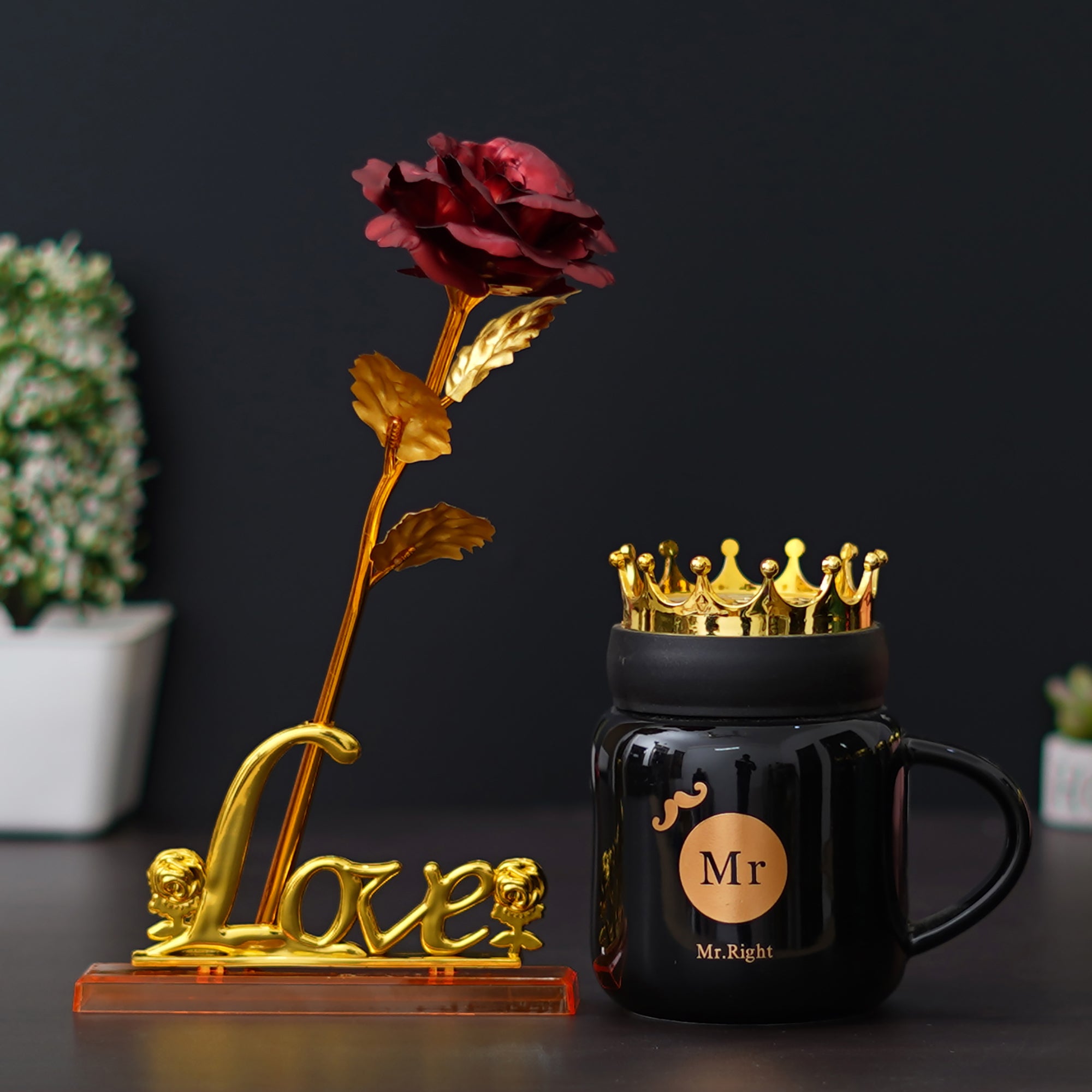 Wish to make your loved one feel on top of the world? This combo consists of One "Mr. Right" Printed Valentine Ceramic Black Mug with Golden Crown, One Love Golden Red Rose Table Decor Valentine Gift Set Showpiece. At eCraftIndia, you can come across various Valentine's gift set combos that would for sure make your partner feel more loved & connected to you. These gift sets have various variations that you can select according to your occasion or celebration. Further, these are made with much thought by our skilled artists just so you can make your loved one feel special always!