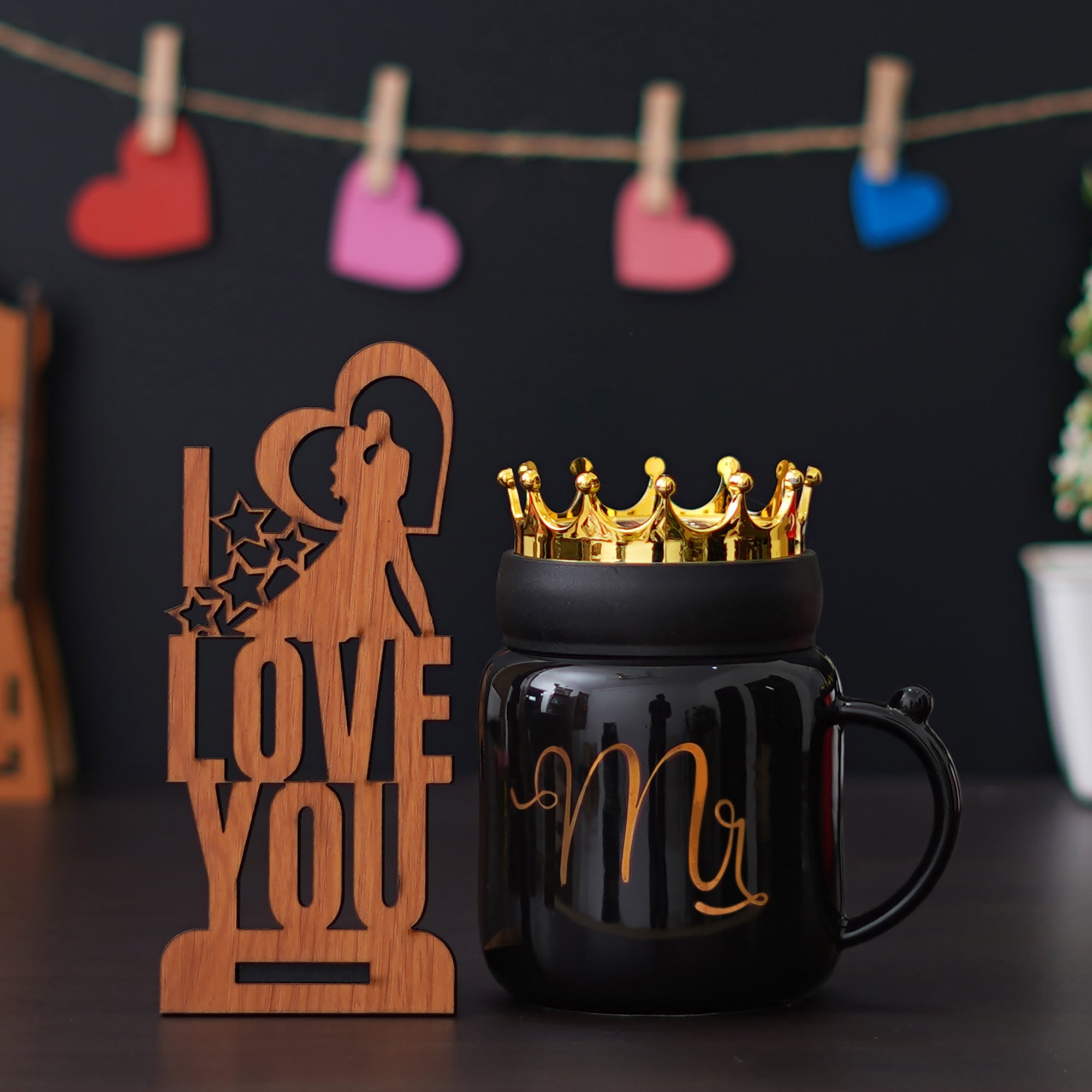 Wish to make your loved one feel on top of the world? This combo consists of One "Mr." Printed Valentine Ceramic Black Mug with Golden Crown, One "Love You" Valentine Wooden Showpiece With Stand. At eCraftIndia, you can come across various Valentine's gift set combos that would for sure make your partner feel more loved & connected to you. These gift sets have various variations that you can select according to your occasion or celebration. Further, these are made with much thought by our skilled artists just so you can make your loved one feel special always!
