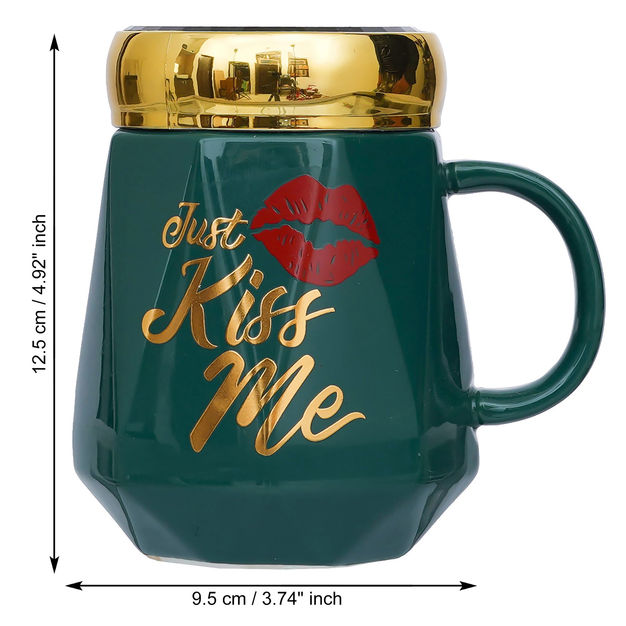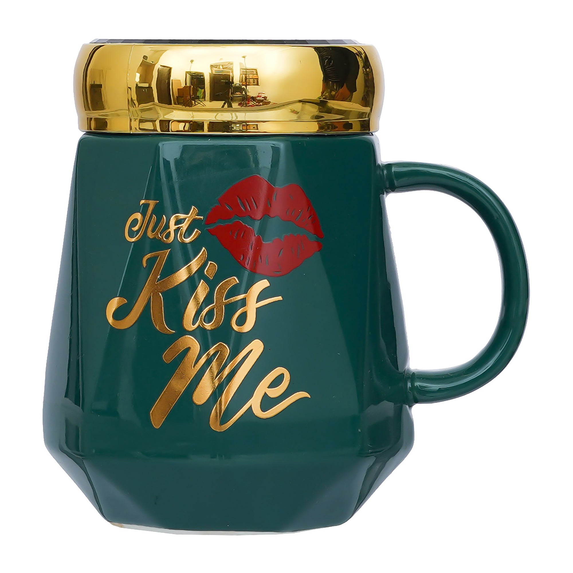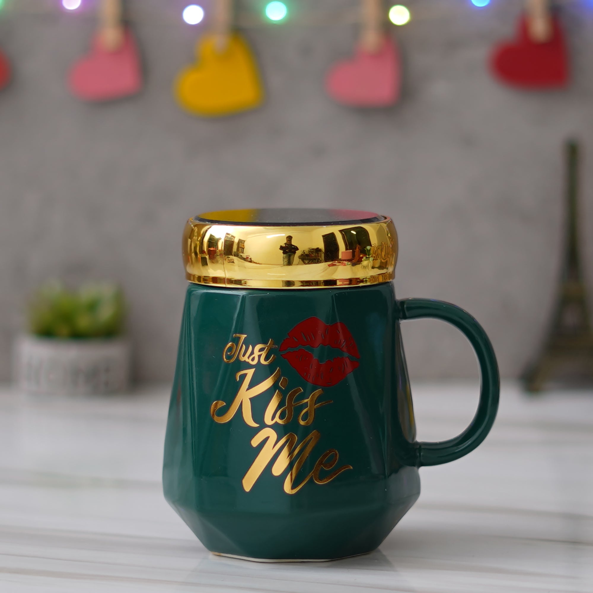 "Just Kiss Me" Printed Valentine Ceramic Green Mug with Golden Lid