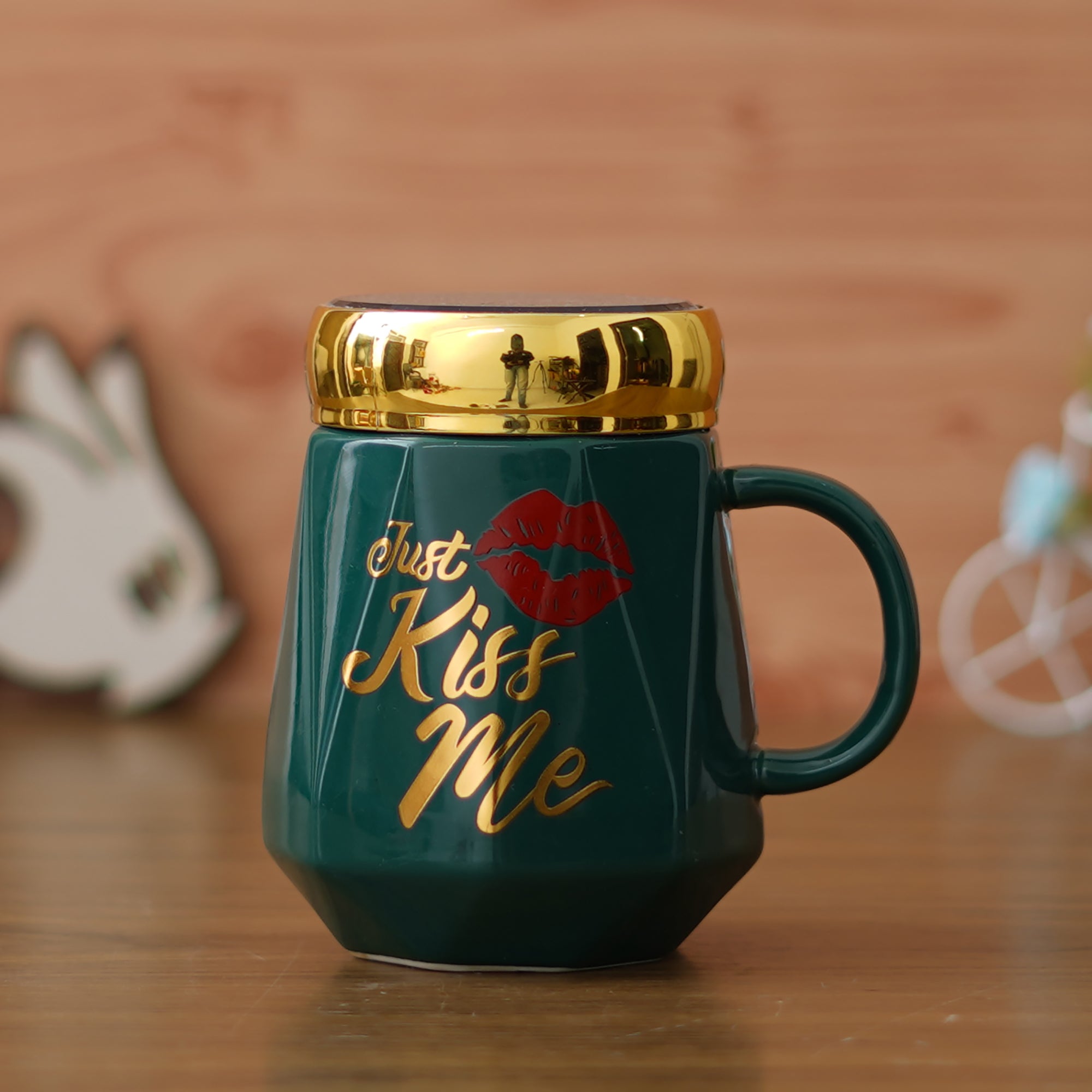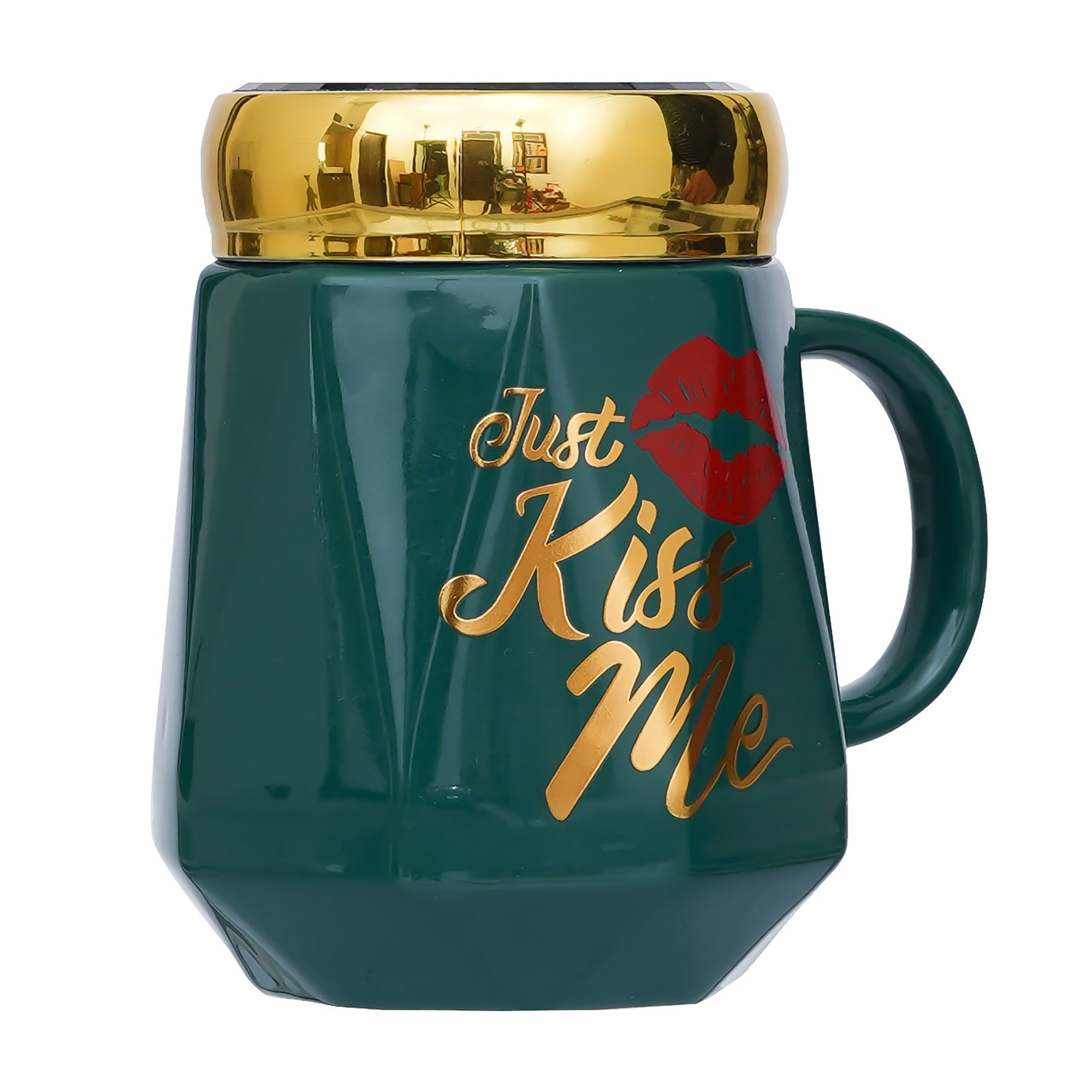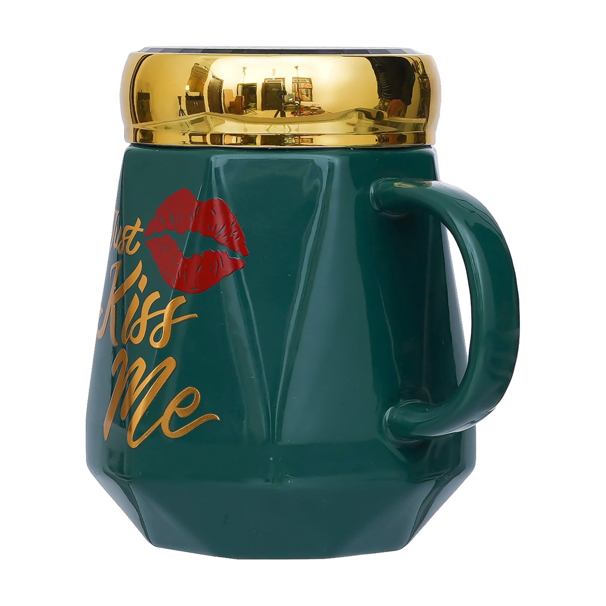 "Just Kiss Me" Printed Valentine Ceramic Green Mug with Golden Lid