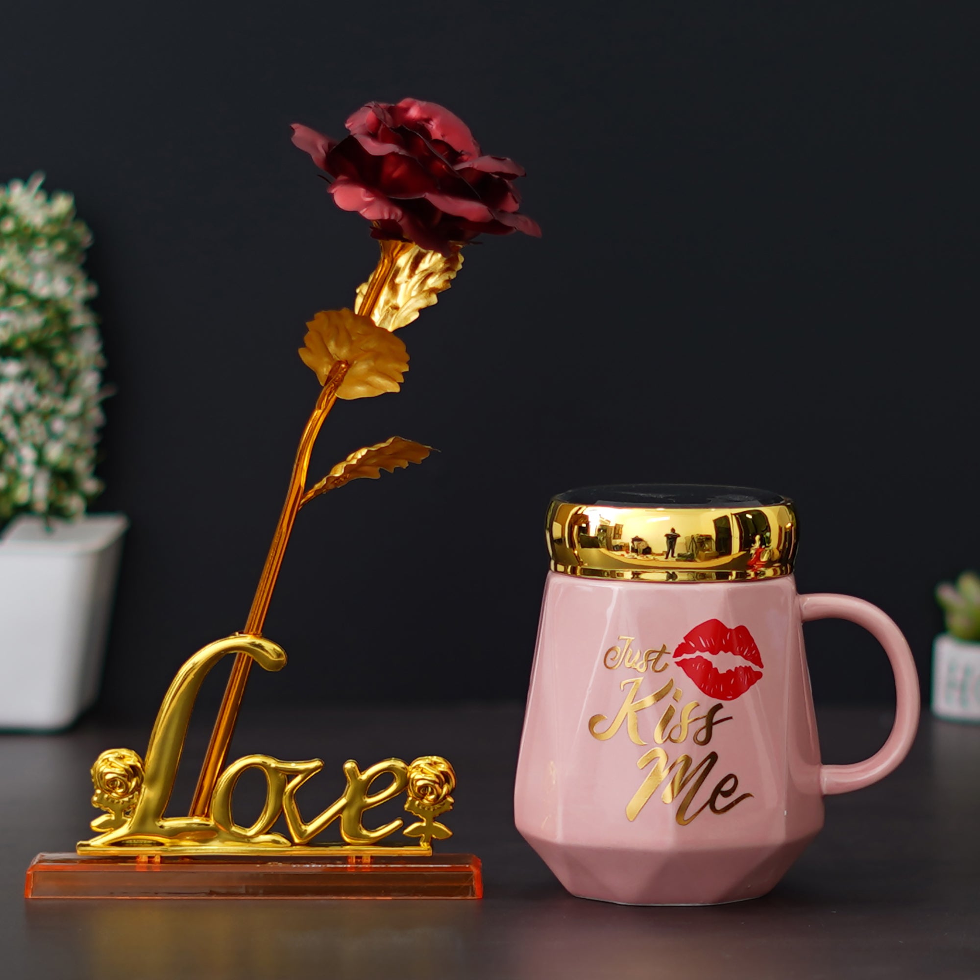 Wish to make your loved one feel on top of the world? This combo consists of One "Just Kiss Me" Printed Valentine Ceramic Pink Mug with Golden Lid, One Love Golden Red Rose Table Decor Valentine Gift Set Showpiece. At eCraftIndia, you can come across various Valentine's gift set combos that would for sure make your partner feel more loved & connected to you. These gift sets have various variations that you can select according to your occasion or celebration. Further, these are made with much thought by our skilled artists just so you can make your loved one feel special always!