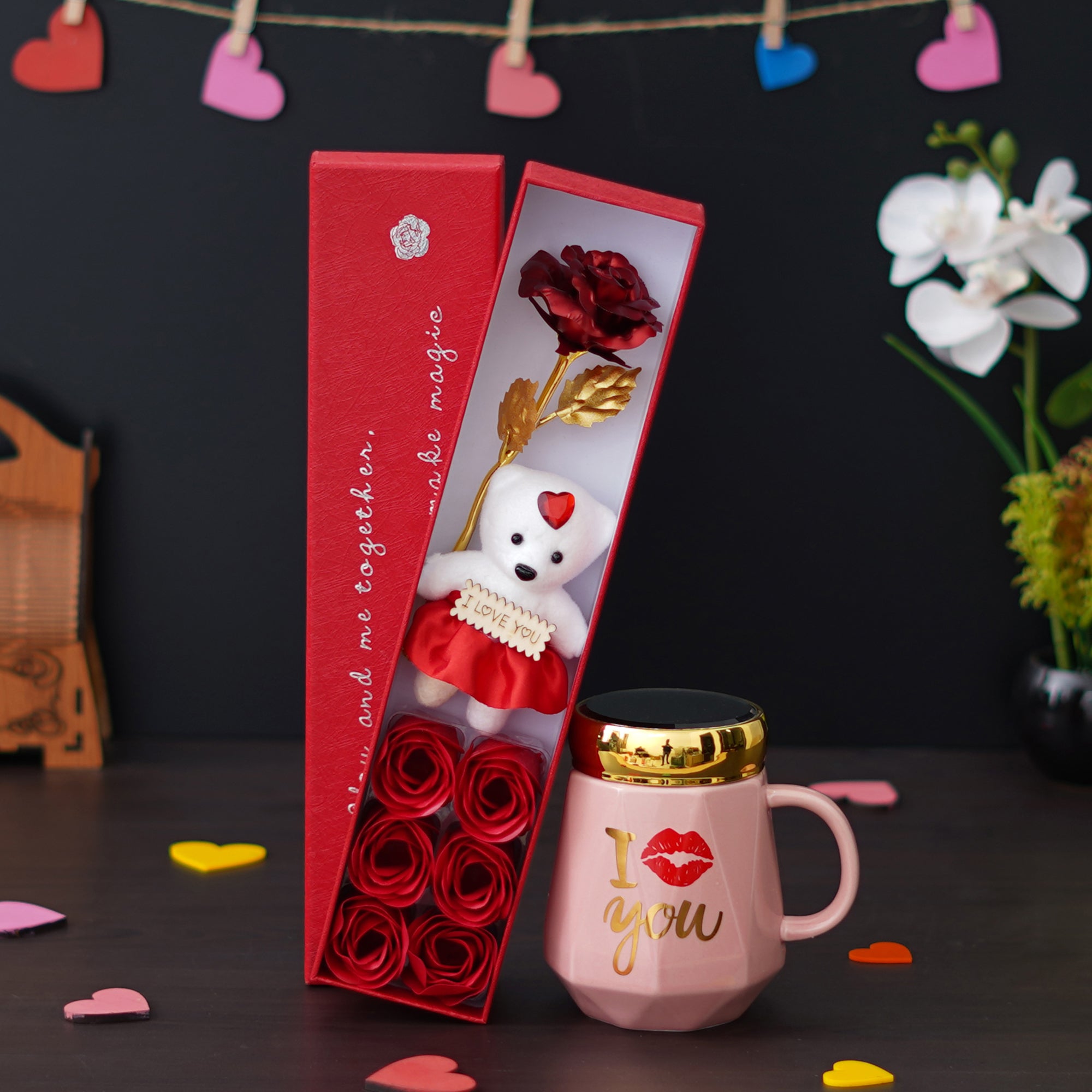 Wish to make your loved one feel on top of the world? This combo consists of One "I Love You" Printed Valentine Ceramic Pink Mug with Golden Lid, One Red Valentine Gift Box with Teddy, Red Flower and 6 Roses. At eCraftIndia, you can come across various Valentine's gift set combos that would for sure make your partner feel more loved & connected to you. These gift sets have various variations that you can select according to your occasion or celebration. Further, these are made with much thought by our skilled artists just so you can make your loved one feel special always!