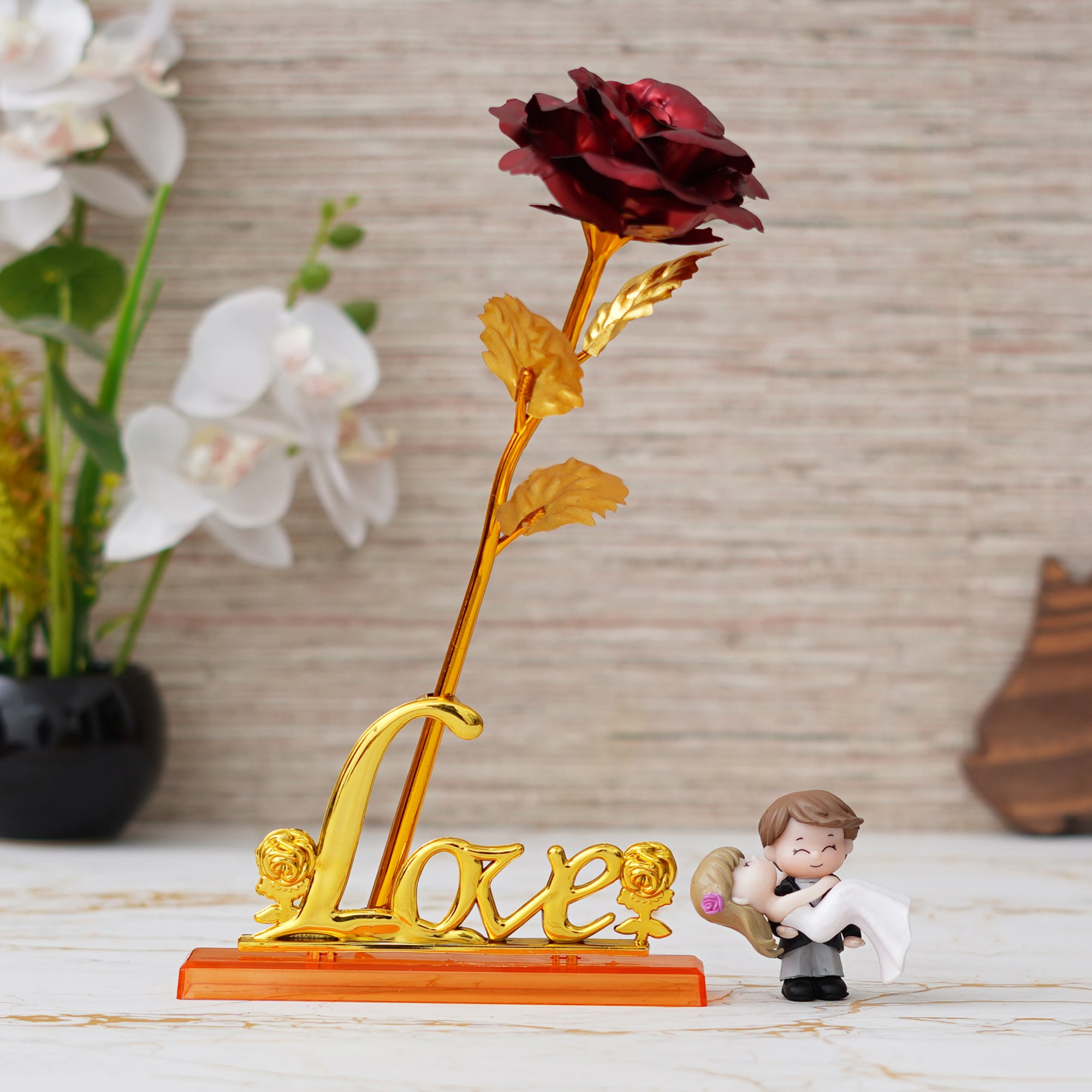 Wish to make your loved one feel on top of the world? This combo consists of One Love Golden Red Rose Table Decor Valentine Gift Set Showpiece, One Bride Kissing Groom Romantic Polyresin Decorative Showpiece. At eCraftIndia, you can come across various Valentine's gift set combos that would for sure make your partner feel more loved & connected to you. These gift sets have various variations that you can select according to your occasion or celebration. Further, these are made with much thought by our skilled artists just so you can make your loved one feel special always!