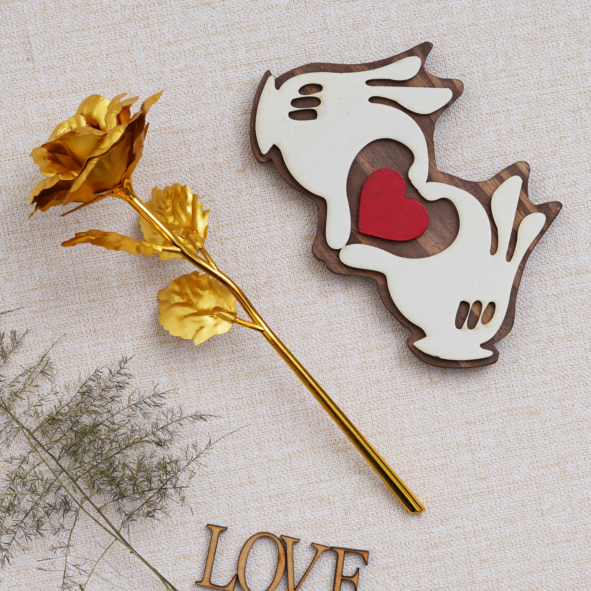 Wish to make your loved one feel on top of the world? This combo consists of One Golden Rose Valentine Gift Set, One Hands Showcasing Red Heart Valentine Gift Set Wooden Decorative. At eCraftIndia, you can come across various Valentine's gift set combos that would for sure make your partner feel more loved & connected to you. These gift sets have various variations that you can select according to your occasion or celebration. Further, these are made with much thought by our skilled artists just so you can make your loved one feel special always!