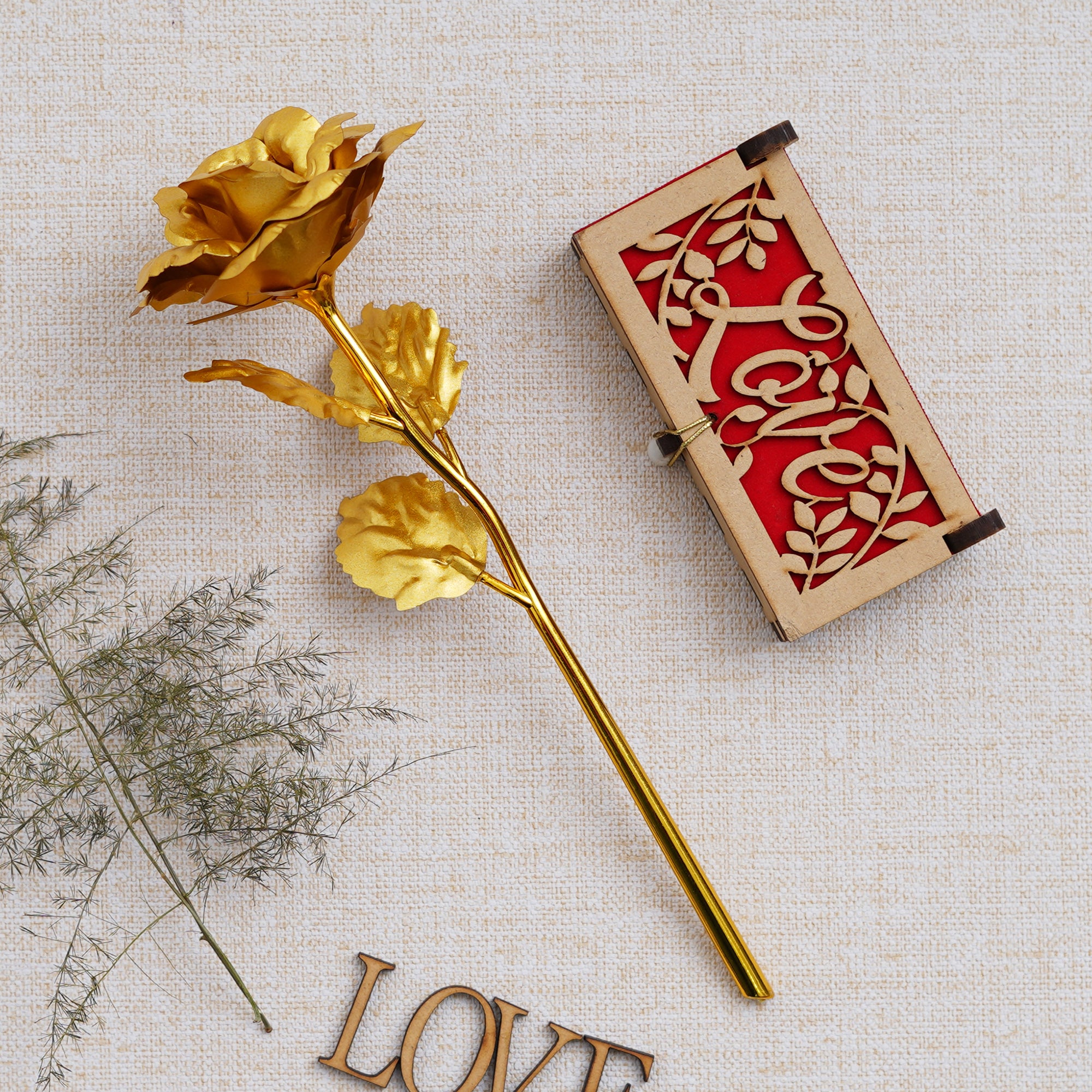 Wish to make your loved one feel on top of the world? This combo consists of One Golden Rose Valentine Gift Set, One "Love" Valentine Wooden Gift Box. At eCraftIndia, you can come across various Valentine's gift set combos that would for sure make your partner feel more loved & connected to you. These gift sets have various variations that you can select according to your occasion or celebration. Further, these are made with much thought by our skilled artists just so you can make your loved one feel special always!