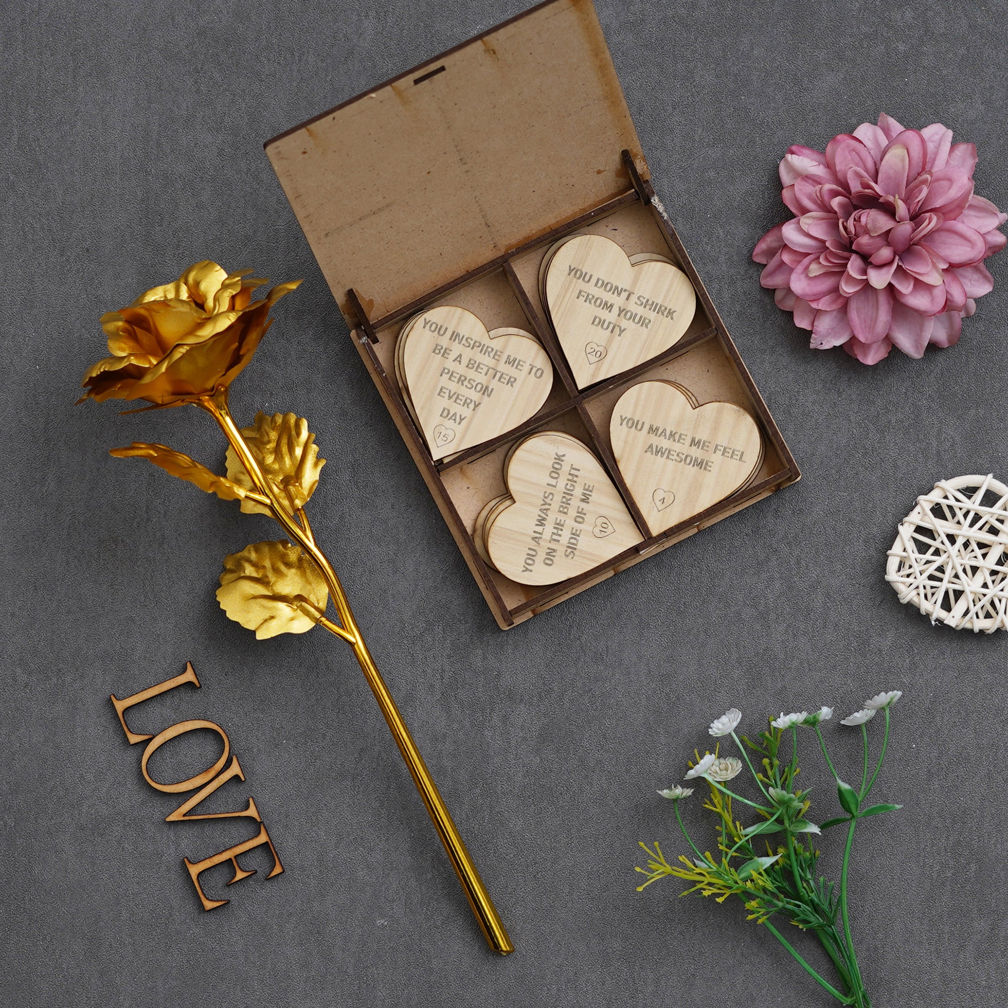 Wish to make your loved one feel on top of the world? This combo consists of One Golden Rose Valentine Gift Set, One "20 Reasons Why I Need You" Printed on Little Hearts Valentine Brown Wooden Gift Set. At eCraftIndia, you can come across various Valentine's gift set combos that would for sure make your partner feel more loved & connected to you. These gift sets have various variations that you can select according to your occasion or celebration. Further, these are made with much thought by our skilled artists just so you can make your loved one feel special always!