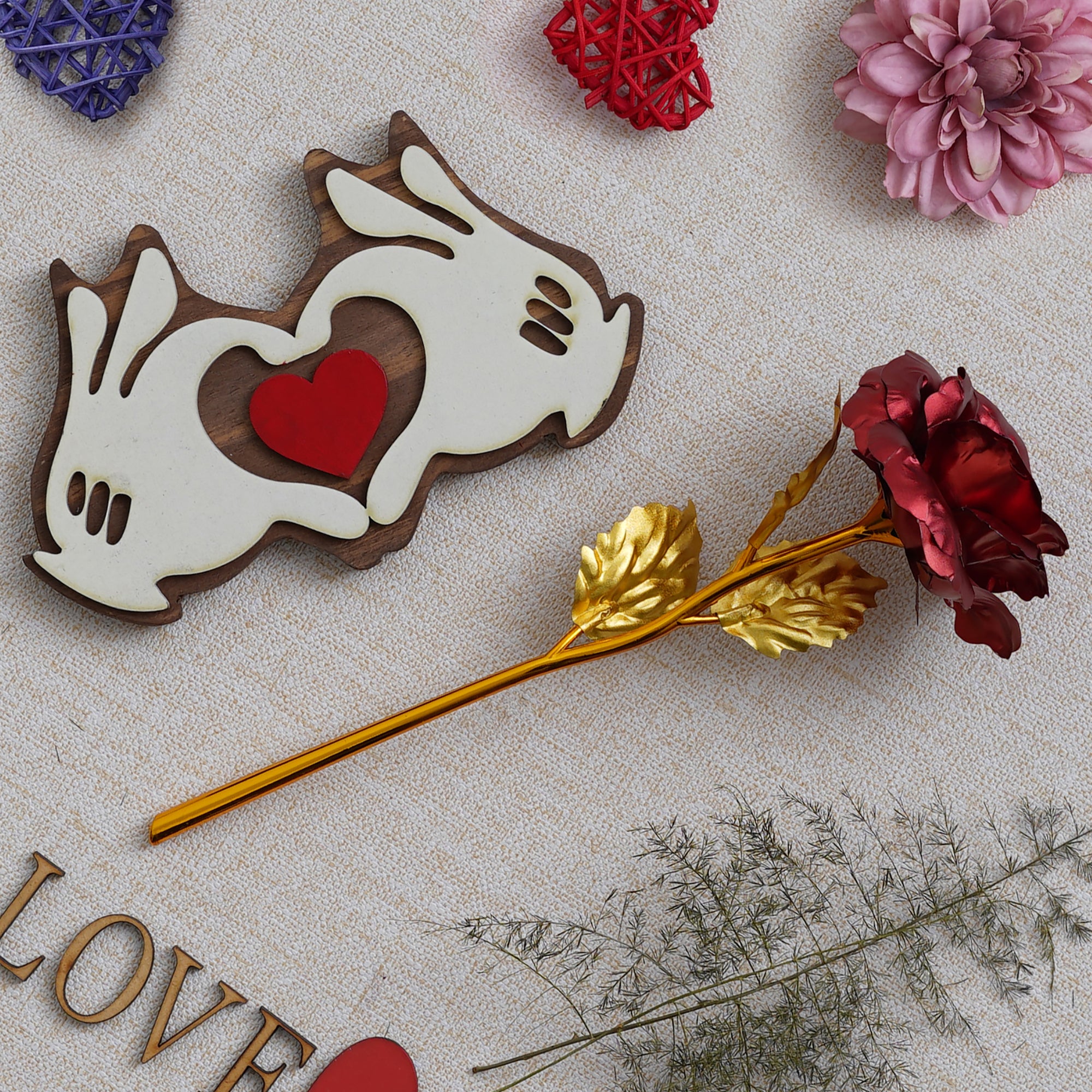 Wish to make your loved one feel on top of the world? This combo consists of One Golden Red Rose Valentine Gift Set, One Hands Showcasing Red Heart Valentine Gift Set Wooden Decorative. At eCraftIndia, you can come across various Valentine's gift set combos that would for sure make your partner feel more loved & connected to you. These gift sets have various variations that you can select according to your occasion or celebration. Further, these are made with much thought by our skilled artists just so you can make your loved one feel special always!