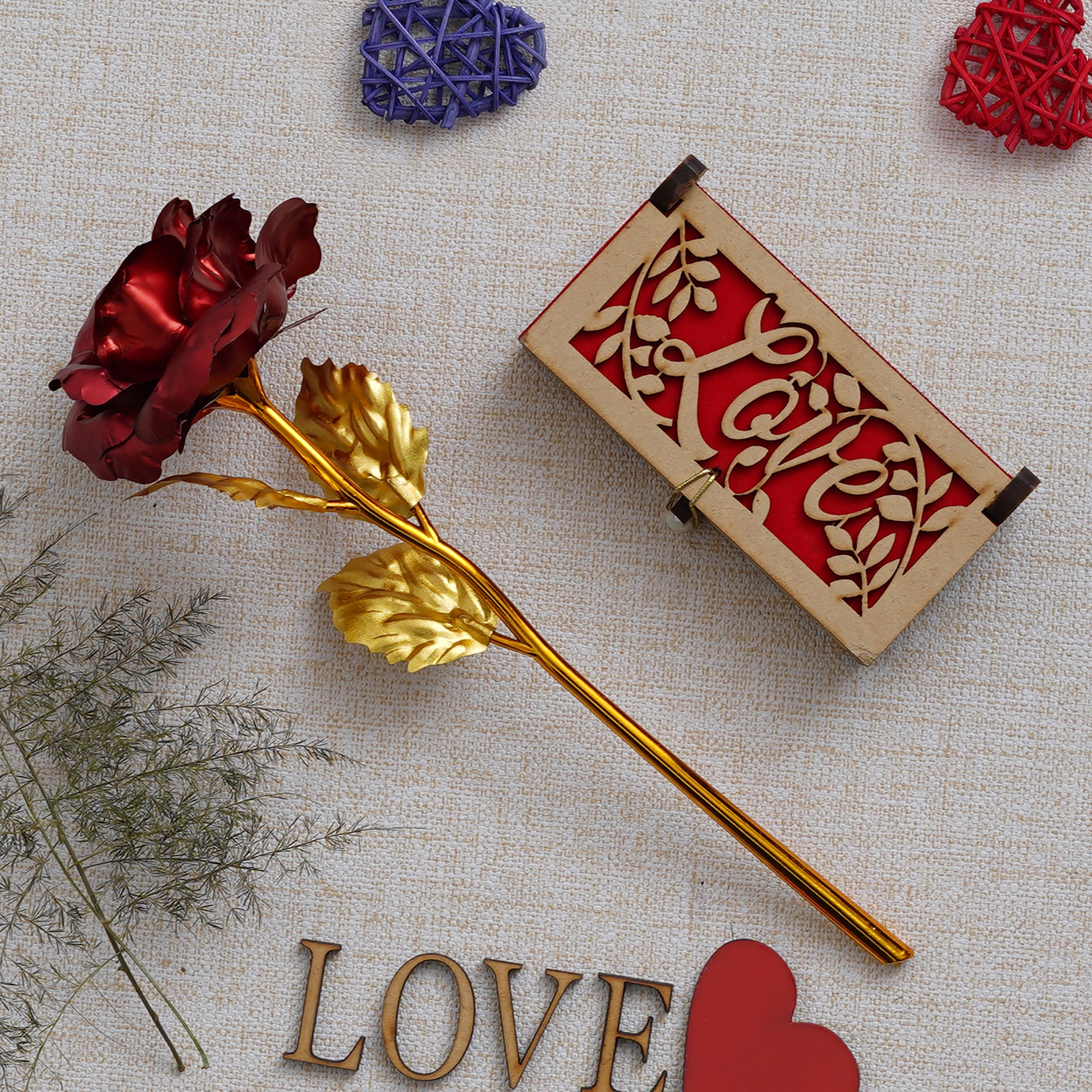 Wish to make your loved one feel on top of the world? This combo consists of One Golden Red Rose Valentine Gift Set, One "Love" Valentine Wooden Gift Box. At eCraftIndia, you can come across various Valentine's gift set combos that would for sure make your partner feel more loved & connected to you. These gift sets have various variations that you can select according to your occasion or celebration. Further, these are made with much thought by our skilled artists just so you can make your loved one feel special always!