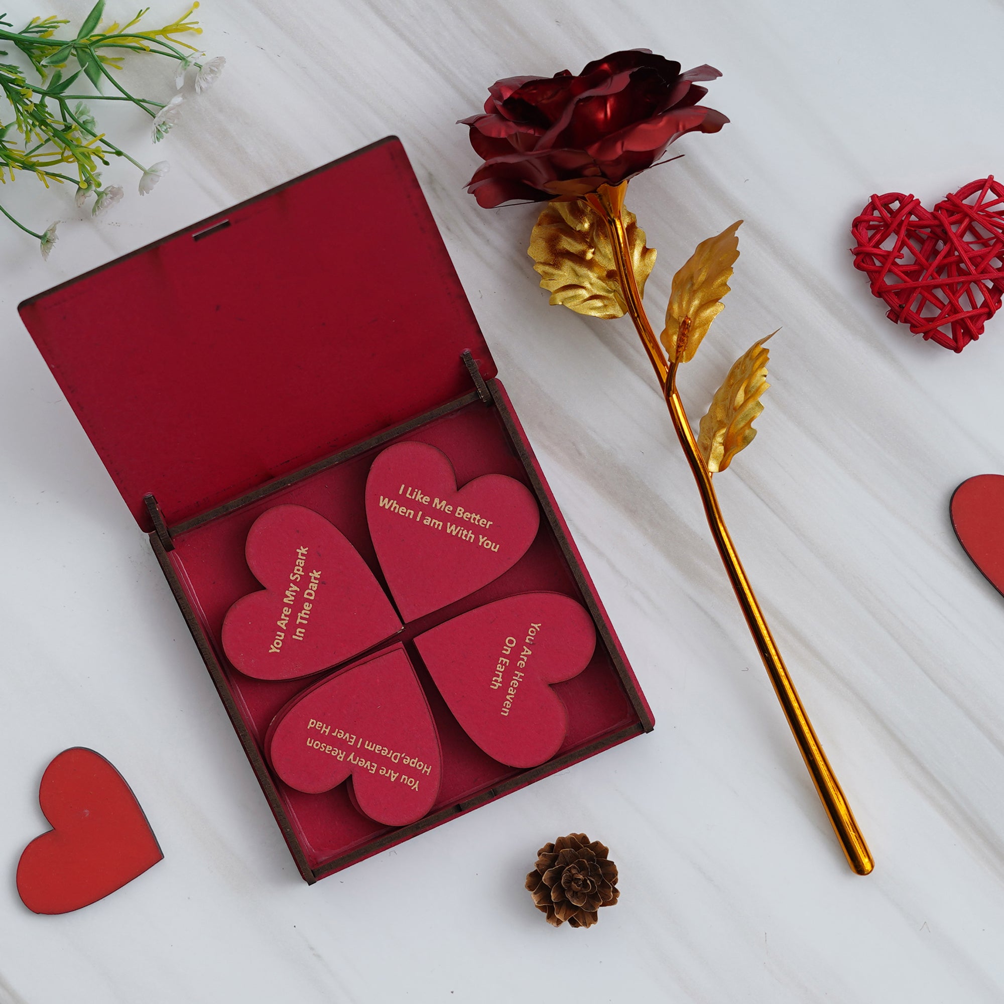 Wish to make your loved one feel on top of the world? This combo consists of One Golden Red Rose Valentine Gift Set, One "20 Reasons Why I Love You" Printed on Little Red Hearts Decorative Valentine Wooden Gift Set Box. At eCraftIndia, you can come across various Valentine's gift set combos that would for sure make your partner feel more loved & connected to you. These gift sets have various variations that you can select according to your occasion or celebration. Further, these are made with much thought by our skilled artists just so you can make your loved one feel special always!