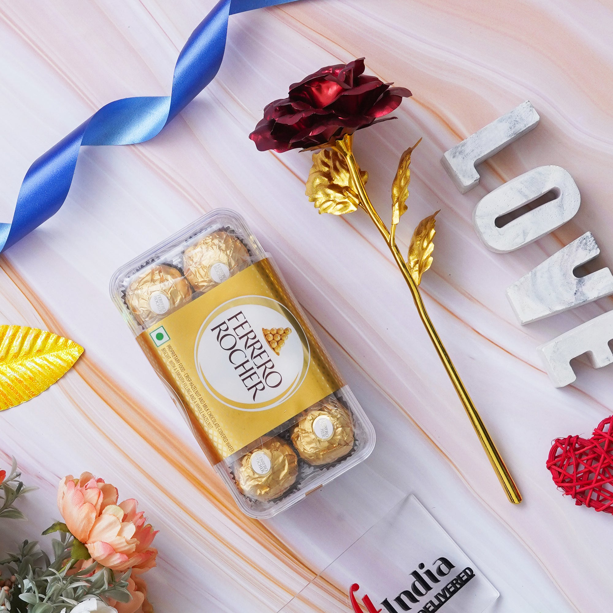 Package Content - One eCraftIndia Golden Red Rose Valentine's Gift & Ferrero Rocher Chocolates (8 pcs)