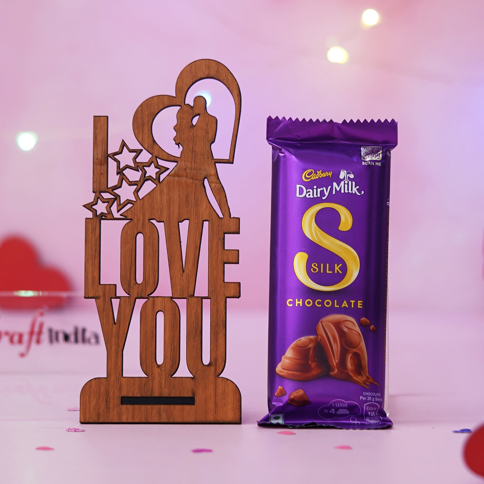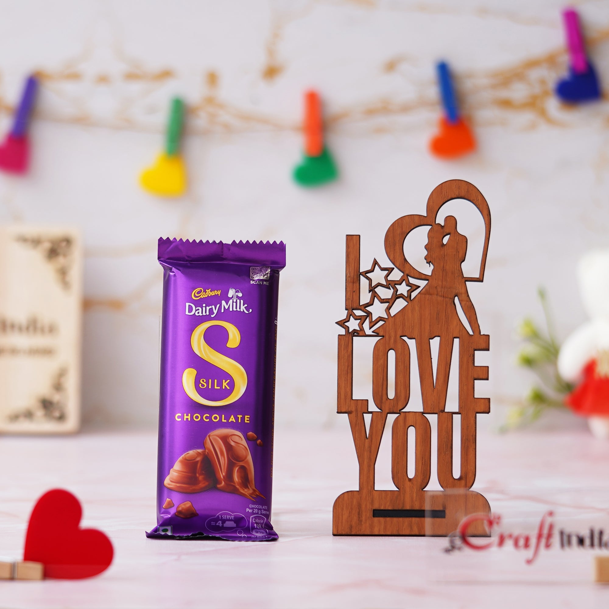 Product Description - Express your love and affection with Cadbury Dairy Milk Silk Chocolate and the "I Love You" Valentine Wooden Showpiece With a Stand. Crafted from high-quality wood, this showpiece features the phrase "Love You" intricately carved in a beautiful font. The warm brown color adds a touch of elegance to any decor style. Perfect for gifting on special occasions like Valentine's Day, anniversaries, or birthdays, this showpiece conveys heartfelt emotions to your loved ones. Place it on a shelf, tabletop, or mantel to create a loving and romantic ambiance in your home. This decorative item is a symbol of love and makes a thoughtful gift for your partner, family, or friends.