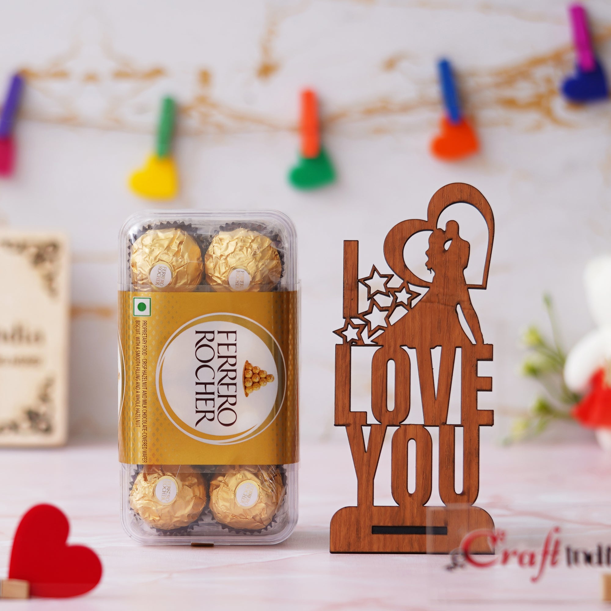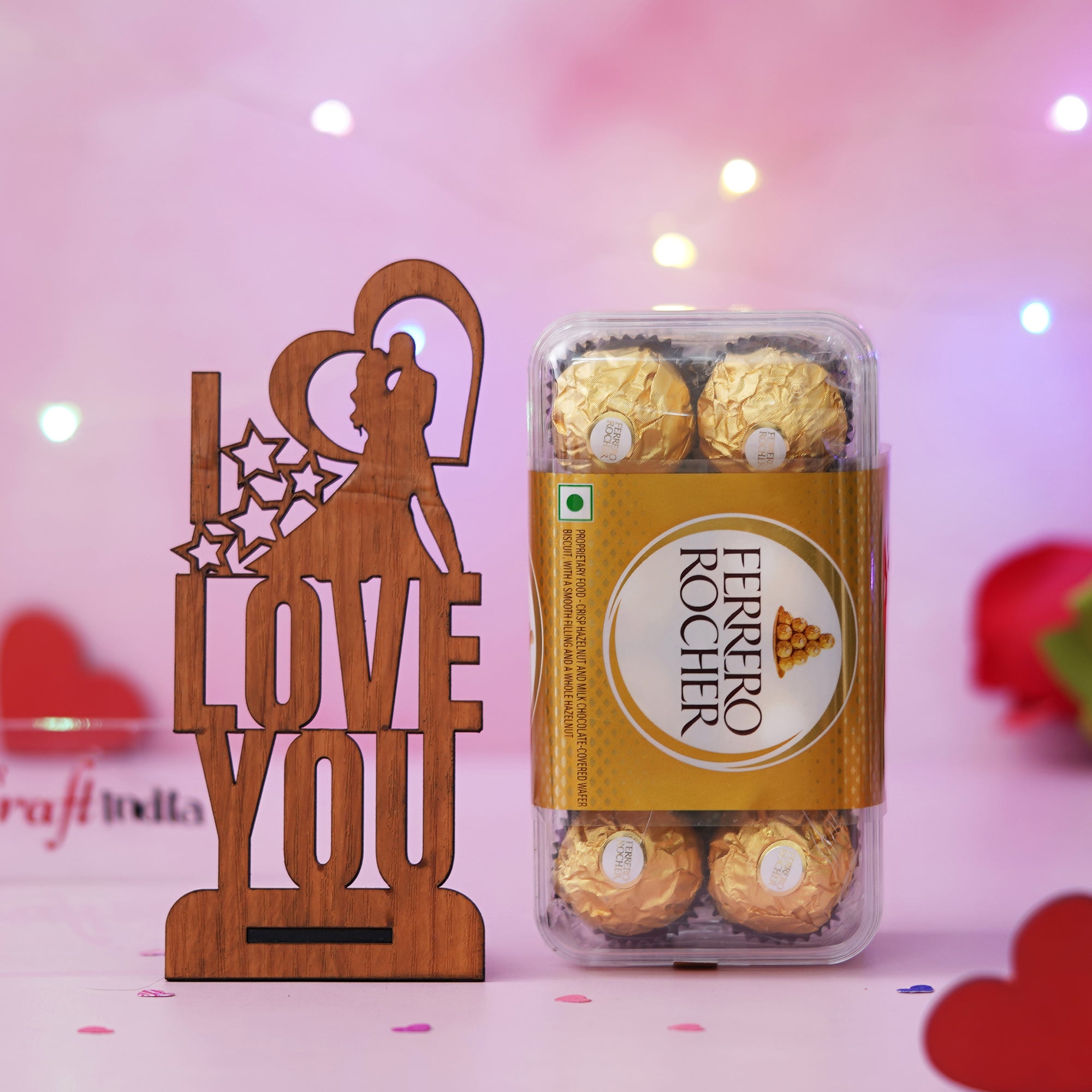 Product Description - Express your love and affection with Ferrero Rocher Chocolates (8 pcs) and "I Love You" Valentine Wooden Showpiece With a Stand. Crafted from high-quality wood, this showpiece features the phrase "Love You" intricately carved in a beautiful font. The warm brown color adds a touch of elegance to any decor style. Perfect for gifting on special occasions like Valentine's Day, anniversaries, or birthdays, this showpiece conveys heartfelt emotions to your loved ones. Place it on a shelf, tabletop, or mantel to create a loving and romantic ambiance in your home. This decorative item is a symbol of love and makes a thoughtful gift for your partner, family, or friends.
