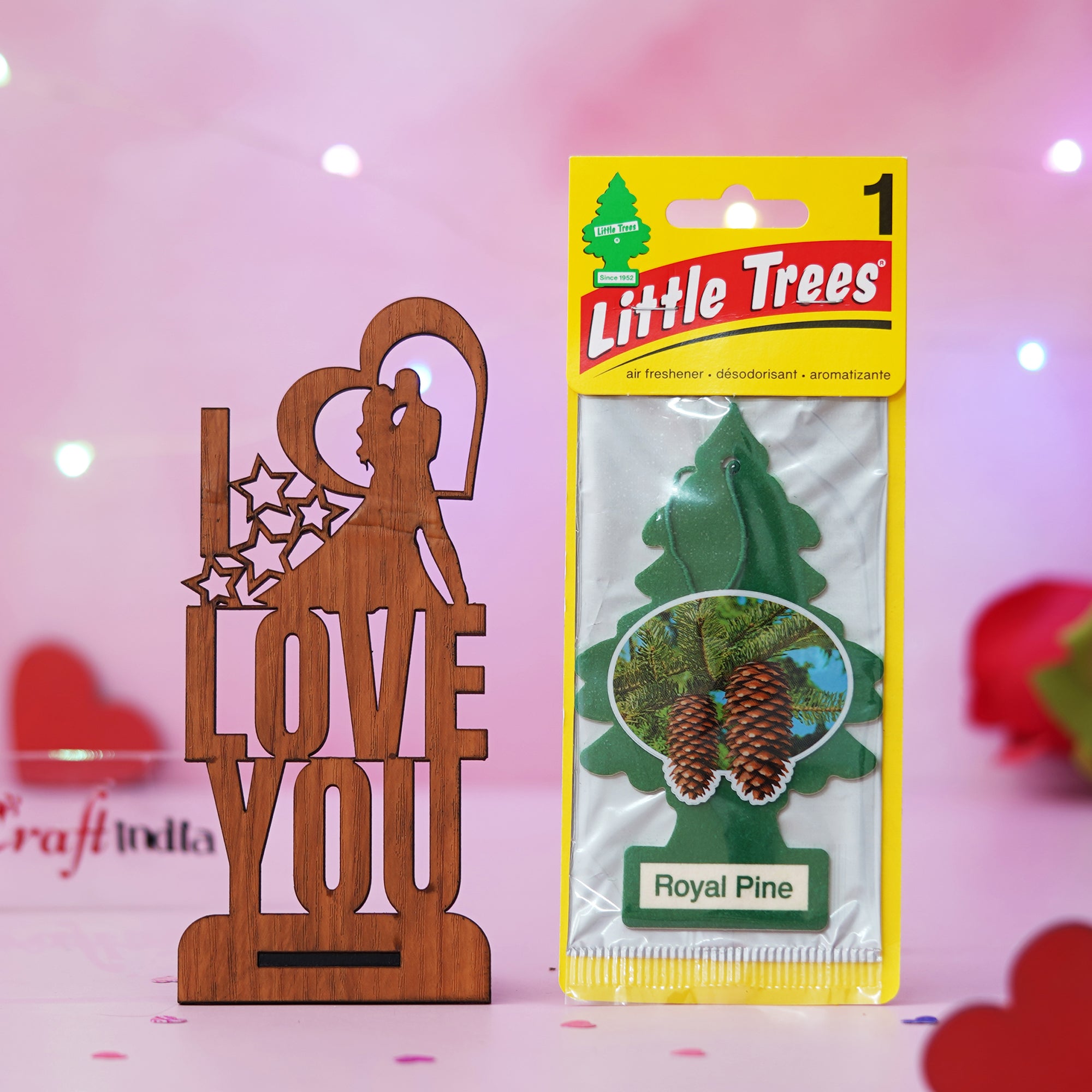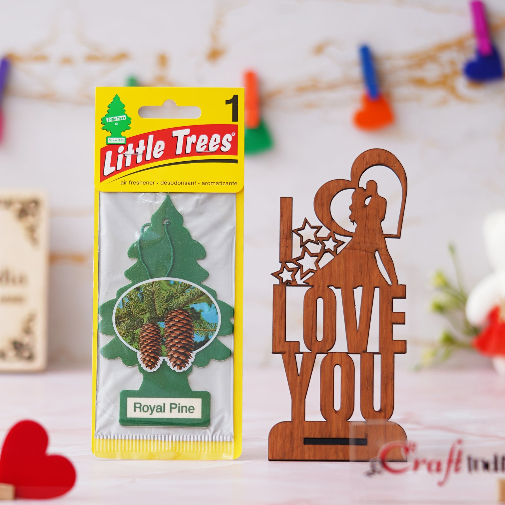 Product Description - Express your love and affection with Little Trees Air Freshener Royal Pine Pack of 1 and "I Love You" Valentine Wooden Showpiece With a Stand. Crafted from high-quality wood, this showpiece features the phrase "Love You" intricately carved in a beautiful font. The warm brown color adds a touch of elegance to any decor style. Perfect for gifting on special occasions like Valentine's Day, anniversaries, or birthdays, this showpiece conveys heartfelt emotions to your loved ones. Place it on a shelf, tabletop, or mantel to create a loving and romantic ambiance in your home. This decorative item is a symbol of love and makes a thoughtful gift for your partner, family, or friends.