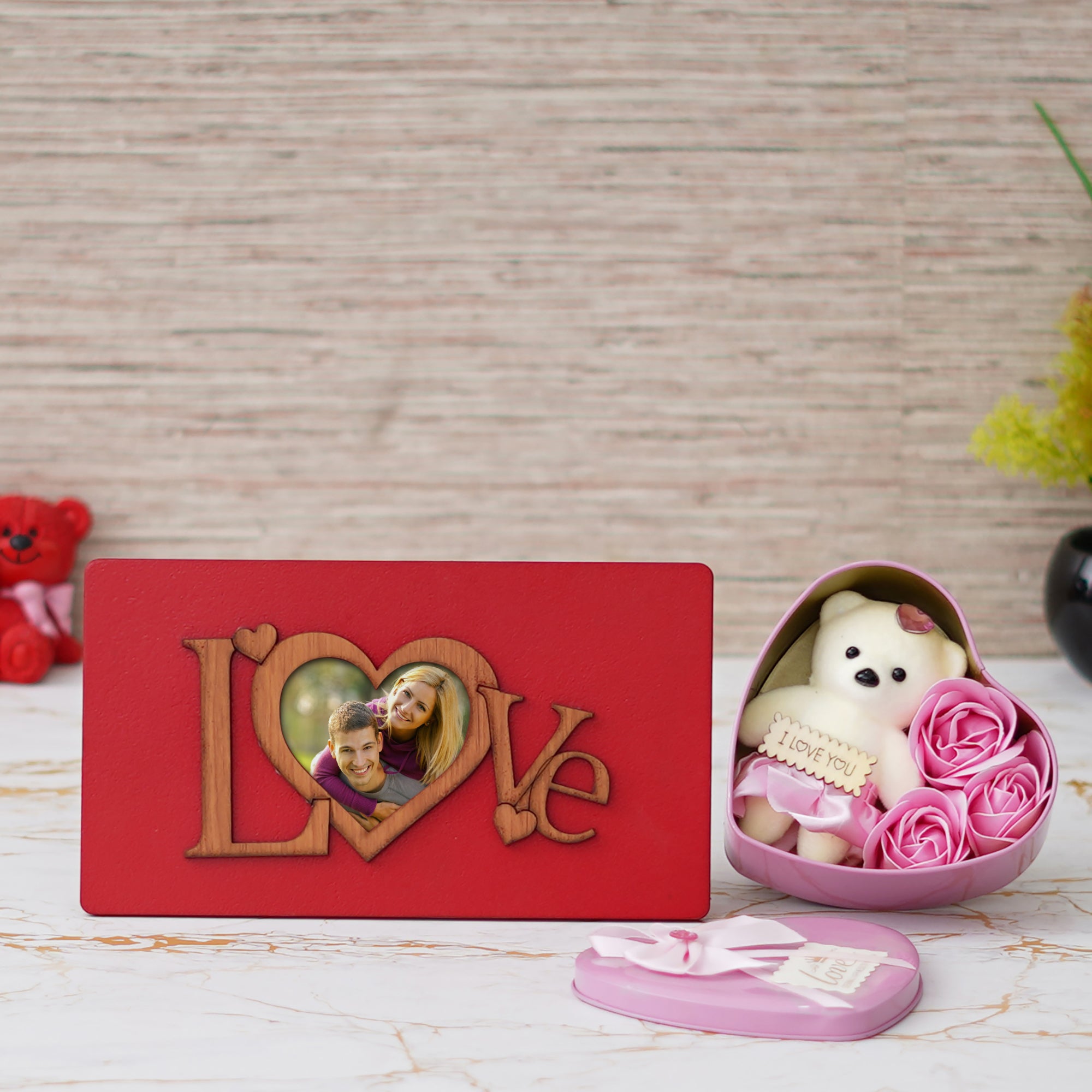 Wish to make your loved one feel on top of the world? This combo consists of One "Love" Valentine Wooden Photo Frame With Red Stand, One Pink Heart Shaped Gift Box with 3 Pink Roses, Teddy Bear and a Card. At eCraftIndia, you can come across various Valentine's gift set combos that would for sure make your partner feel more loved & connected to you. These gift sets have various variations that you can select according to your occasion or celebration. Further, these are made with much thought by our skilled artists just so you can make your loved one feel special always!