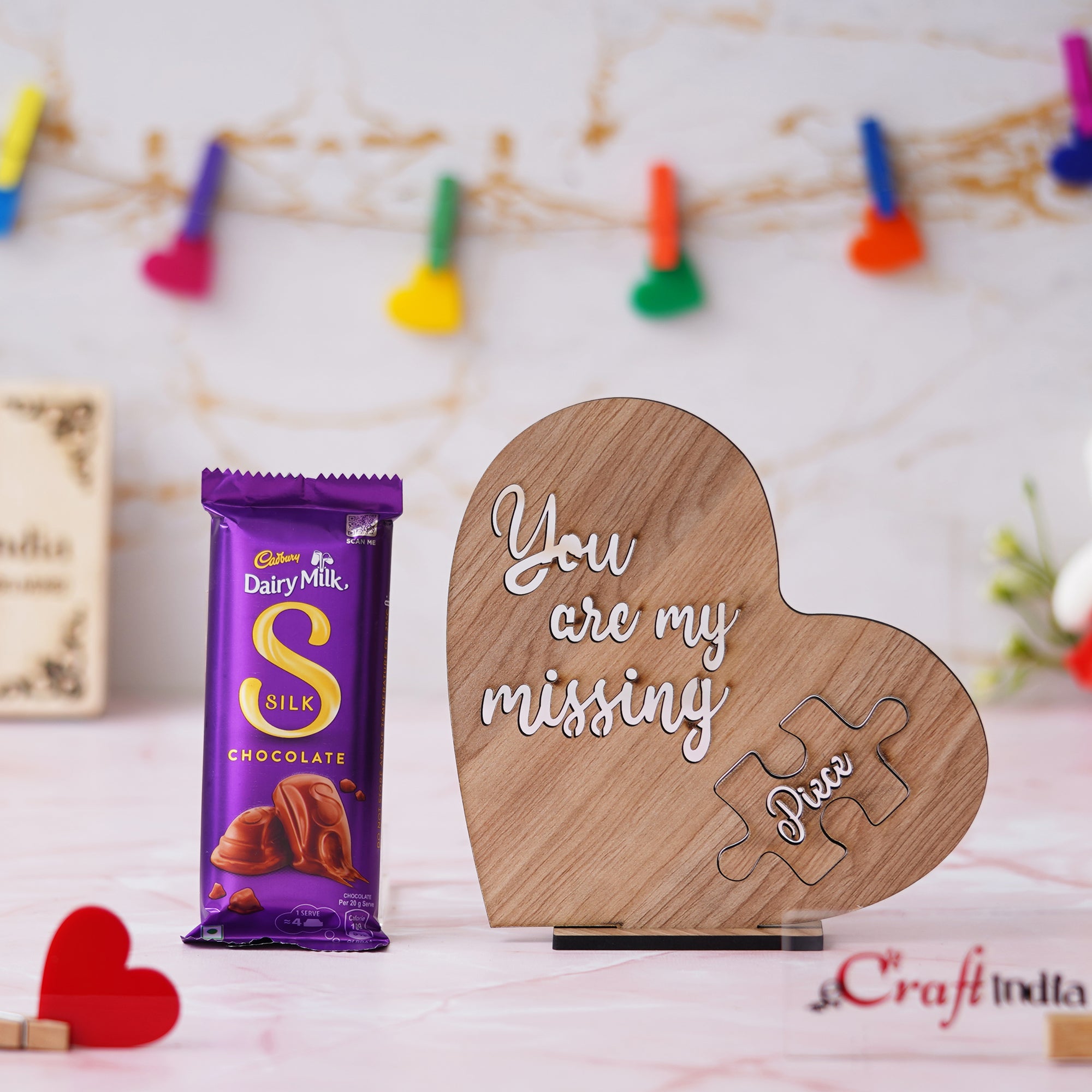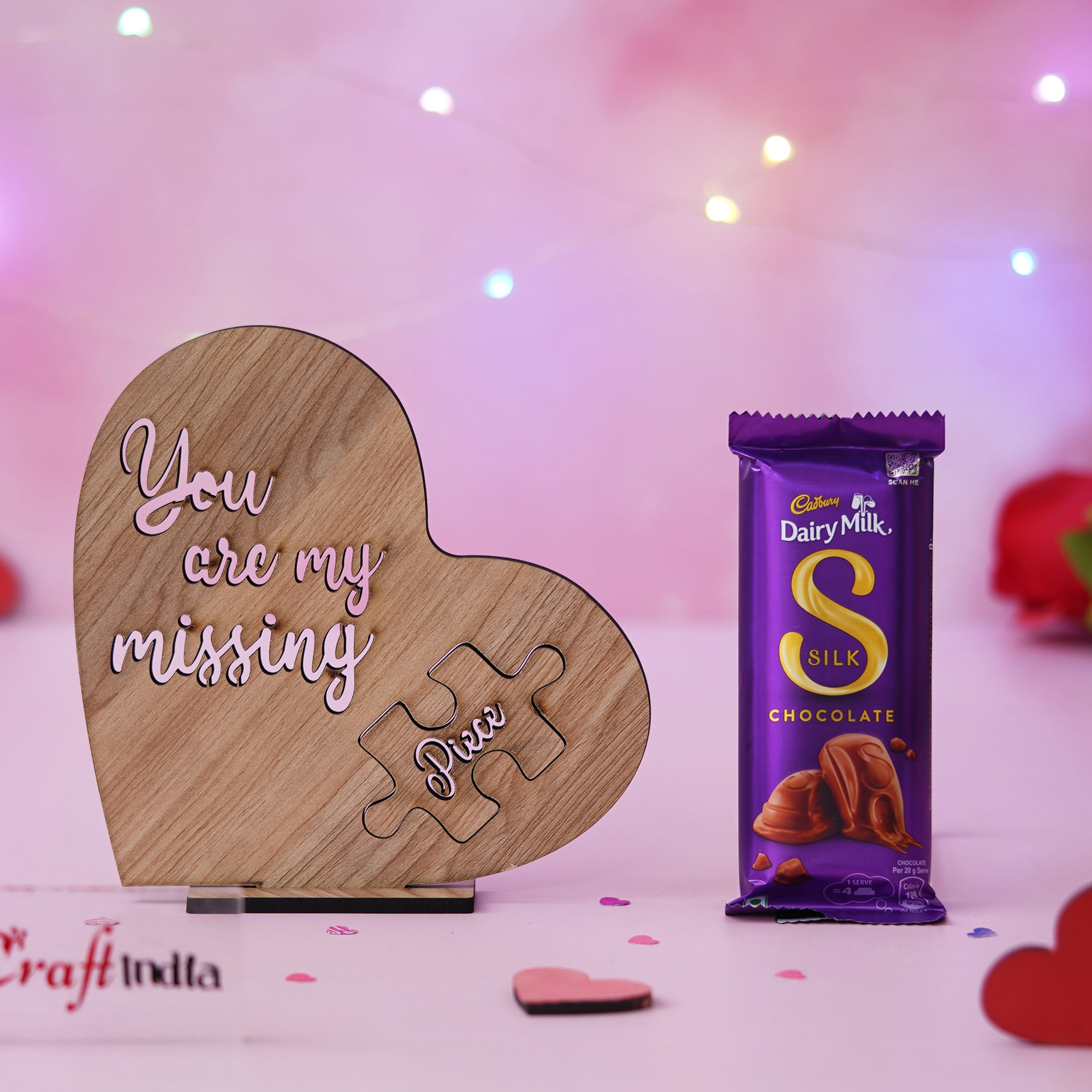 Product Description - Showpieces add a lot to your decor and make such wonderful gifts, don't you think? Cadbury Dairy Milk Silk Chocolate and wooden Heart Shaped "You Are My Missing Piece" Valentine's Day Showpiece available at eCraftIndia and comes with a stand that makes it easier for you to attach and keep as home decor. This is such a sweet present that it will undoubtedly make the recipient remember you. This will undoubtedly brighten your partner's day and elevate the present to one of their most treasured possessions. What are you still holding out for? Choose this gift, which is offered in various varieties on our online portal.