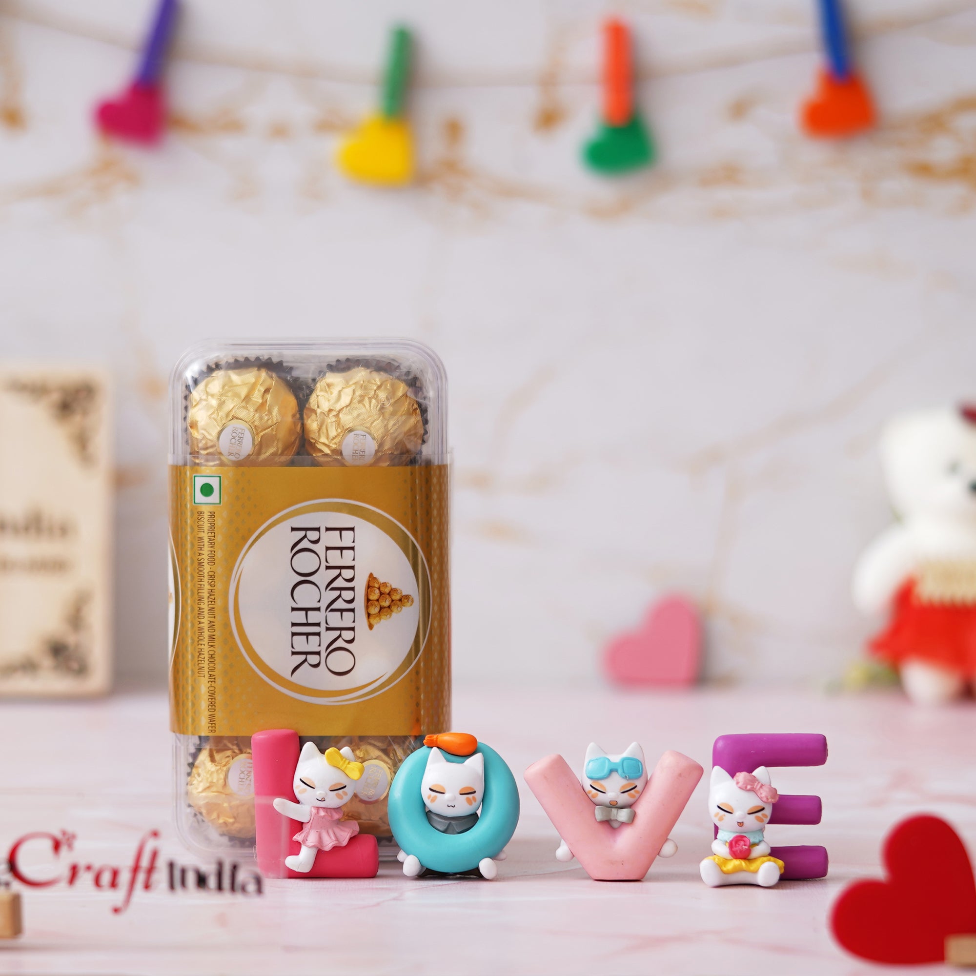 Product Description - Showpieces add a lot to your decor and make such wonderful gifts, don't you think? Ferrero Rocher Chocolates (8 pcs) and LOVE Animated Characters Decorative Showpiece available at eCraftIndia. This is such a sweet present that it will undoubtedly make the recipient remember you. This will undoubtedly brighten your partner's day and elevate the present to one of their most treasured possessions. What are you still holding out for? Choose this gift, which is offered in various figurines on our online portal.