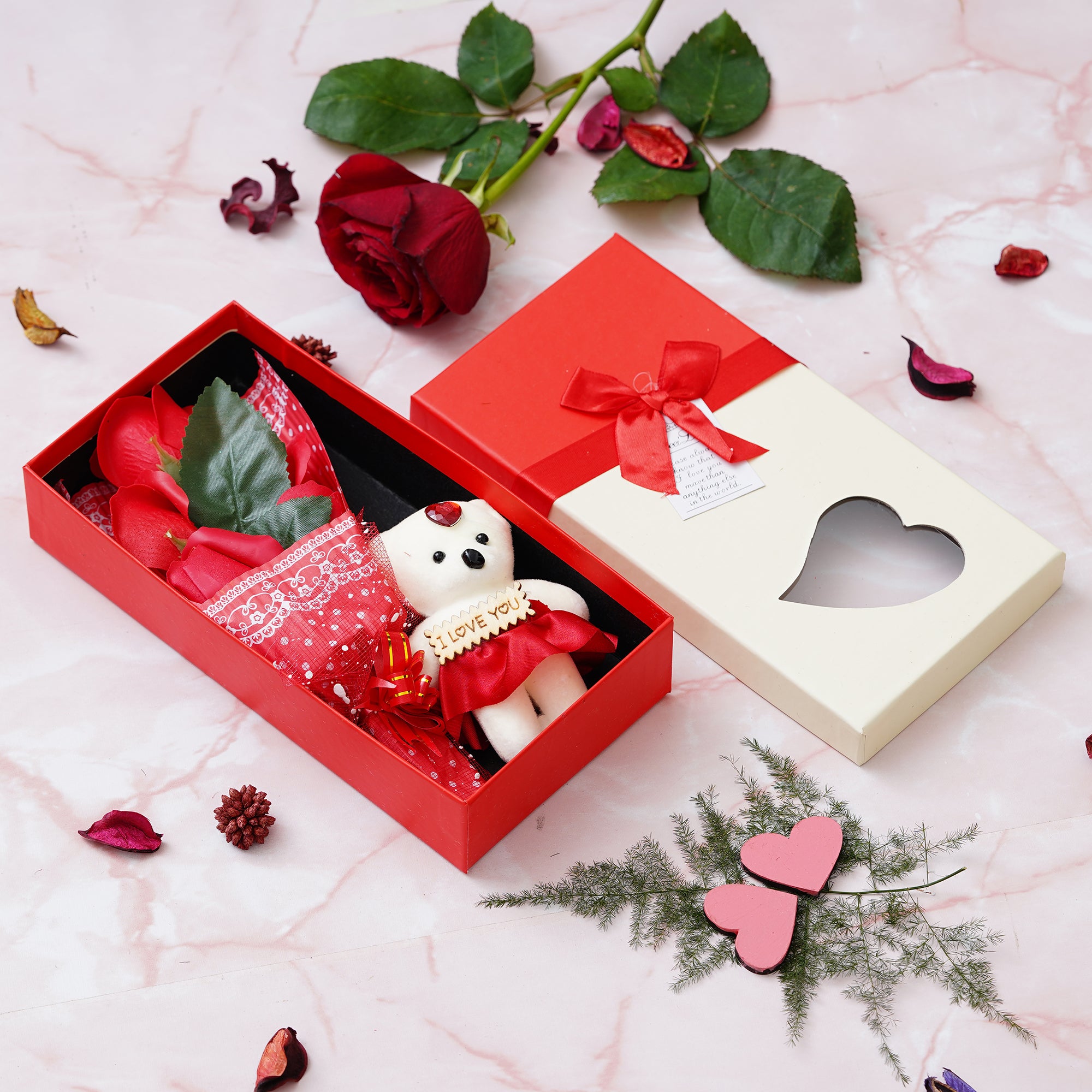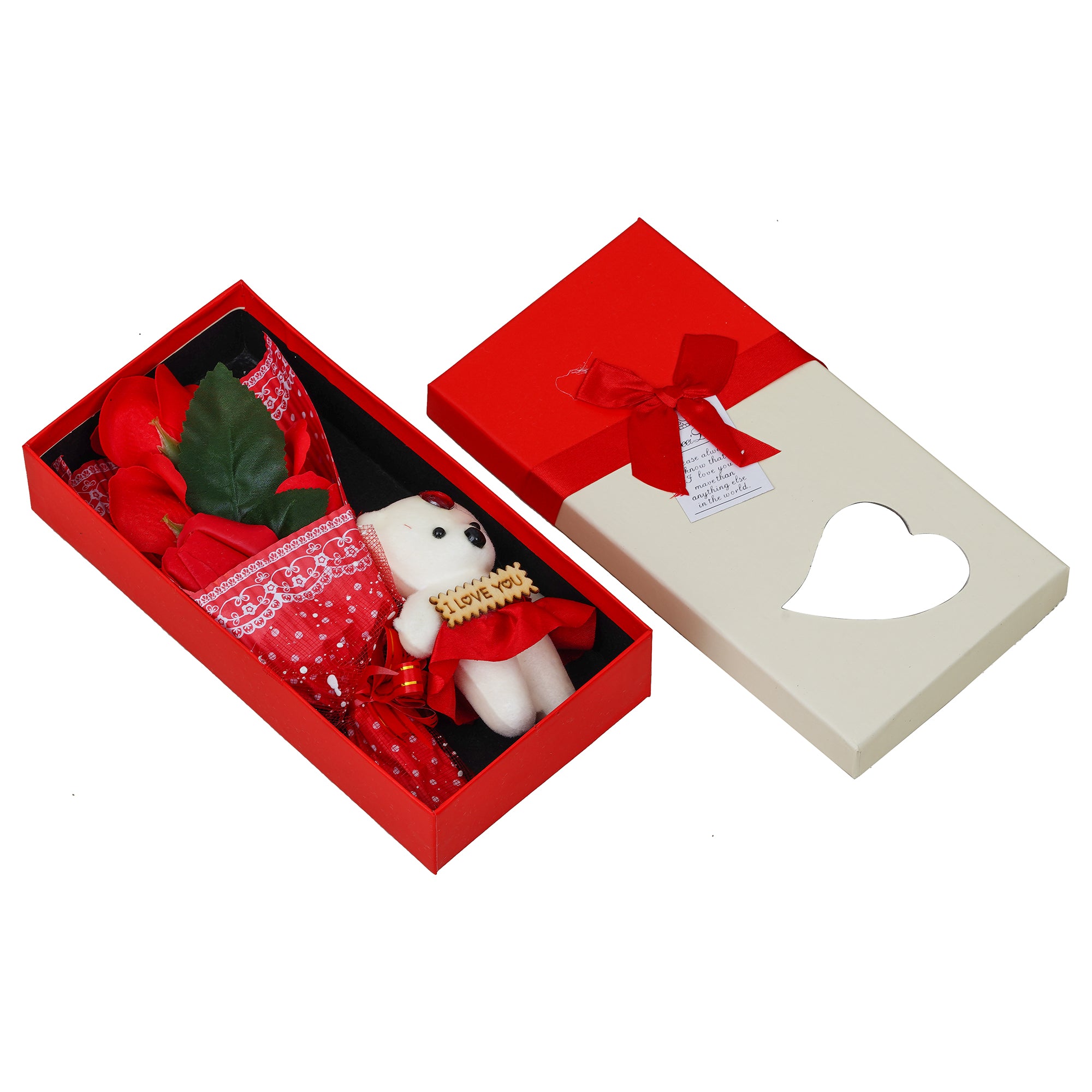 Package Content - One Red Roses Bouqet and White & Red Teddy Bear Valentine's Square Shaped Gift Box