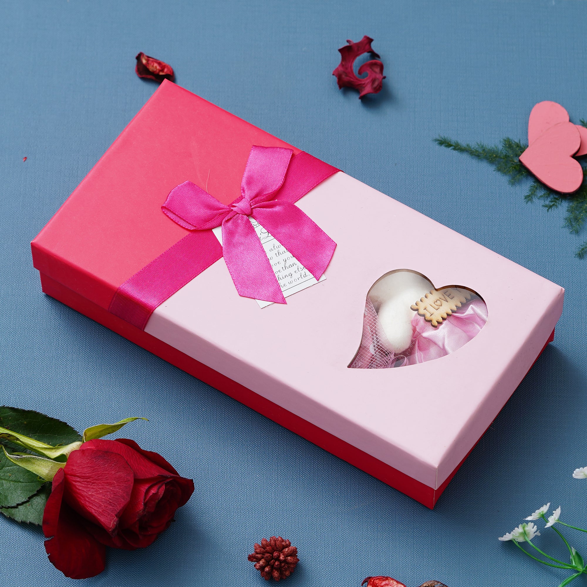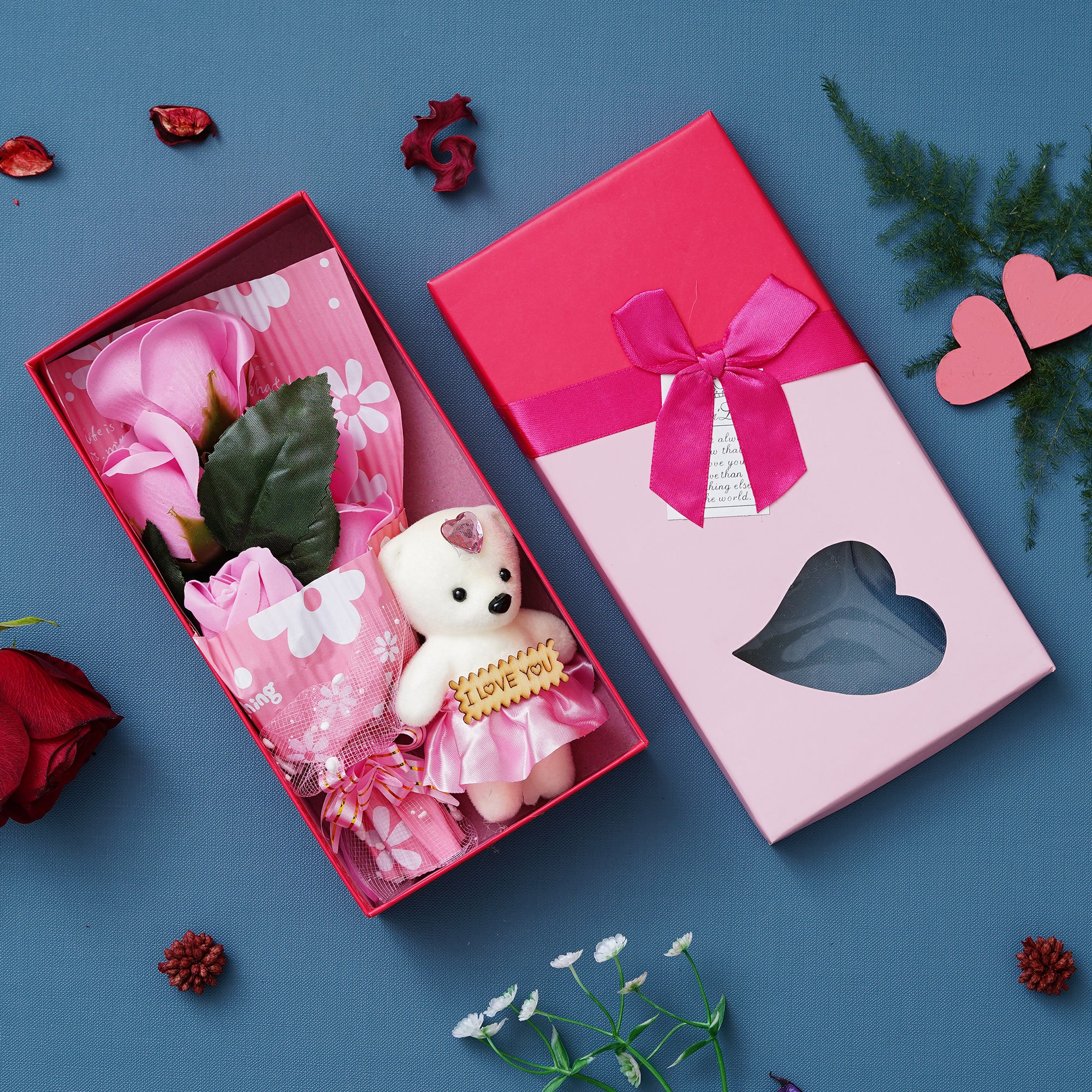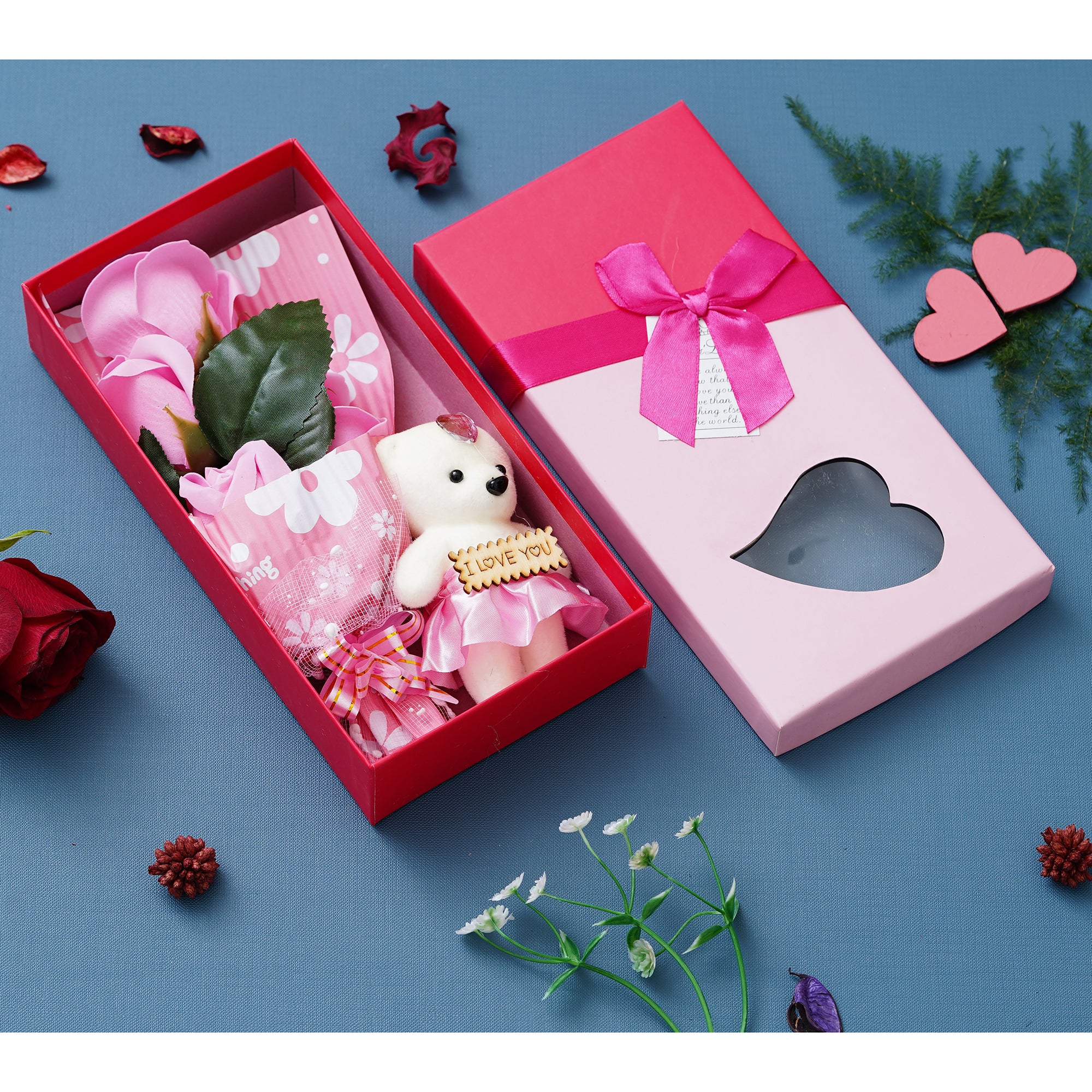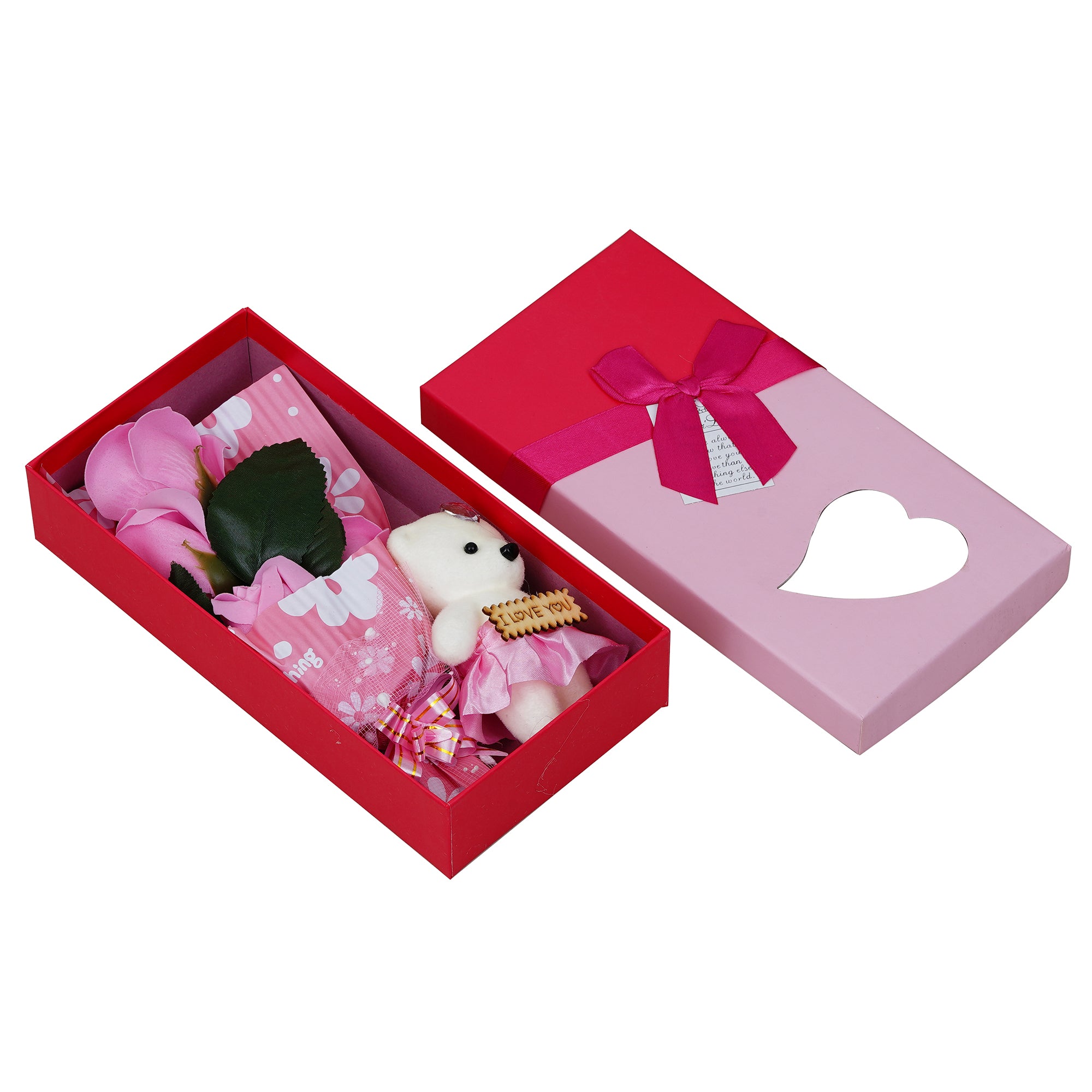 Package Content - One Pink Roses Bouqet with White & Pink Teddy Bear Valentine's Square Shaped Gift Box