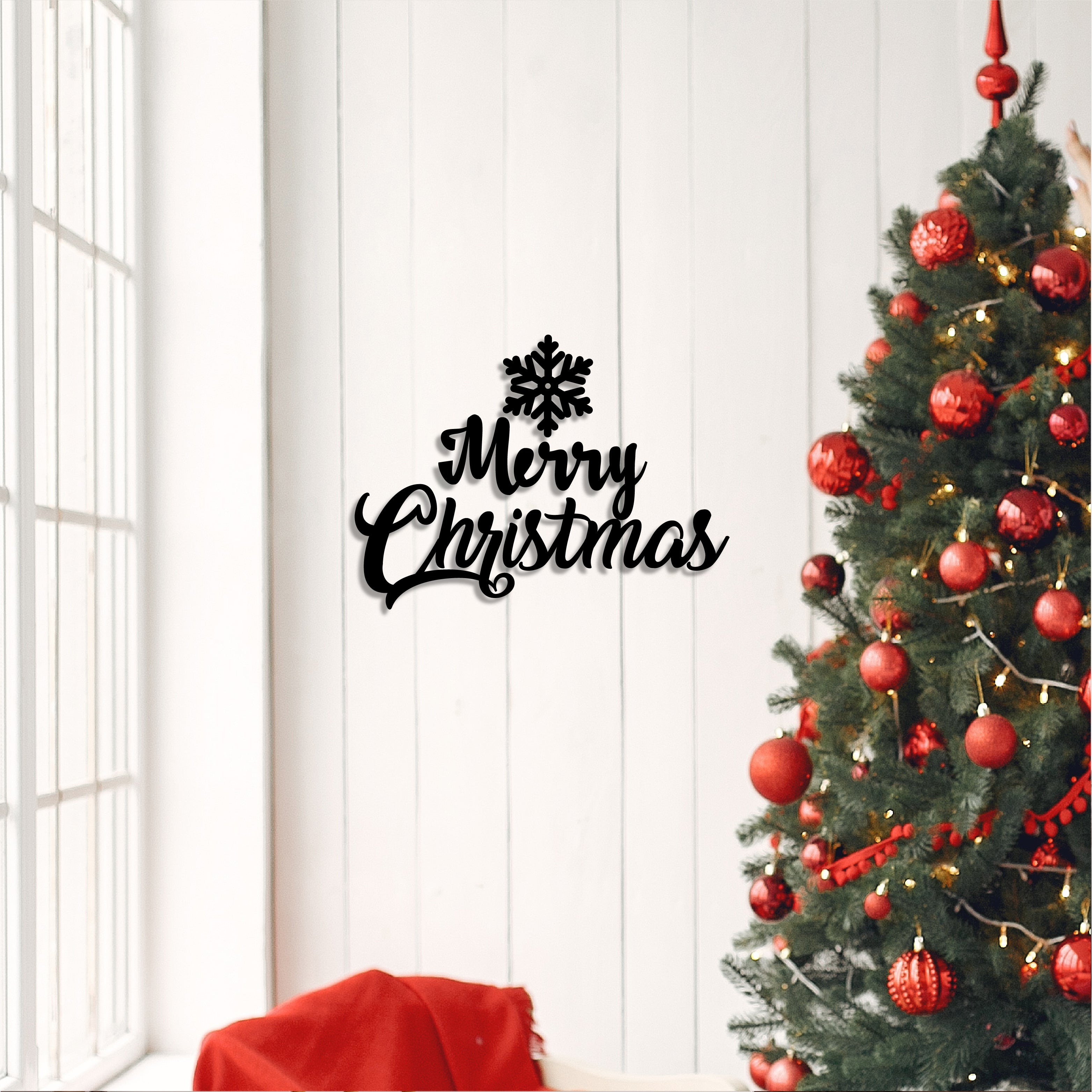 Package Content - One "Snow Flakes Merry Christmas" Black Engineered Wood Wall Art Cutout, Ready to Hang Home Decor
